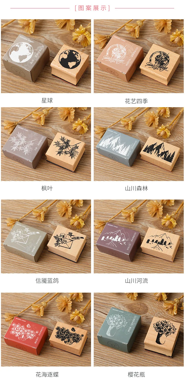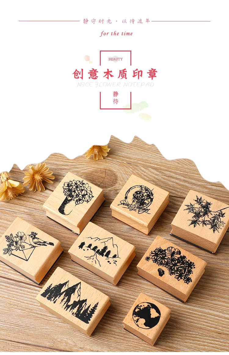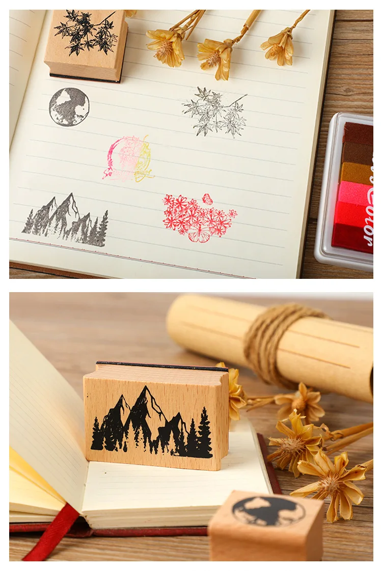 Деревянные и резиновые штампы для этикеток, винтажные, с цветами, горами, планетами, листьями, для скрапбукинга, дневника