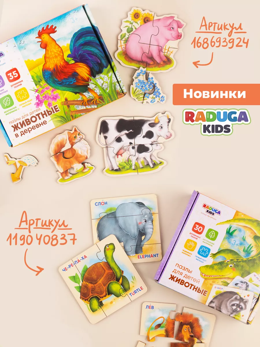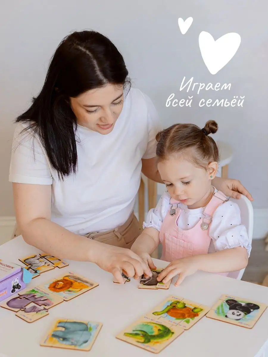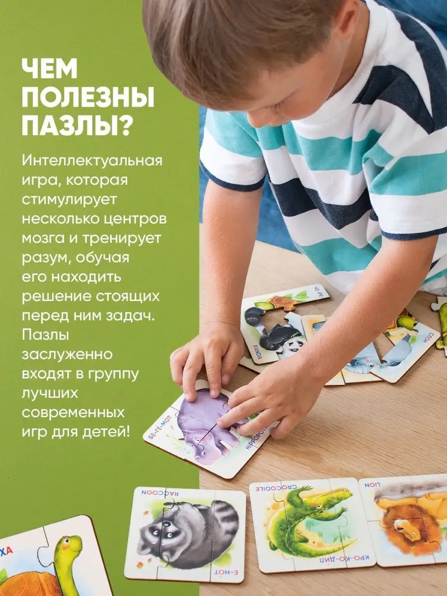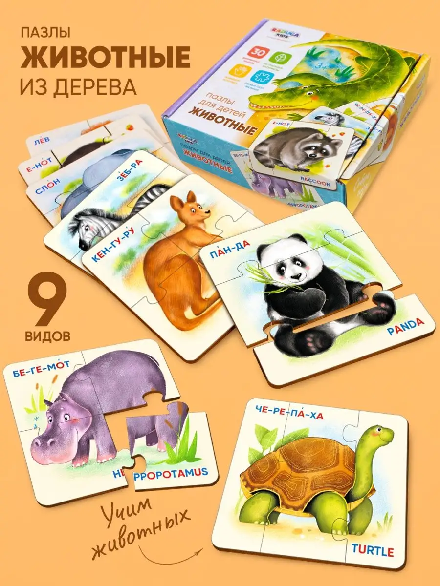 Описание: Развивающие игрушки для малышей пазлы "Животные Африки" от Raduga Kids. Набор пазлов состоит из 9 ярких иллюстраций, 30 деревянных деталей. Игровой набор прекрасно подходит для первого знакомства ребенка с пазлами. Фигурные пазлы способствуют формированию навыка соединения целого изображения из трех-четырех элементов. Игра с этими пазлами станет настоящим удовольствием для вашего ребенка. Макси пазлы имеют удобный размер, идеально подходящий для детской руки. Тактильные пазлы из дерева береза безопасны для детей от 1 года. Ребёнок не сможет порвать/помять детали в отличии от картонных. Пазлы вкладыши для малышей крупные для девочек и мальчиков развивают мелкую моторику рук, тренирует усидчивость, помогает развивать зрительное восприятие, тактильные функции, зрительную координацию, логическое и пространственное мышление. Развивающие игрушки от года по методике Монтессори развивают память и расширяют словарный запас. 1. Бейби пазлы для малышей - интересный подарок, знакомящий с цветами и понятиями, такими как часть/целое/назначение/больше-меньше. 2. Пазлы большие с перемешанными деталями развивают логическое мышление и мелкую моторику. Игра мемори "Найди лишнее" помогает определить, какое животное не принадлежит к африканской фауне. Развивает наблюдательность и логическое мышление. (Подсказка: это енот!) 3. Соберите пазлы вместе с ребенком, рассказывая о каждом животном и его особенностях. Обсудите, где они живут, что едят и какие звуки издают. Затем позвольте малышу самостоятельно собирать пазлы и отвечать на вопросы о месте обитания, пищевых привычках и звуках животных. Дарите только самые полезные подарки, которые будут развивать ваших детей и доставлять им удовольствие!
