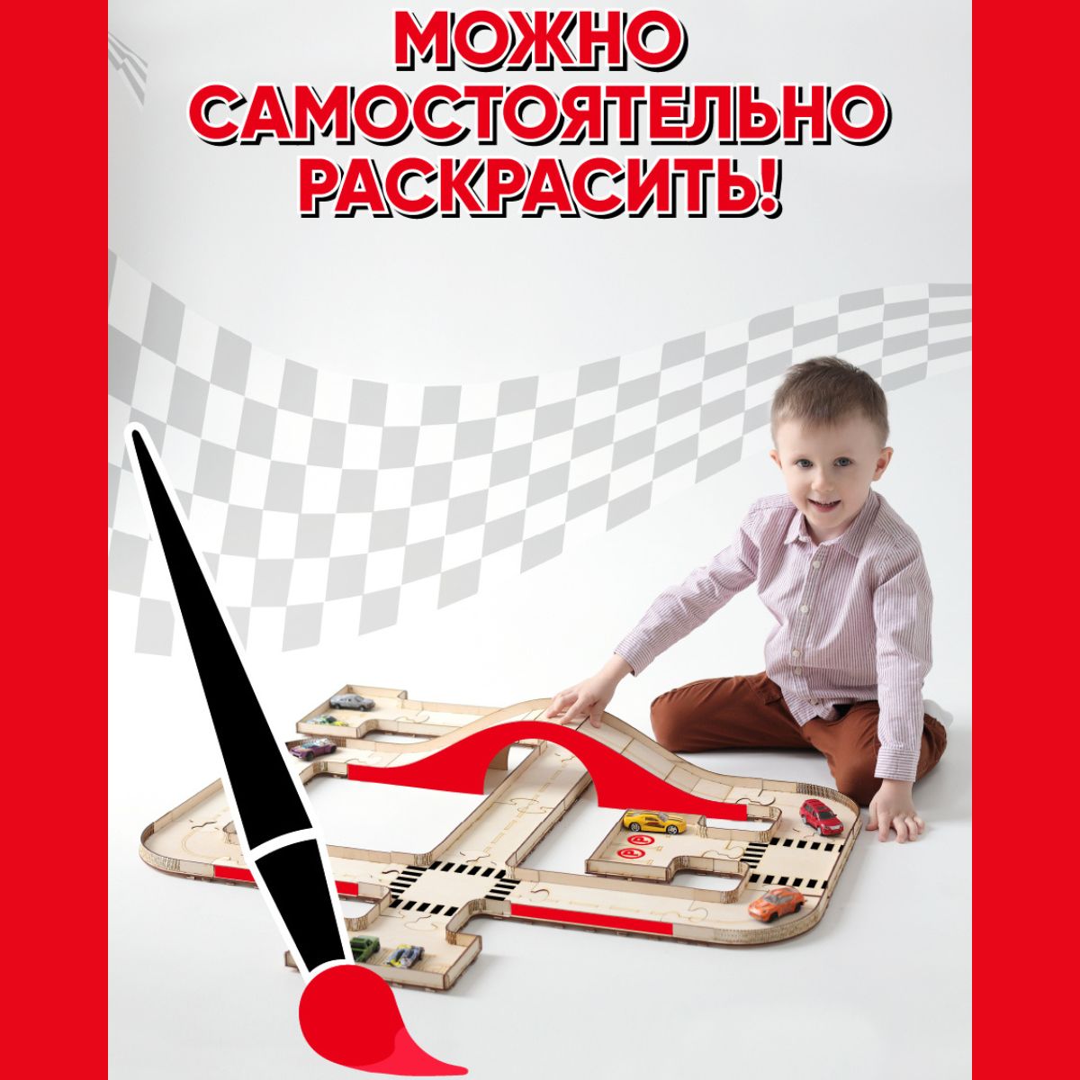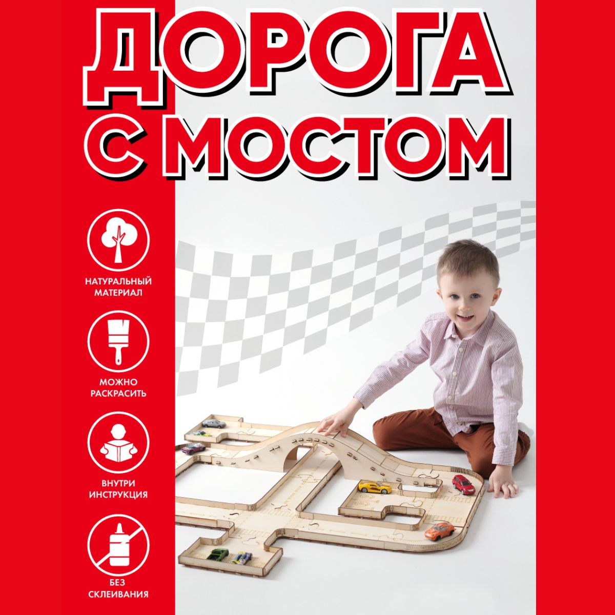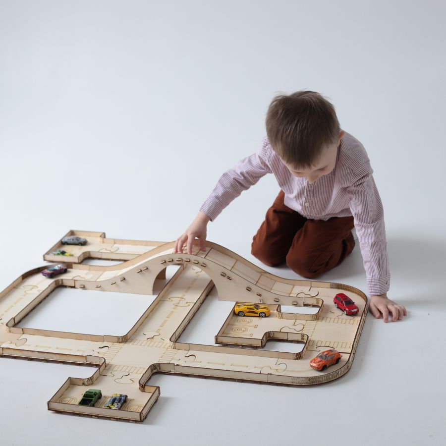 Описание: Трек для машинокДеревянная дорога выполнена в виде конструктора. Благодаря этому из деталей можно собирать разные маршруты автодороги. Это позволит ребенку развивать усидчивость, образное мышление, внимание и память. Перестраивая городские маршруты ребенок долго будет увлечен одной игрой.Параметры деревянной игрушкиДетская автомобильная дорога для машинок сделана из натурального материала – деревянной фанеры. Общая длина автотрека 3,2 м., ширина дороги - 9,5 см. На автомобильную дорогу разместятся маленькие и средние машинки. Трасса для машинок включает: саму дорогу с нанесенной разметкой, 3 городские автостоянки и мост. По периметру трассы устанавливается ограда. Ребенок сам сможет разукрасить свою игрушку и получить уникальную дорогу, которая есть только у него или оставить ее в том виде как она есть. Детская игра упакована в деревянную коробку.Порадуйте своего ребенка интересной игройДеревянный автотрек станет незабываемым подарком  для вашего ребенка. Он вовлечен его в игру, поможет отвлечь от гаджетов и обеспечит несколько часов тишины для отдыха родителей.