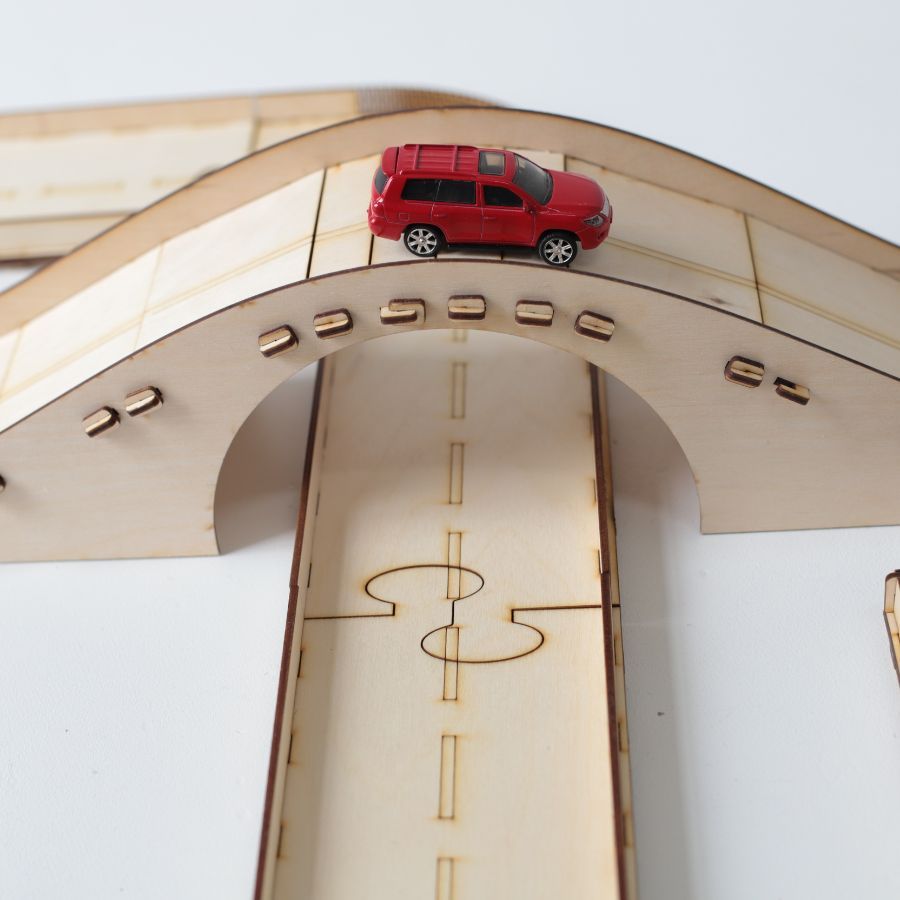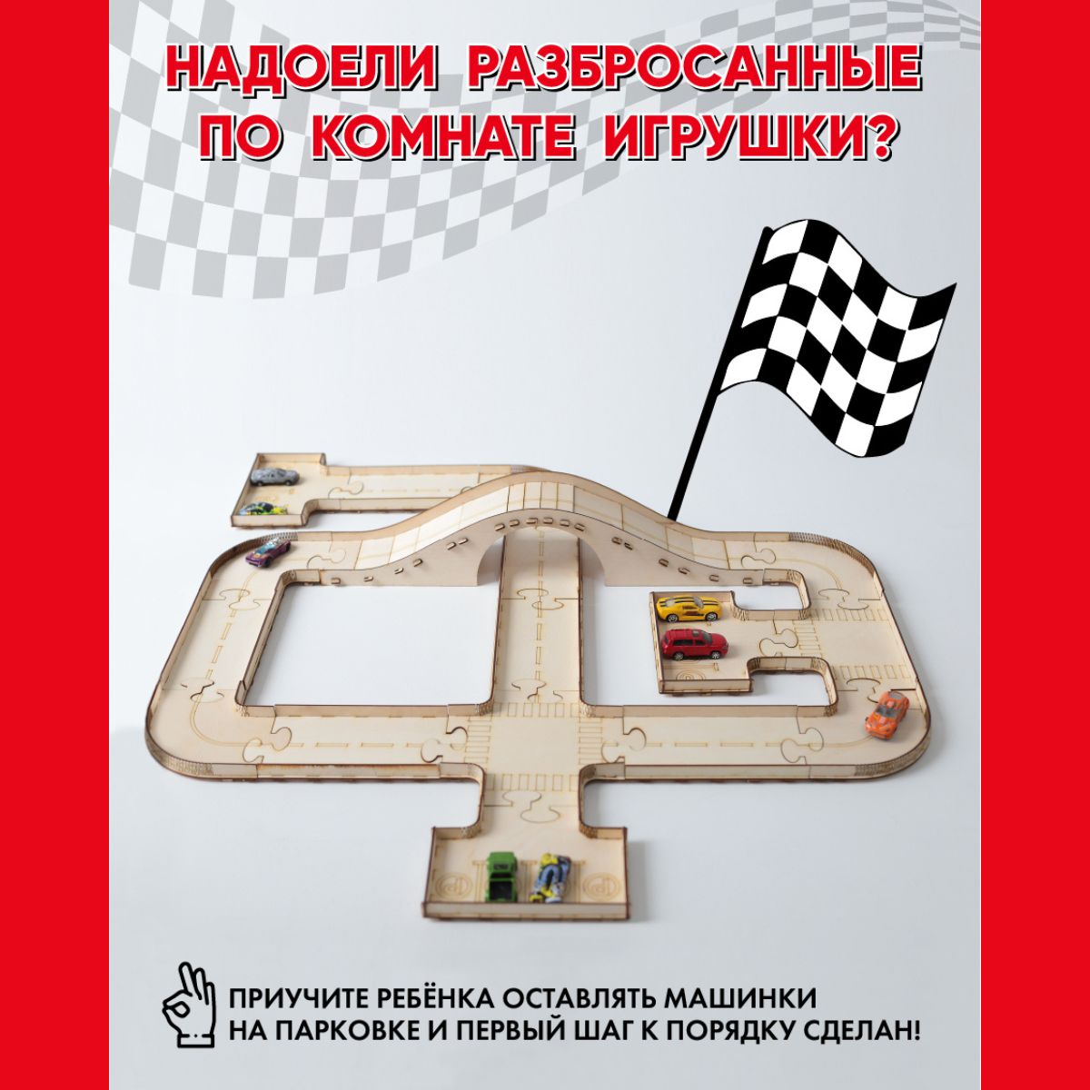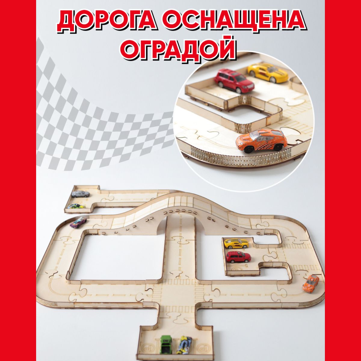 Деревянный автотрек / трасса для машинок с разметкой, мостом и автостоянками / STOLYARKA