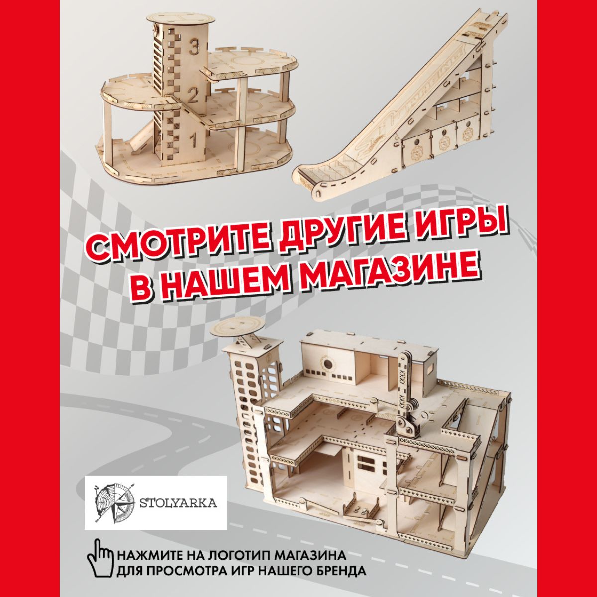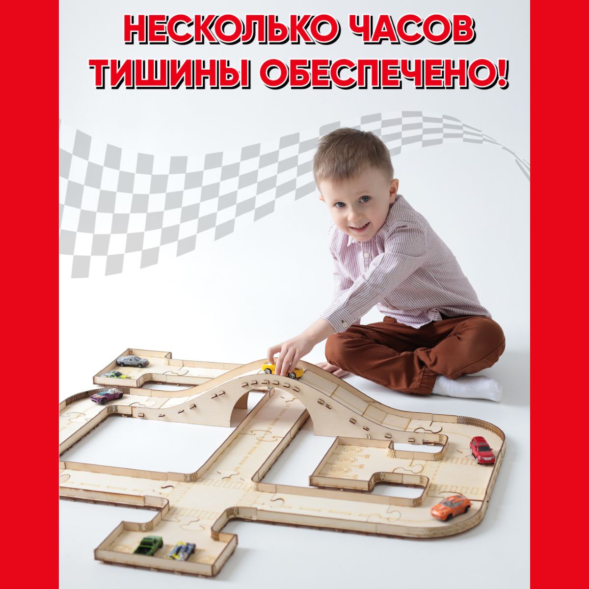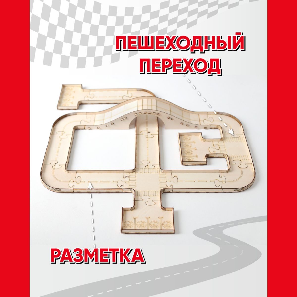 Деревянный автотрек / трасса для машинок с разметкой, мостом и автостоянками / STOLYARKA