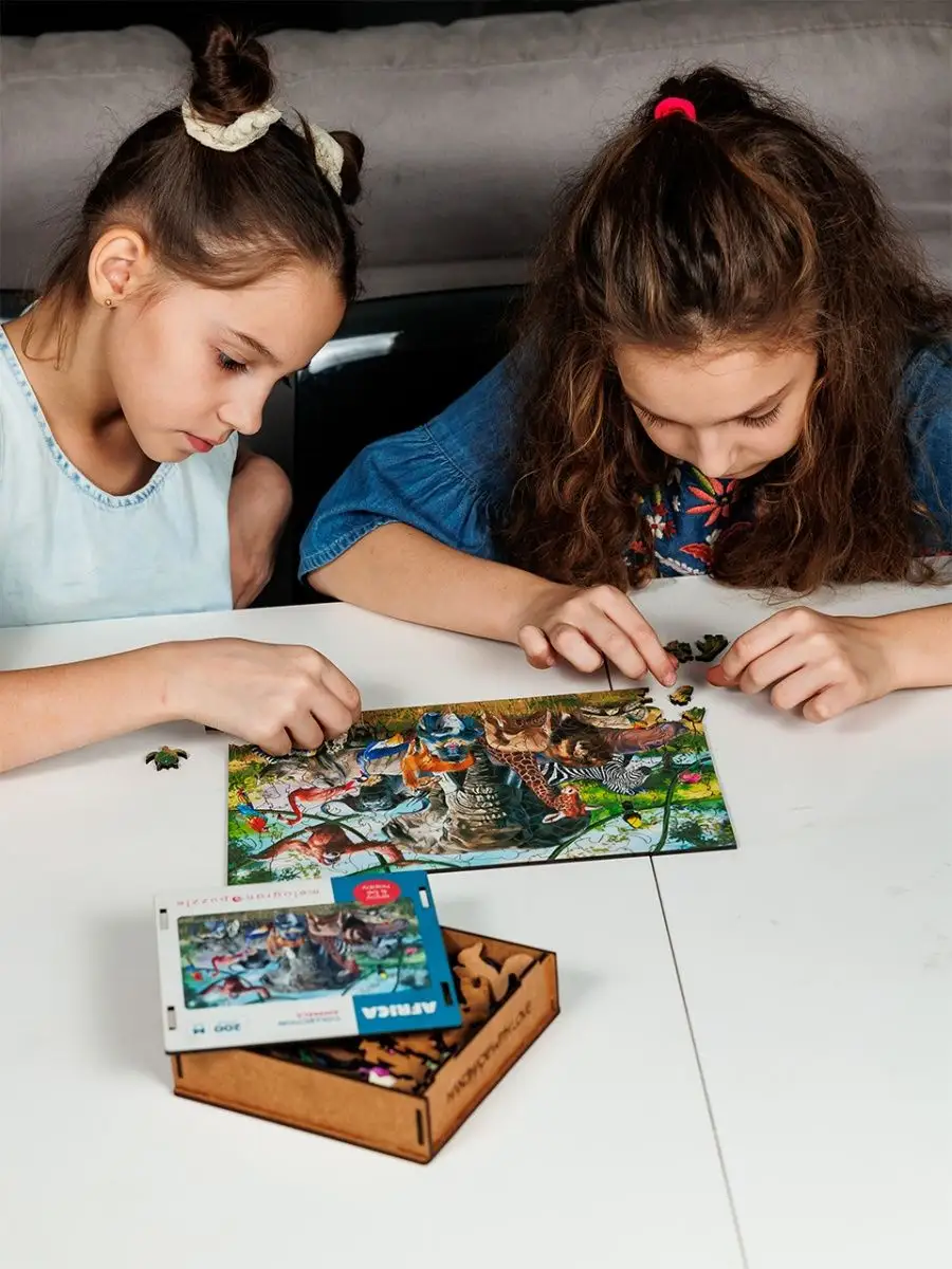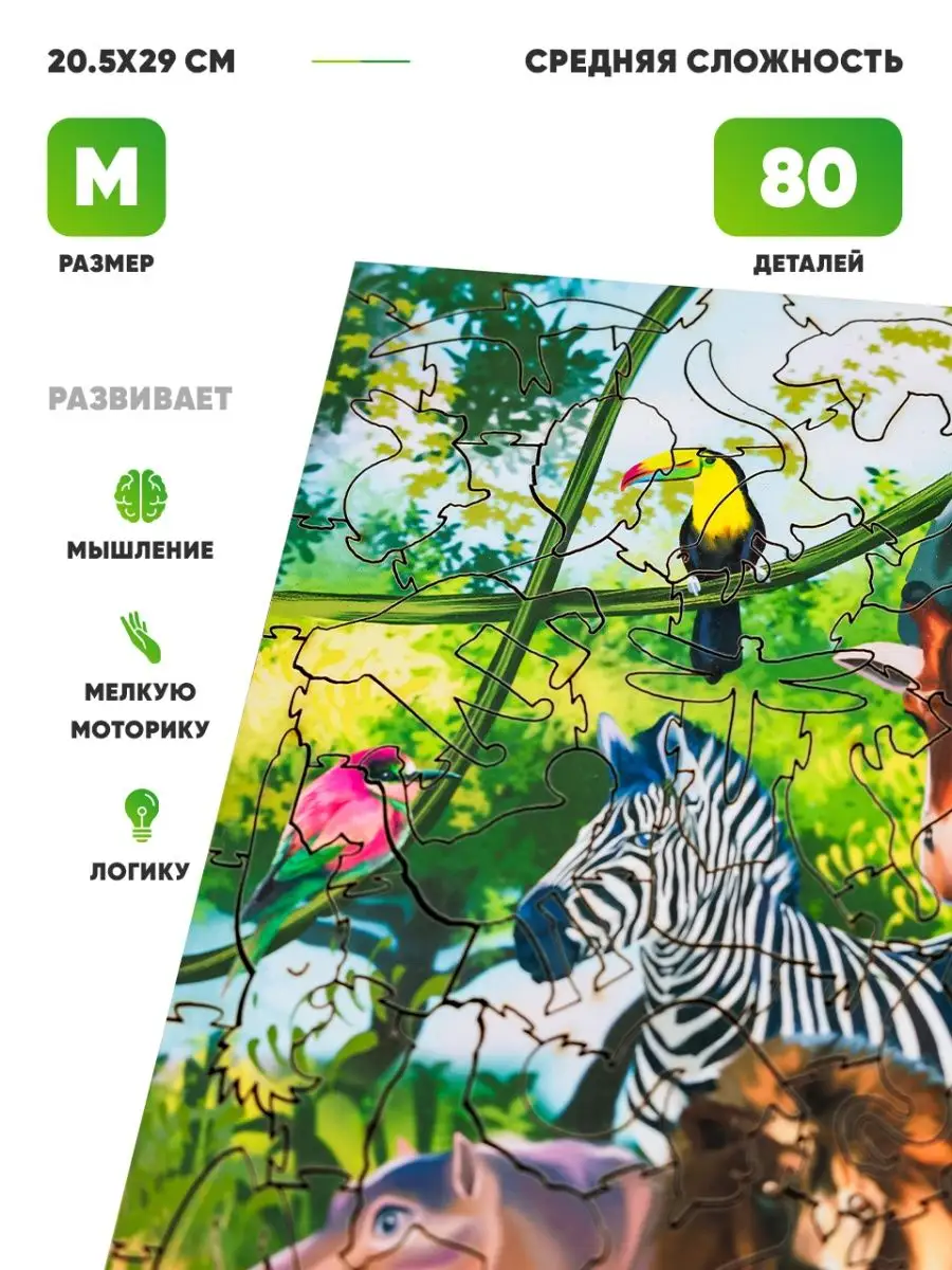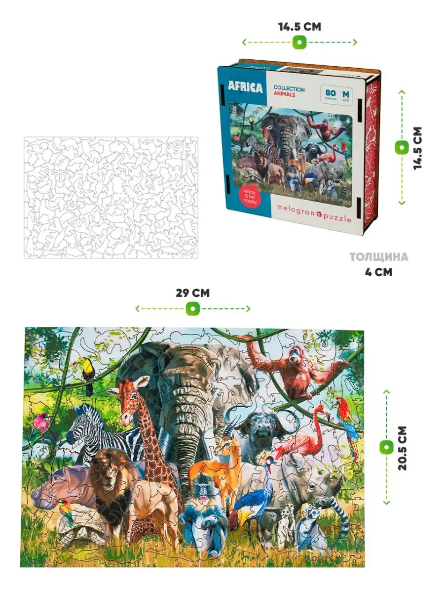 Описание: Деревянные пазлы для взрослых и детей Melоgrano puzzle (Мелограно пазл) — это прекрасные развивающие развлечения для девочек и мальчиков, а также антистресс и хобби для взрослых. Животные Африки М из 80 деталей, размер в сборе 20,5х29 см.Средний размер фигурных деталей 2-3 см, и они приятные на ощупь. Из-за особенностей производства, вырезания на лазерном станке, пазл приобретает легкий аромат опалённого дерева. Деревянные пазлы на 100% экологичны и безопасны. Материалы, из которого они изготавливаются: ХДФ (древесноволокнистая плита высокой плотности), бумага, УФ-отверждаемые чернила. Клей в пазлах и коробочке не используется. Коробочка для пазлов собирается вручную, путем установки одной детали в другую. Наши пазлы сертифицированы для детей от 3х лет, но, мы рекомендуем самостоятельную сборку пазлов детям от 7 лет, а до этого возраста предлагаем собирать детям и взрослым вместе, помогая друг другу. Деревянные пазлы для детей развивают память и внимание, мелкую моторику, творческое и логическое мышление, и воображение! Взрослым они помогут перезагрузиться после рабочего дня и дадут хорошее настроение! Пазл из дерева в деревянной коробке — это оригинальный и интересный сюрприз близким и родным.