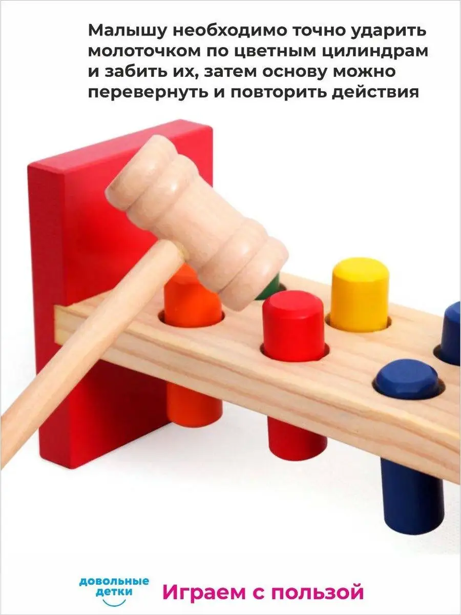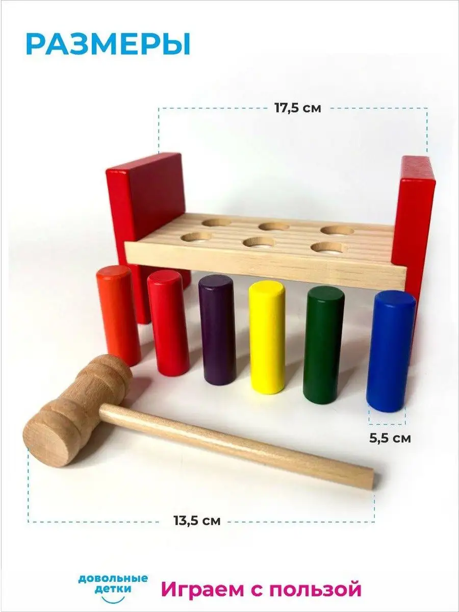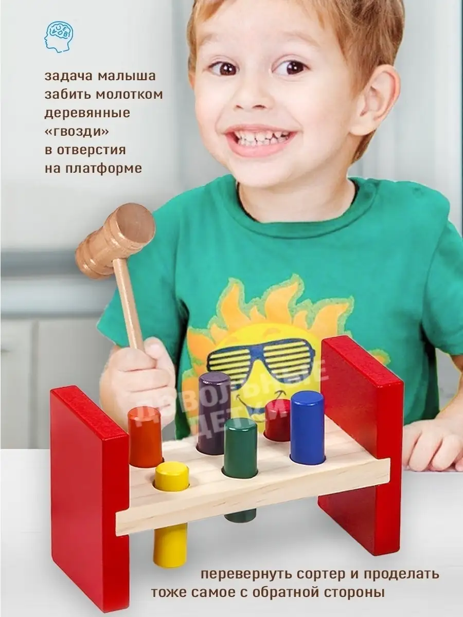 Комплектация Сортер стучалка с колышками; Деревянный сортер для малышей по системе Монтессори; Игрушка деревянная стучалка - 1шт.; сортер деревянный Стучалка с молотком - 1шт.; Развивающий сортер для малышей Стучалка
