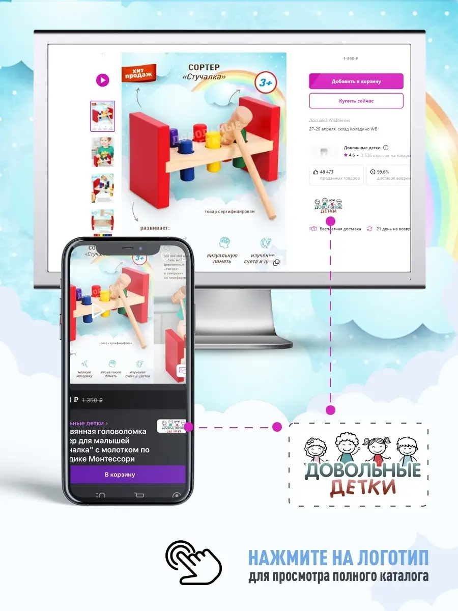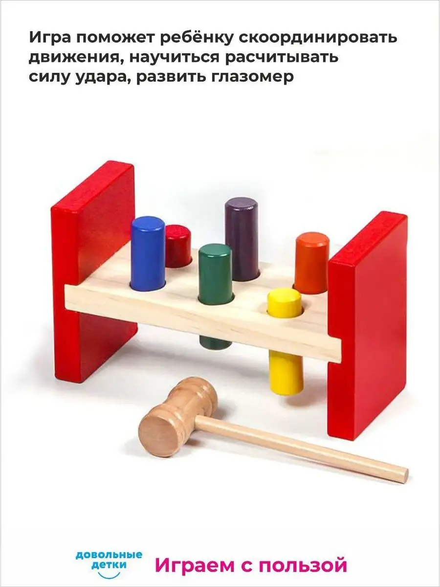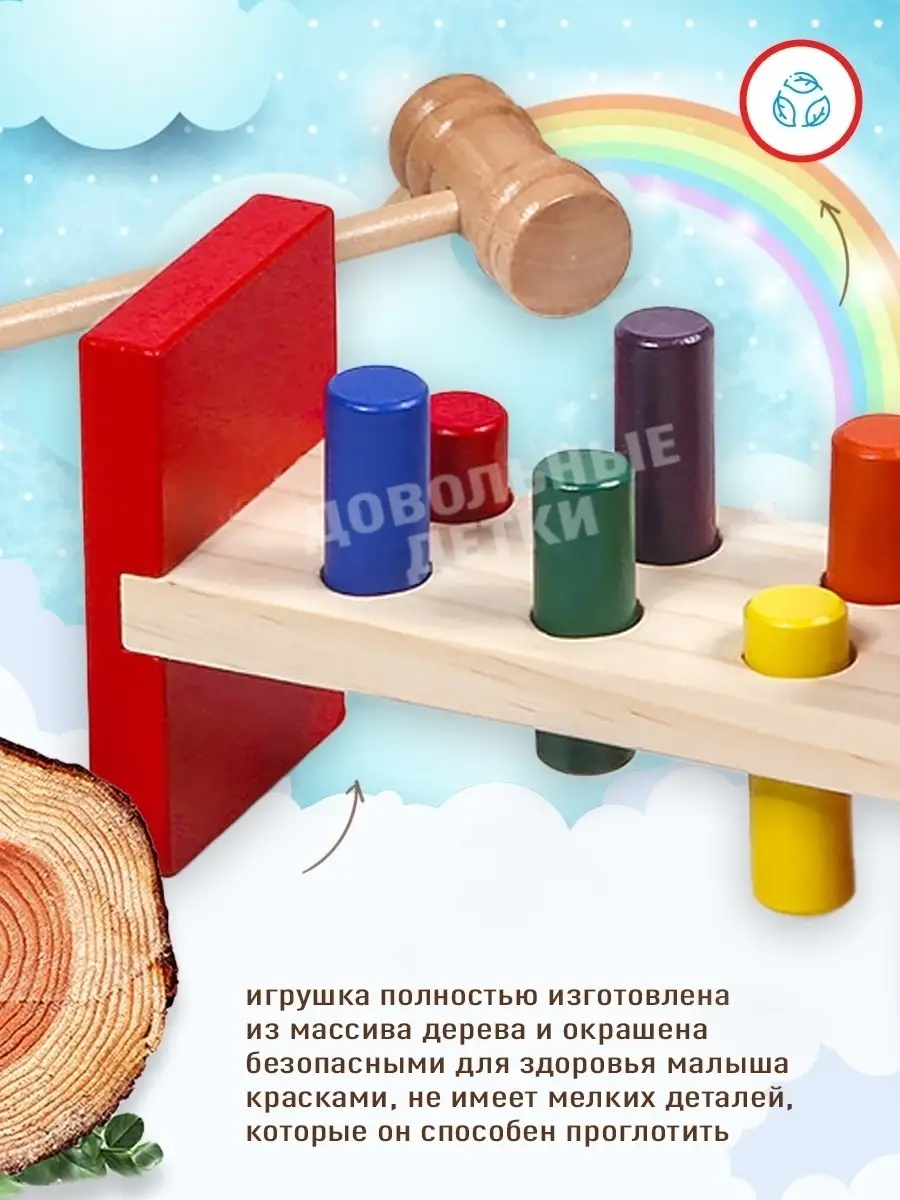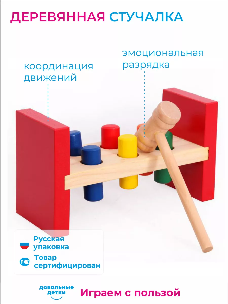 Комплектация Сортер стучалка с колышками; Деревянный сортер для малышей по системе Монтессори; Игрушка деревянная стучалка - 1шт.; сортер деревянный Стучалка с молотком - 1шт.; Развивающий сортер для малышей Стучалка