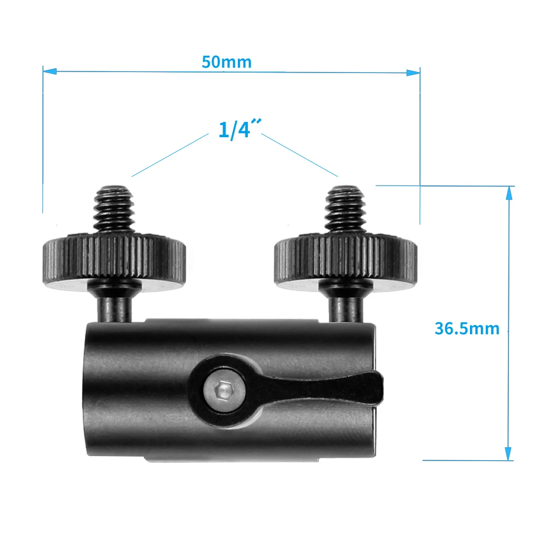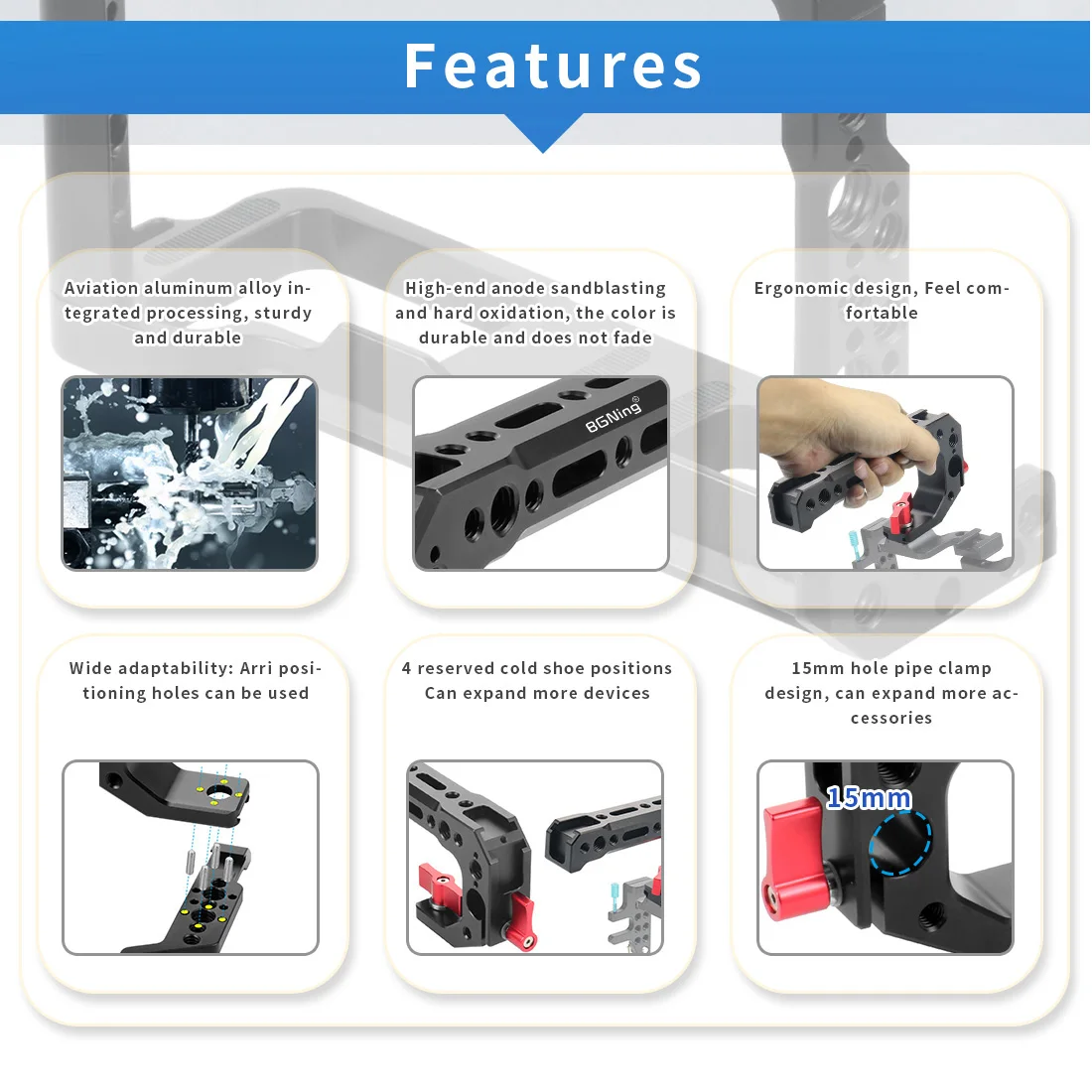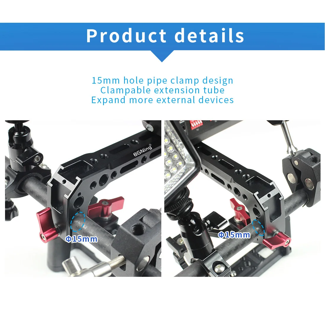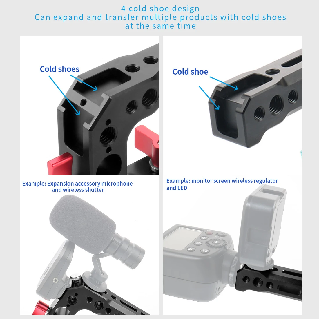 Эта верхняя ручка с зажимом стержня 15 мм оснащена множеством резьбовых отверстий 1/4 ''и 3/8'' для выбора DIY на верхней ручке, И они могут прикрепить короткие волшебные руки для беспроводных видеопередатчиков. Холодный башмак на верхней ручке может прикрепить микрофон или прикрепить двойную шаровую головку для беспроводных видеопередатчиков для съемки и передачи сигнала. Удерживающие детали можно отрегулировать с помощью винтов на 100 мм, чтобы достичь баланса, а также удобно прикрепить другие устройства. 15 мм одиночный зажим может прикрепить стержень 15 мм, к которому можно прикрепить крепление для микрофона или мини-монтажную пластину для монитора. 3x сиденья для холодной обуви могут прикрепить голосовой приемник. Зажим для поиска Arri может прикрепить адаптер и волшебные руки с контактами Arri.