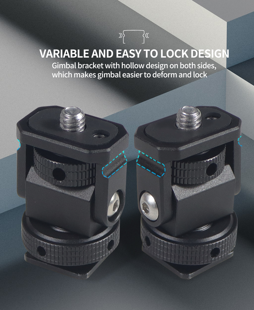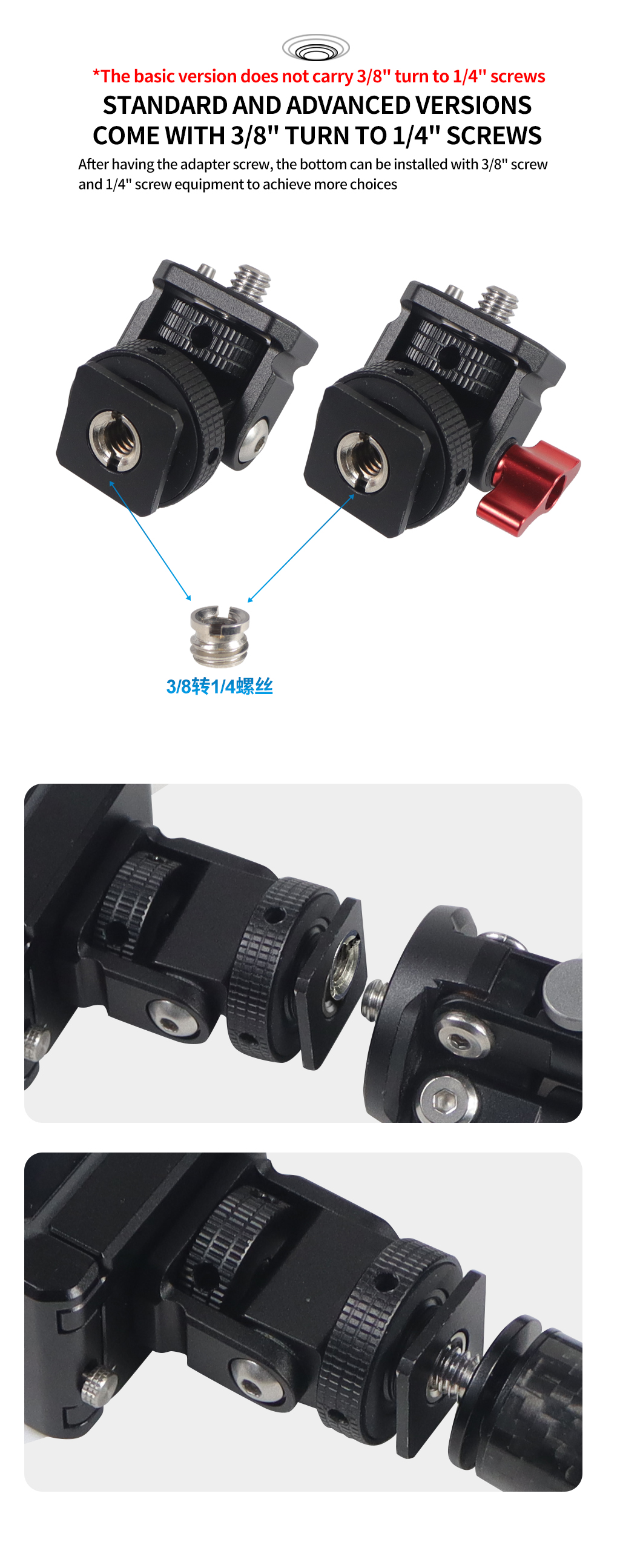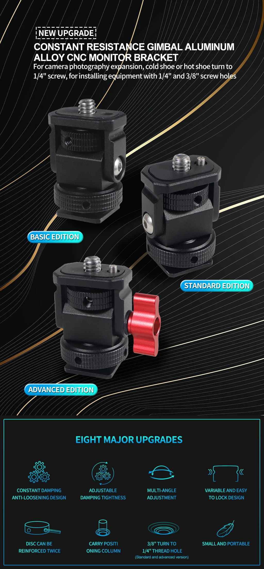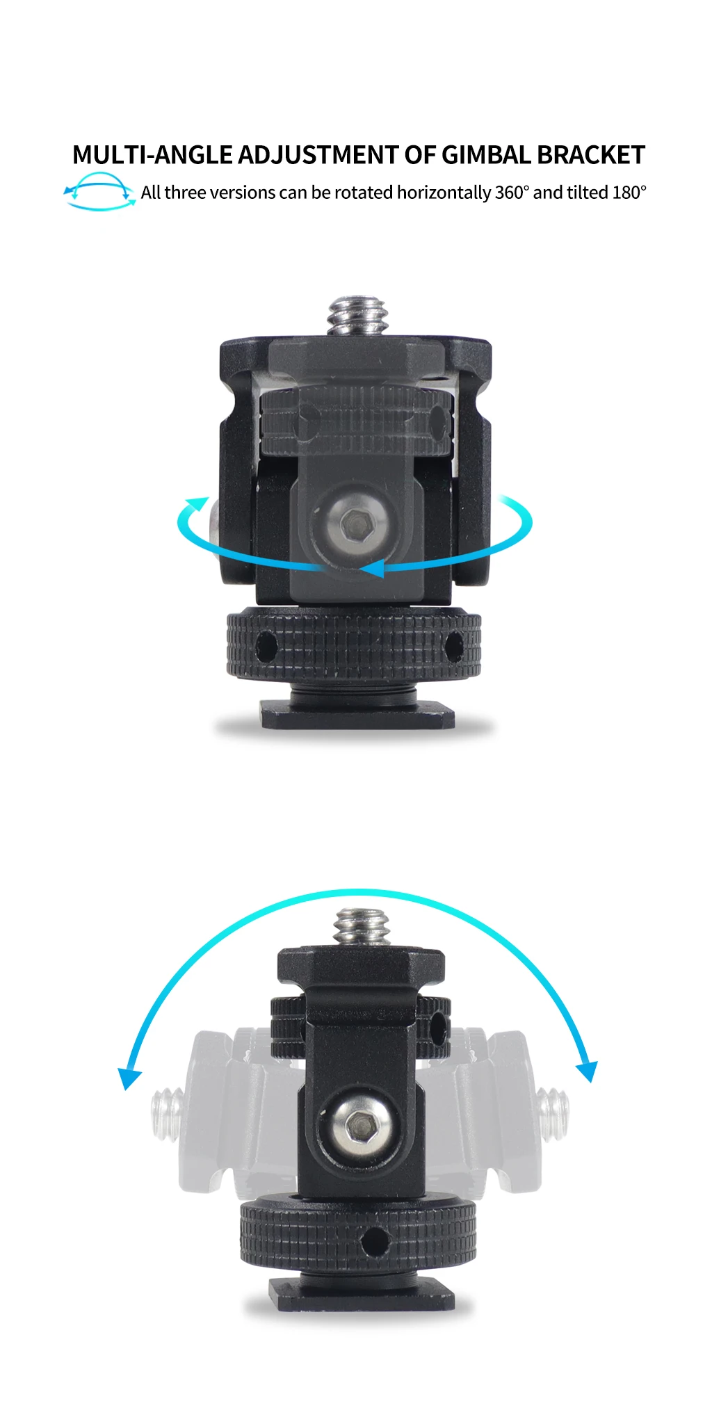 Новое регулируемое поворотное и наклонное крепление для монитора с креплением для холодного башмака предназначено для удержания монитора на верхней части камеры или другой системы крепления с помощью адаптера для холодного башмака. Он оснащен винтом 1/4 "-20" сверху для монитора, светильник или микрофона. Держатель позволяет поворачиваться 360 ° вбок и наклоняться 180 ° со свободным упором в любом положении. Дно с 3/8 "резьбовым отверстием может быть установлено и соединено с 3/8" винтовыми устройствами или 1/4 "винтовыми устройствами с преобразователем. Затяжка каждой оси регулируется с помощью шестигранного ключа. Мини-размер, легкий вес всего 33 г. Крепление монитора изготовлена из алюминия, обработанного на станке с ЧПУ, и может поддерживать монитор от 5 до 7 дюймов весом до 2,5 кг. Поворотное и наклонное крепление имеет защитную резиновую прокладку сверху и включает шестигранный ключ для затягивания креплений для дополнительной безопасности.