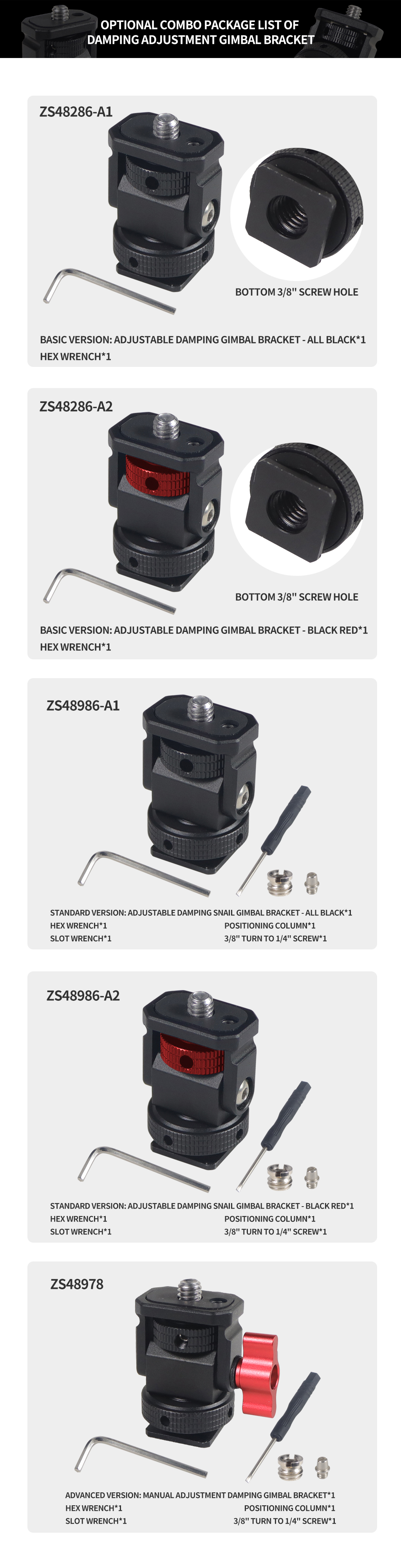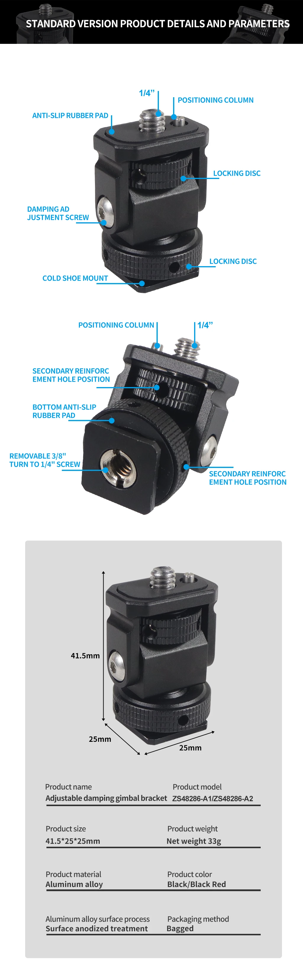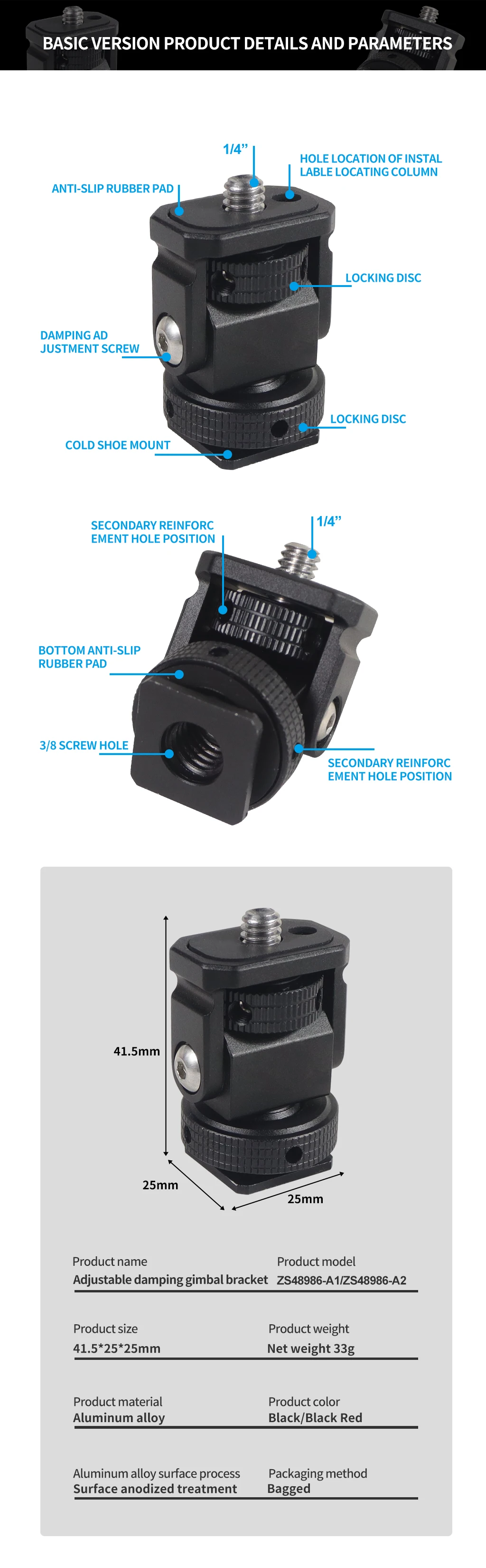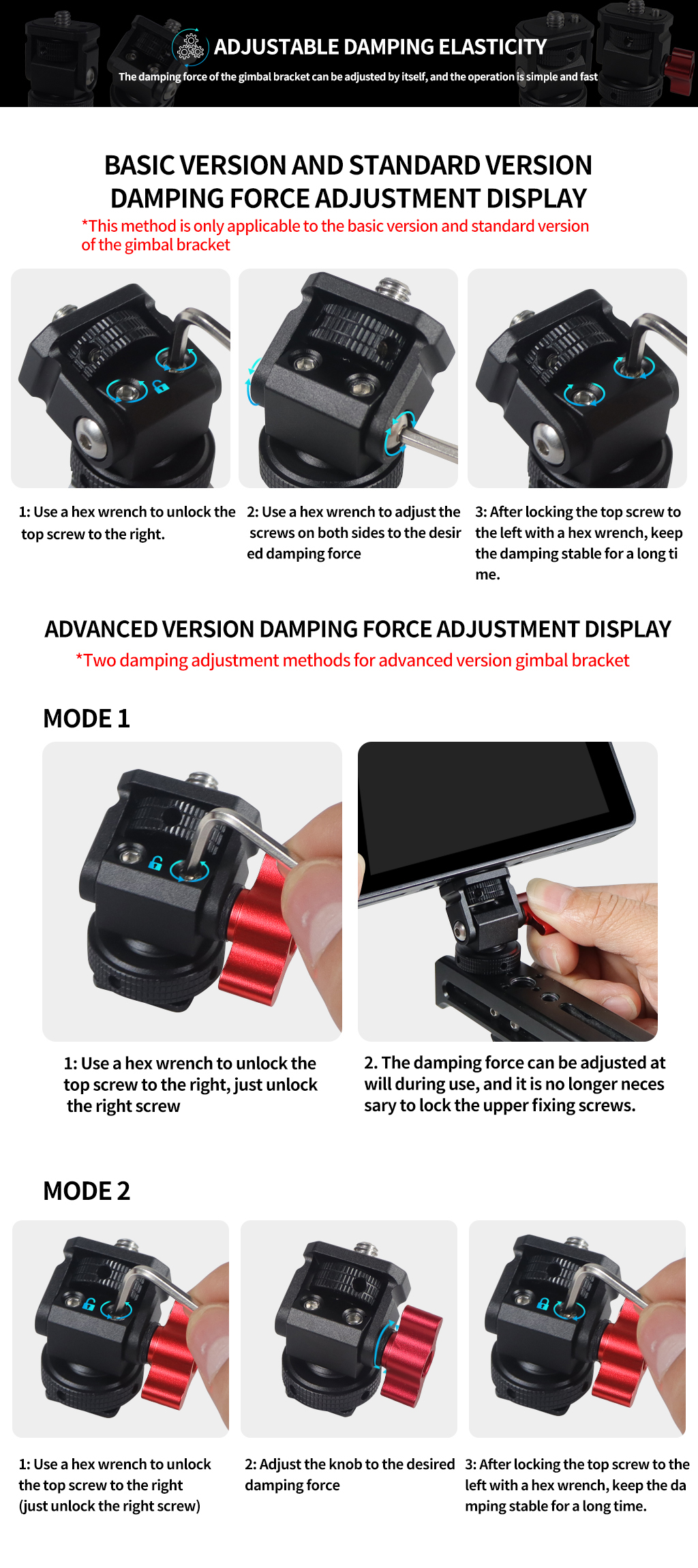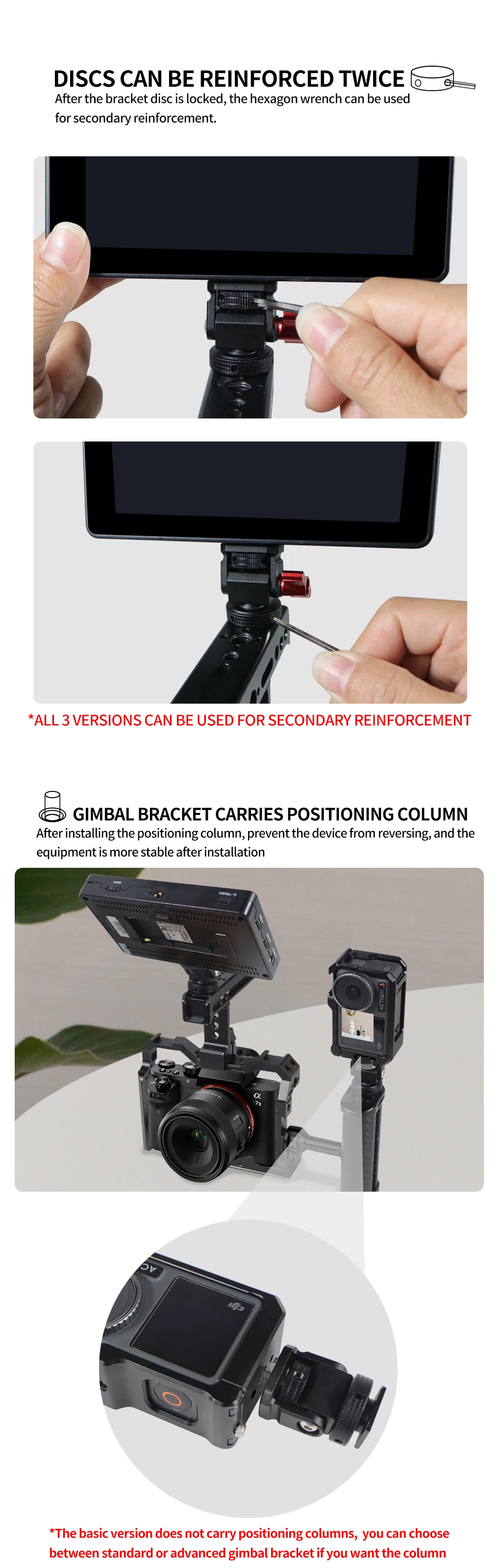 Новое регулируемое поворотное и наклонное крепление для монитора с креплением для холодного башмака предназначено для удержания монитора на верхней части камеры или другой системы крепления с помощью адаптера для холодного башмака. Он оснащен винтом 1/4 "-20" сверху для монитора, светильник или микрофона. Держатель позволяет поворачиваться 360 ° вбок и наклоняться 180 ° со свободным упором в любом положении. Дно с 3/8 "резьбовым отверстием может быть установлено и соединено с 3/8" винтовыми устройствами или 1/4 "винтовыми устройствами с преобразователем. Затяжка каждой оси регулируется с помощью шестигранного ключа. Мини-размер, легкий вес всего 33 г. Крепление монитора изготовлена из алюминия, обработанного на станке с ЧПУ, и может поддерживать монитор от 5 до 7 дюймов весом до 2,5 кг. Поворотное и наклонное крепление имеет защитную резиновую прокладку сверху и включает шестигранный ключ для затягивания креплений для дополнительной безопасности.