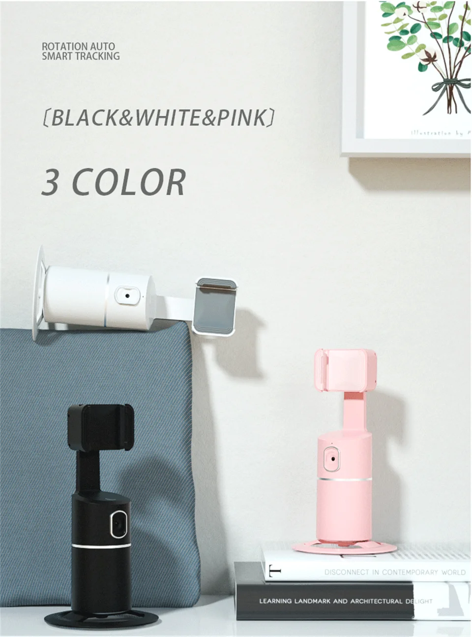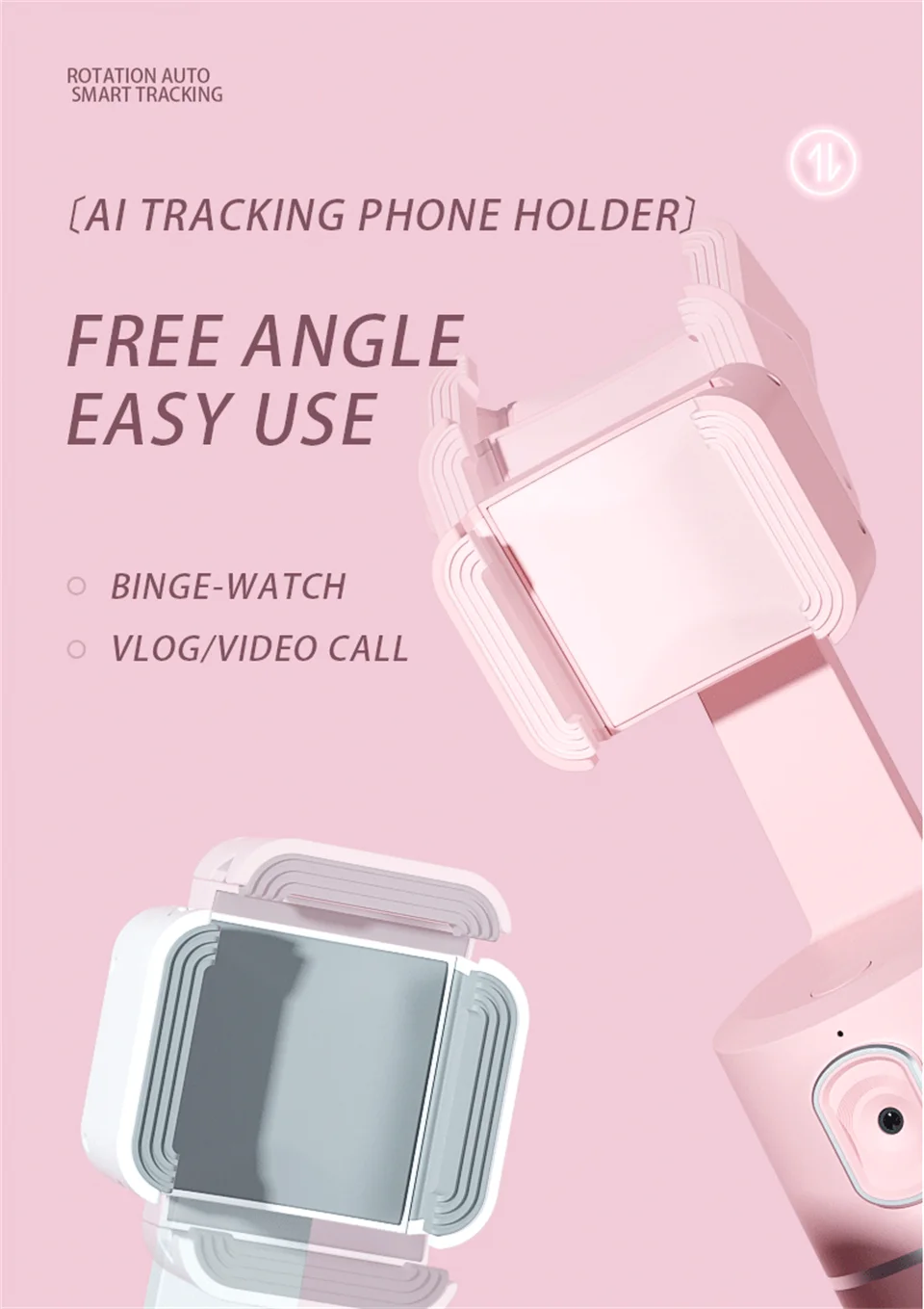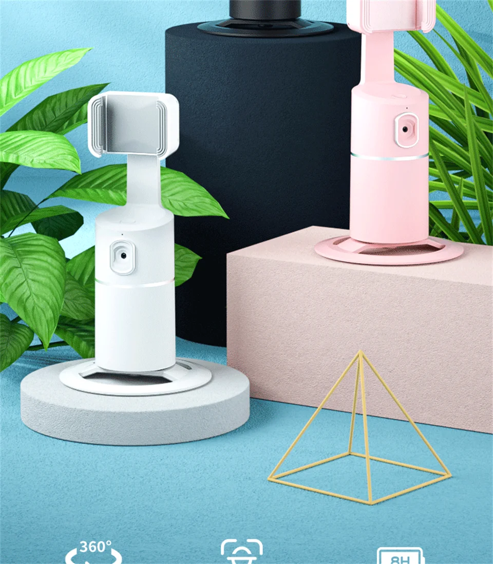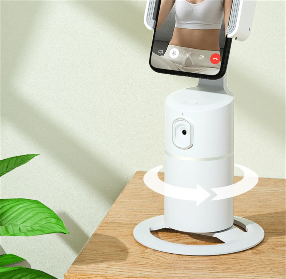 Освободите ваши руки- Просто нажмите и удерживайте кнопку питания в течение 3 секунд, чтобы включить этот Интеллектуальный держатель телефона, он автоматически выполнит Обнаружение вращения за 3 секунды, затем объектив будет вращаться на 360 ° по горизонтали, чтобы запечатлеть каждое ваше выражение и движение, постоянно удерживая вас в центральном положении. Вы также можете поставить телефон на подставку, чтобы наслаждаться просмотром видео, вместо того, чтобы держать телефон руками.