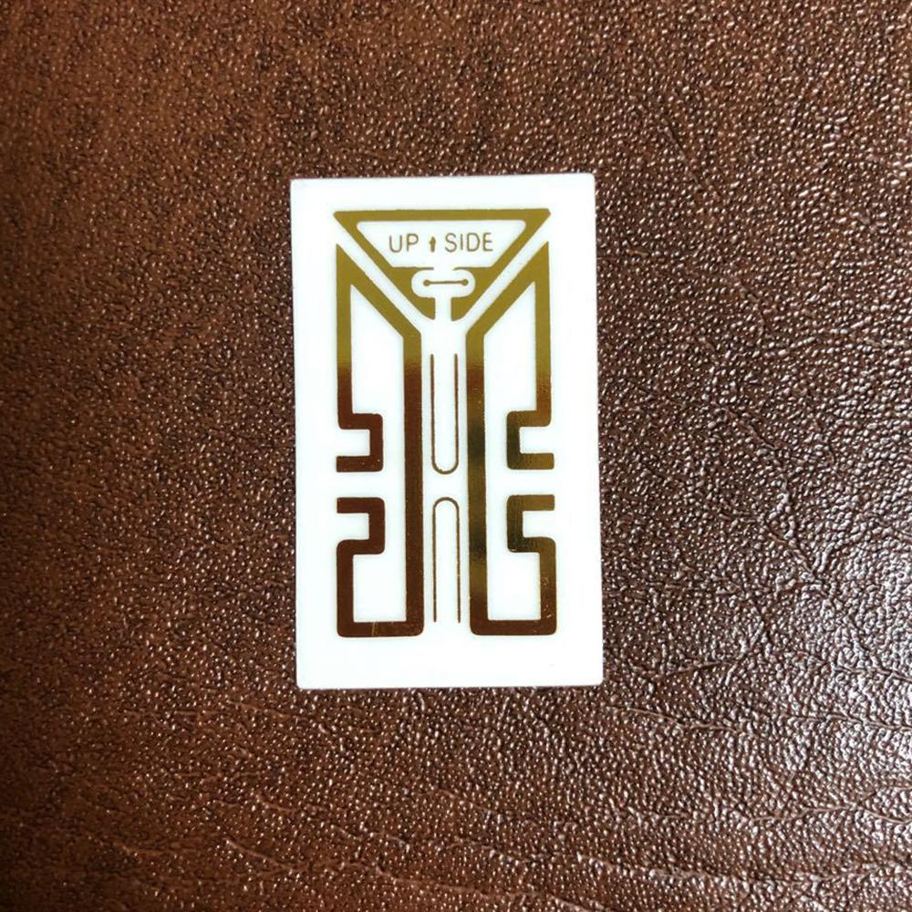 2. Оторвите белую клейкую ленту за сигнальной наклейкой и приклейте вертикально к задней части мобильного телефона, так чтобы английские буквы и стрелки были обращены вверх (если на задней части мобильного телефона есть пленка, его нужно порвать, иначе эффекта нет);