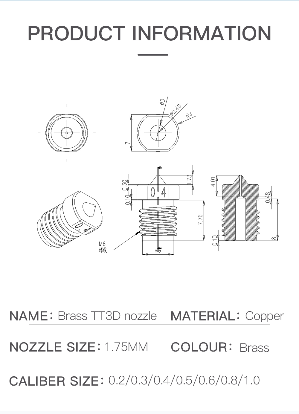 Детали для 3D-принтера, латунная сопла TT3D, сопло M6, резьба 0,2-0,8 мм для 1,75 мм PLA ABS нити, J-head Hotend, детали экструдера