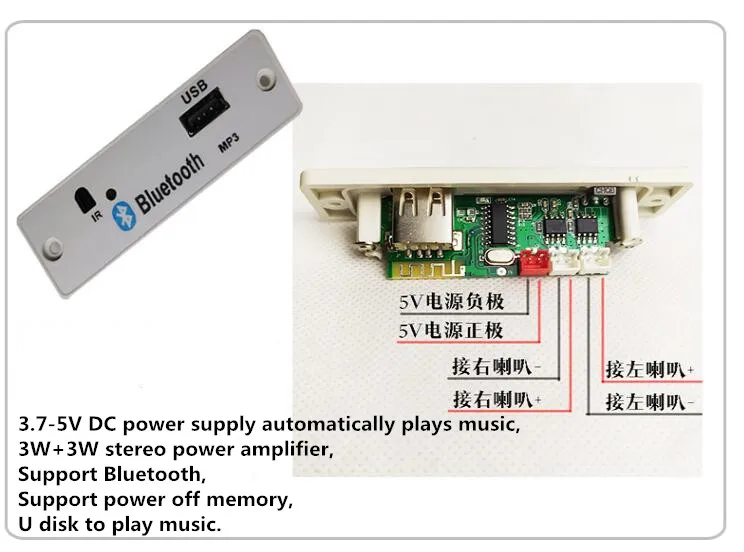 Функция: 3,7-5V DC источника питания, чтобы автоматически воспроизводить музыку, 3 Вт + 3 Вт стерео усилитель мощности, поддержка Bluetooth, поддержка отключения памяти, U диск для воспроизведения музыки, может питаться от внешнего аккумулятора.