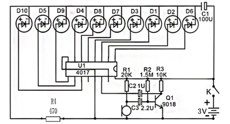Схема, схема усилителя микрофона, светодиодный светильник, схема индикатора составлена, и блок питания принимает две батареи. Микрофон преобразует звуковой сигнал в электрический сигнал, который соединен с Q1 через C2 для усиления, и усиленный сигнал отправляется U1. U1 толкает светодиодный светильник. Чем громче звук, тем выше яркость светодиодный, тем быстрее поток воды.