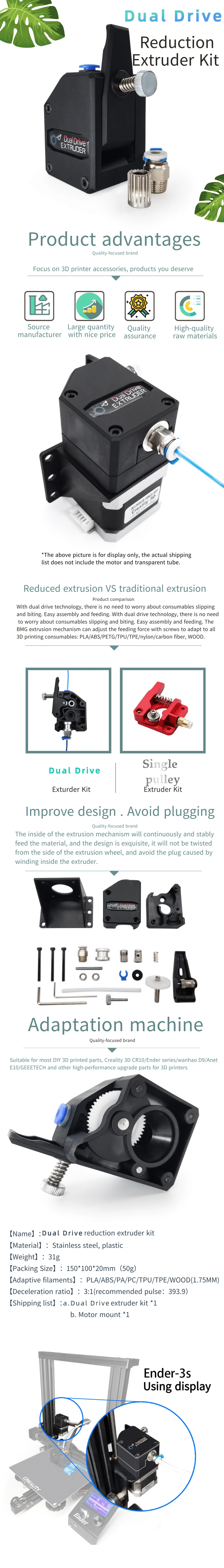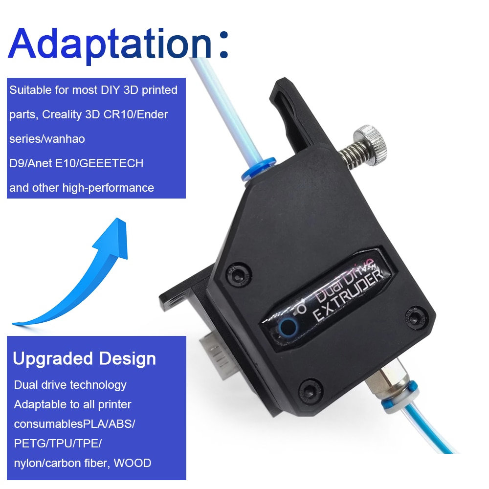 Благодаря технологии двойного привода нет необходимости беспокоиться о том, что расходные материалы соскальзывают и кусают. Простая сборка и подача. Благодаря технологии двойного привода нет необходимости беспокоиться о том, что расходные материалы соскальзывают и кусают. Простая сборка и подача. Экструзионный механизм двойного привода может регулировать подающую силу с помощью винтов, чтобы адаптироваться ко всем расходам для 3d-печати: PLA/ABS/PETG/TPU/TPE/нейлон/углеродное волокно, дерево.