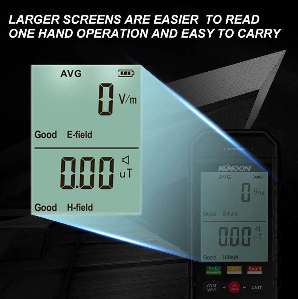 Radiation assessment function, which can indicating if current radiation value is at safety level, three color light indicating the current magnetic field states: safe, alart, avoid, and if the electric field data over the safety state, the screen will become red to alarm you.