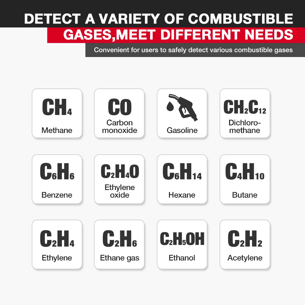 Test Gas (неполный список): ацетон, ацетилен, спирт, аммиак, бензол, Бутан, этанол, оксиран, бензин, гексан, водород, метан, НАФТА, природный газ, разбавители краски, пропан, растворители и т. д.