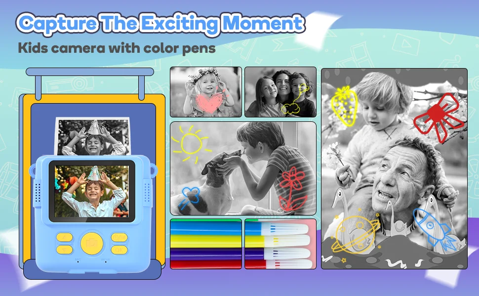 ?【Камера Мгновенной Печати для детей】 благодаря технологии мгновенной обработки изображений наша детская камера может распечатать фотографию за одну секунду. Картриджи с чернилами или тонеры не требуются. Просто выберите режим фотографии и нажмите кнопку «Снимать», появится черно-белое изображение. Давайте сделаем забавные фотографии с семьей и друзьями!
