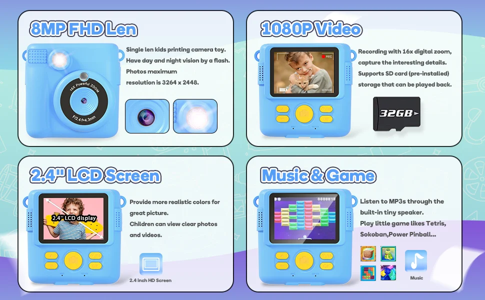 ?【Идеальный подарок для малышей】 печатная камера помогает запечатлеть каждый значимый момент детства ребенка. Он имеет 6 функциональных режимов, таких как фото, видео, музыка, воспроизведение, игры и т. д. Сопровождайте детей, чтобы исследовать мир в течение длительного времени. Это отличные подарки на день рождения, рождественские подарки для детей между От 3 до 12 лет.