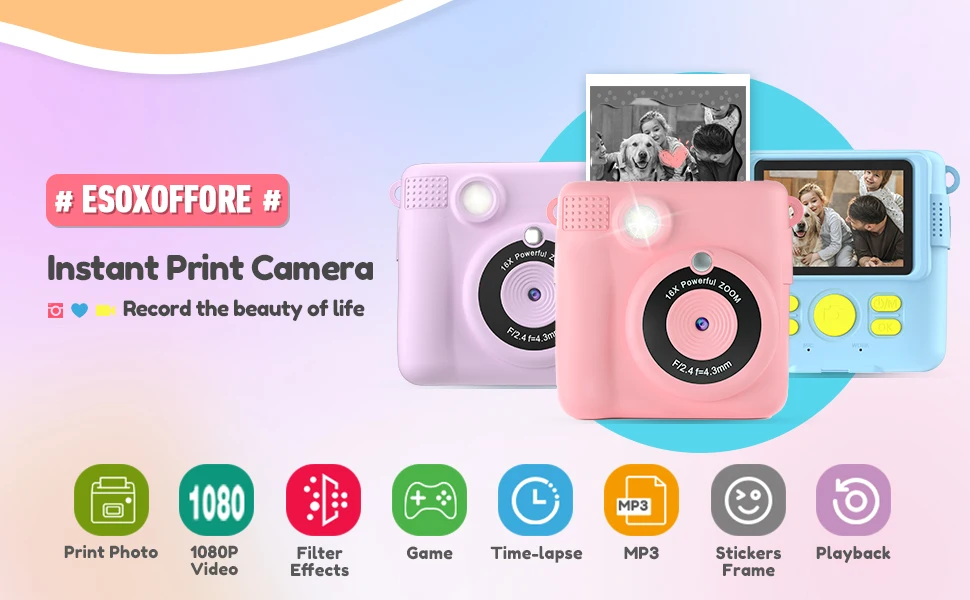 ?【Адекватная бумага для печати фантастические рамки】 есть 3 рулона бумаги для печати и до съемки 372 изображений. Это хороший выбор игрушечной камеры для малышей 3-5 лет. Наша камера имеет 15 видов фильтров сцены и 16 видов наклеек.
