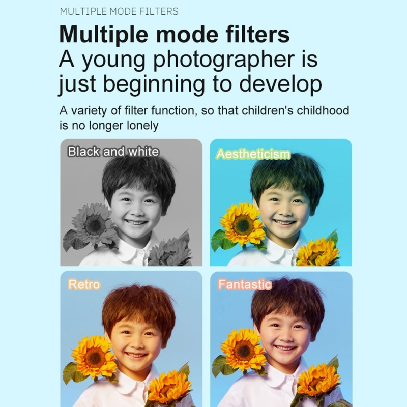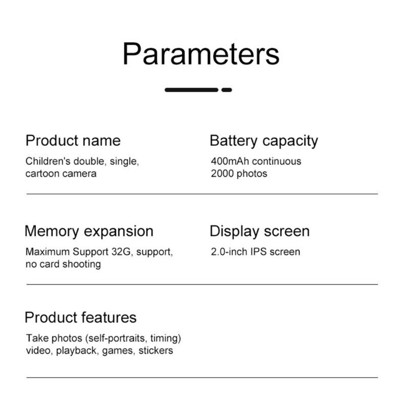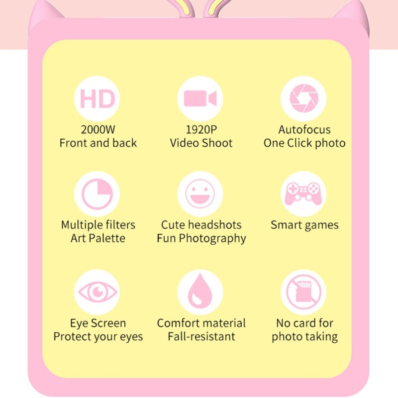 2,0-дюймовый экран высокой четкости, встроенные различные наклейки с большой головой в фоторамку и фильтры, чтобы принести детям новое вдохновение для съемки и записи красочной детской жизни.