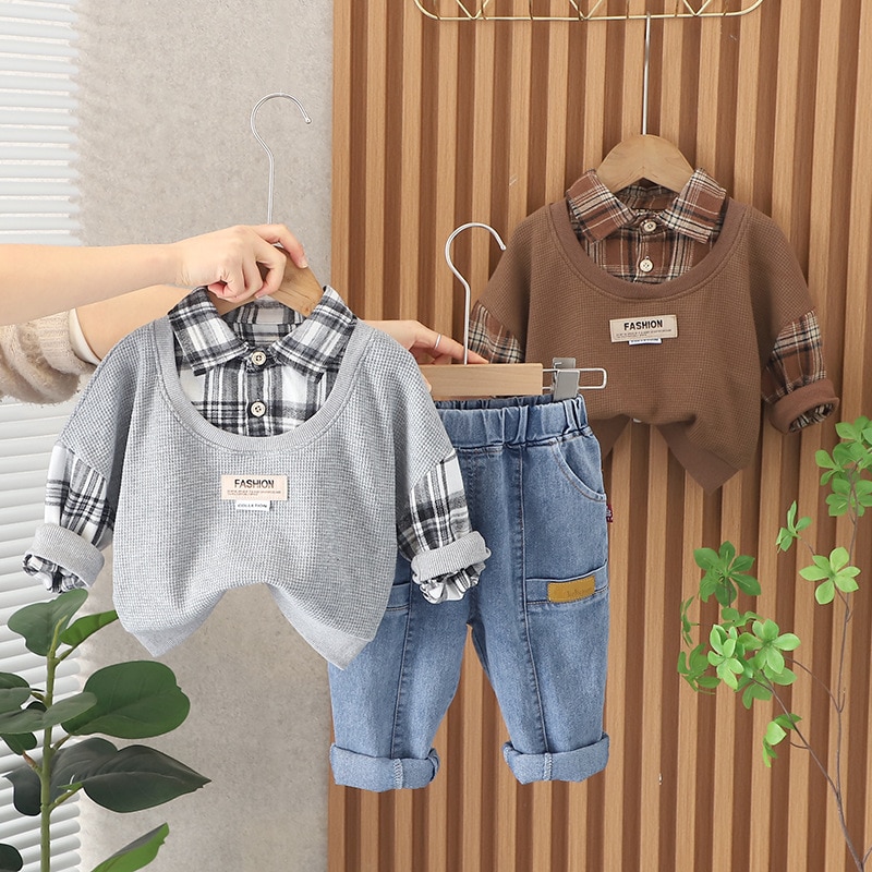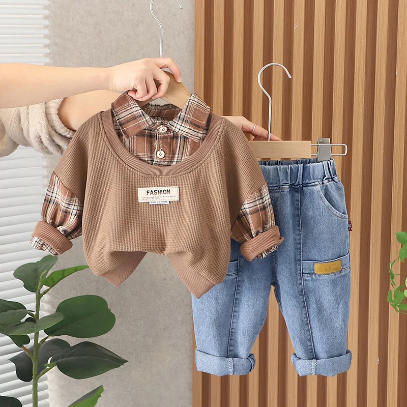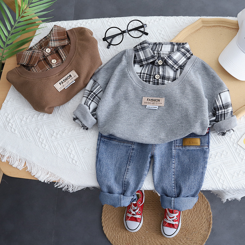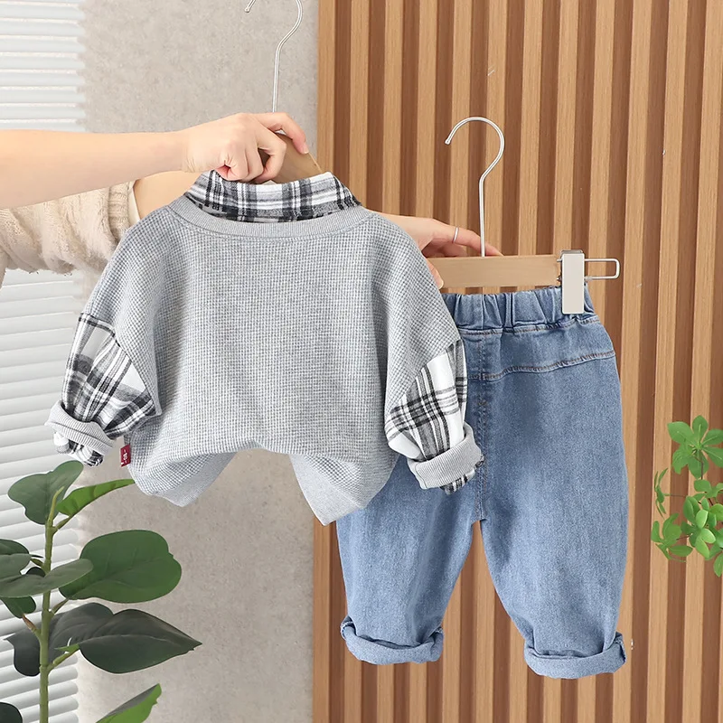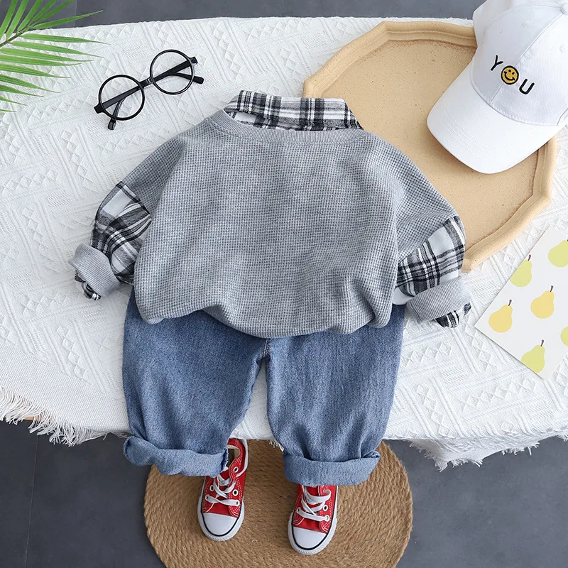 Детская эксклюзивная одежда на весну и осень, повседневные клетчатые лоскутные Футболки с отложным воротником и длинными рукавами и джинсы, комплект одежды для маленьких мальчиков