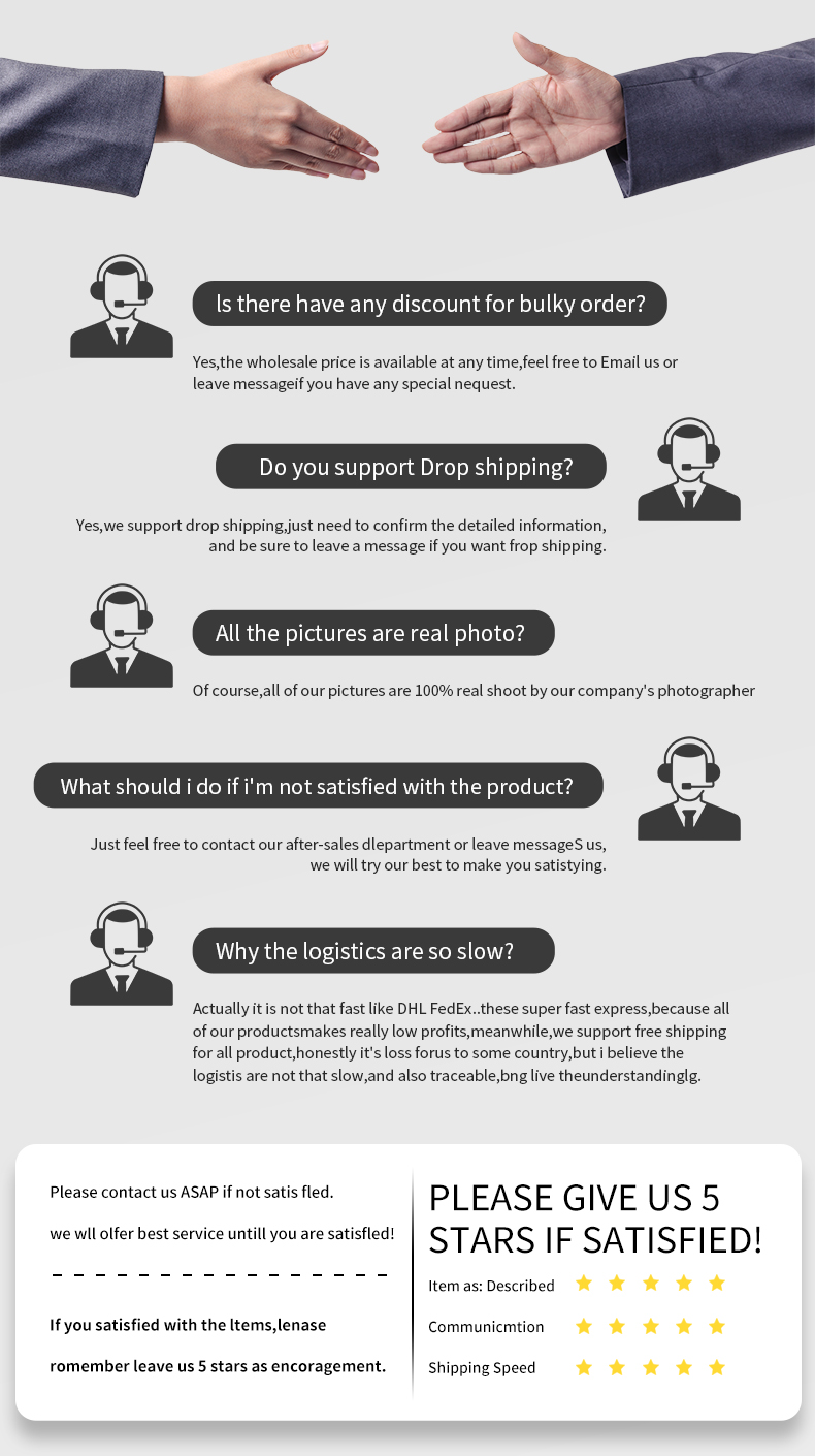�� 1. Если вы удовлетворены нашими продуктами и услугами, пожалуйста, оставьте нам положительный отзыв и 5 звезд и 5 звезд для подробной оценки вашего заказа. Как только вы покажете нам снимок экрана с обоими 5 звездами, мы предоставим вам СКИДКУ или подарок на ваш следующий заказ.