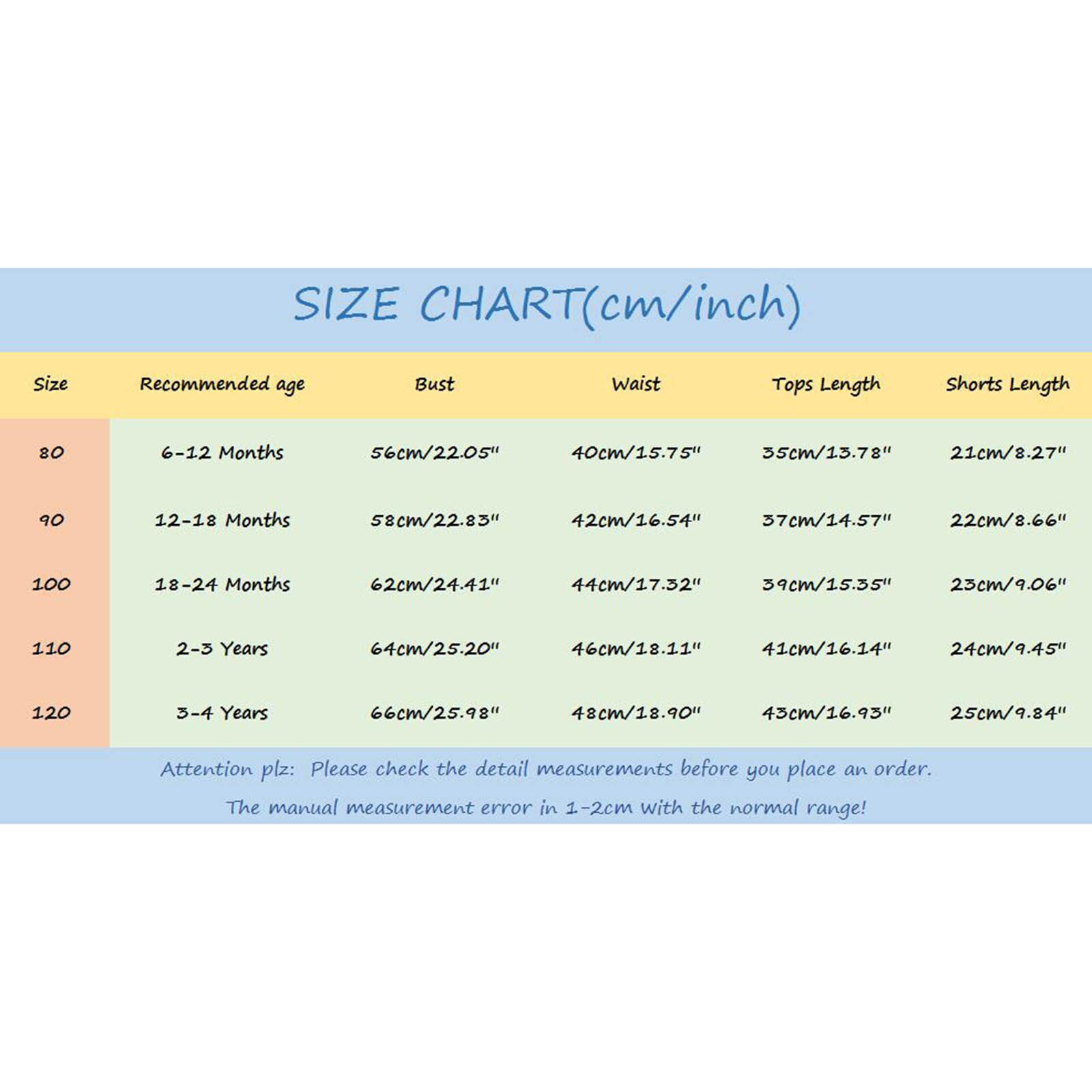 Размер: 80 Рекомендуемый Возраст: 6-12 месяцев Бюст: 56 см/22,05 дюйма Талия: 40 см/15,75 дюйма Длина топа: 35 см/13,78 дюйма Длина Шорт: 21 см/8,27 дюйма