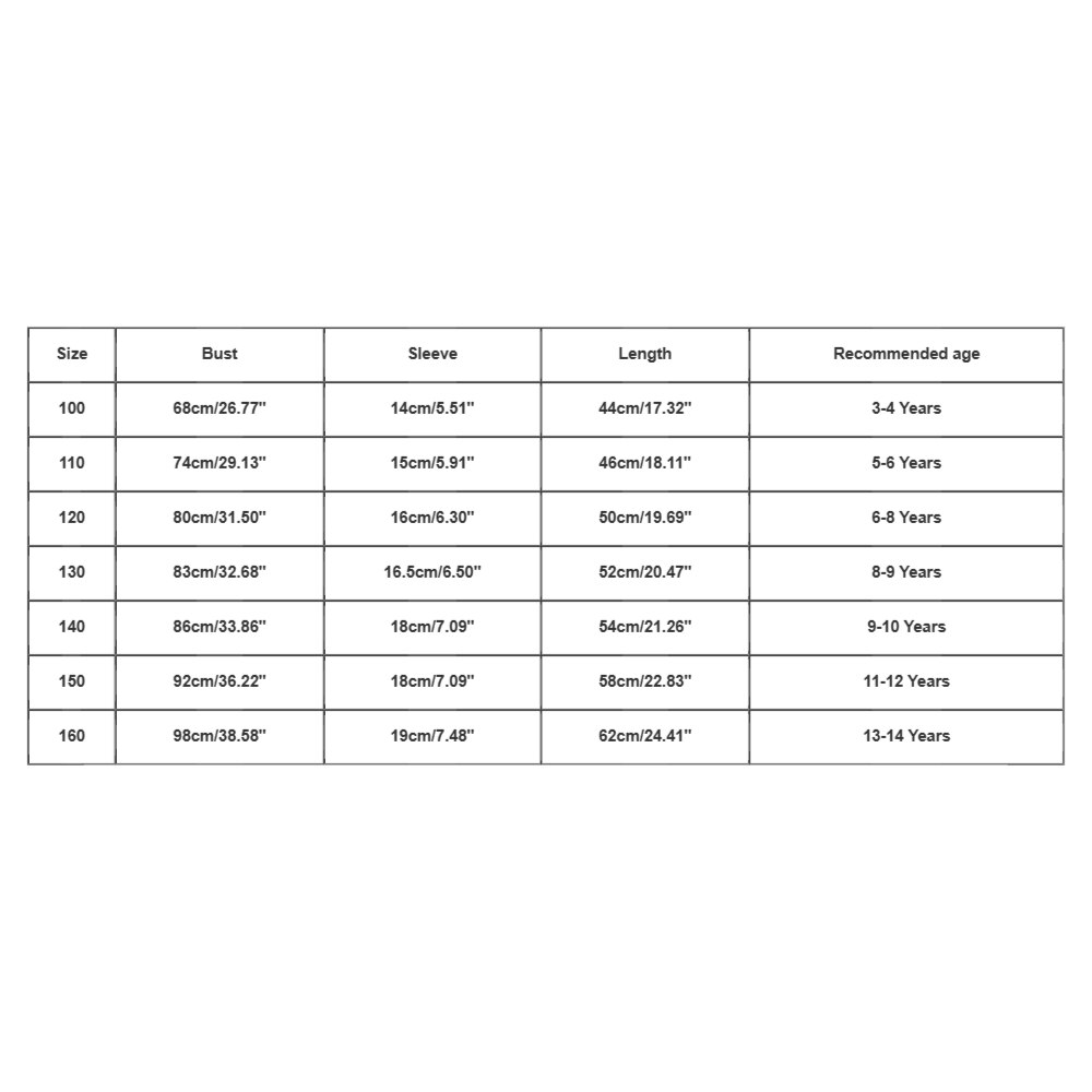 Размер: 140 Бюст: 86 см/33,86 дюйма Рукав: 18 см/7,09 дюйма Длина: 54 см/21,26 дюйма Рекомендуемый возраст: От 9 до 10 лет