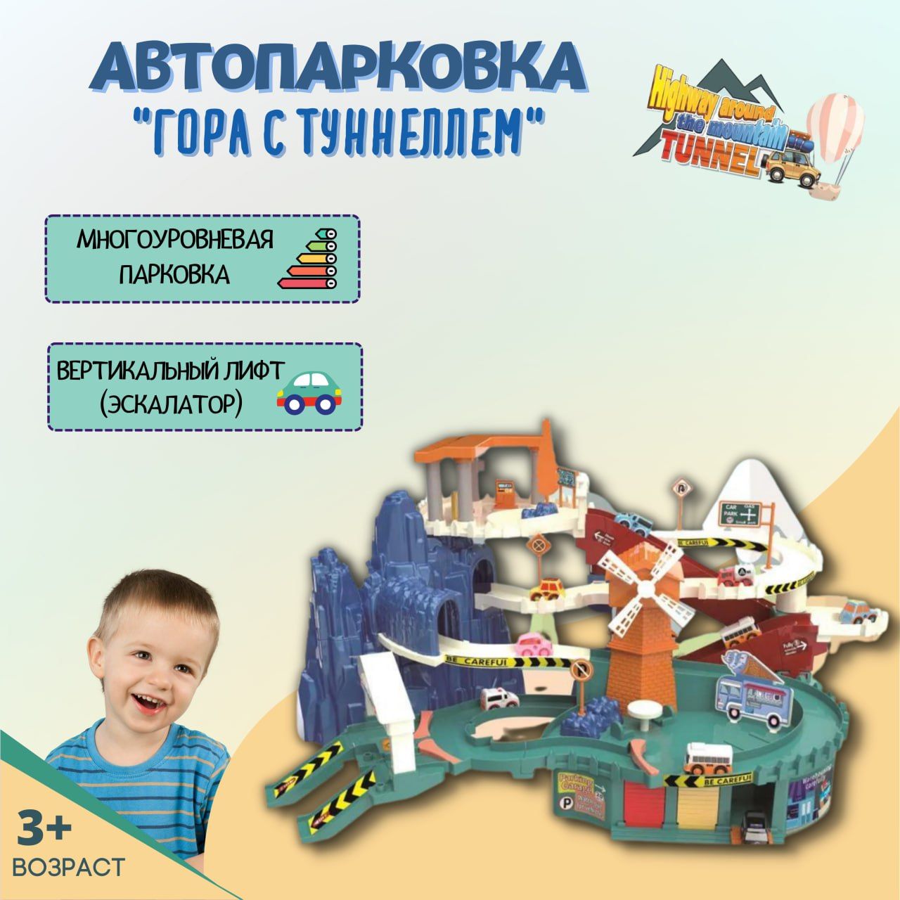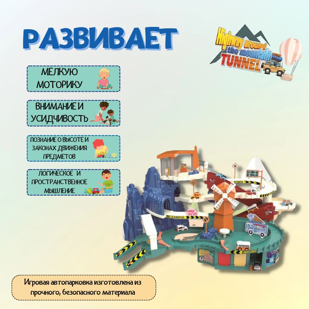 Детская игровая парковка 31 см "Гора с Туннелем" с 2 электро-подъемниками, ковриком-картой, светом, звуком и 4 машинками