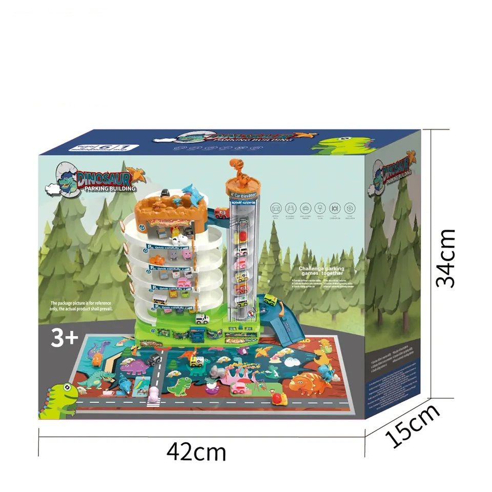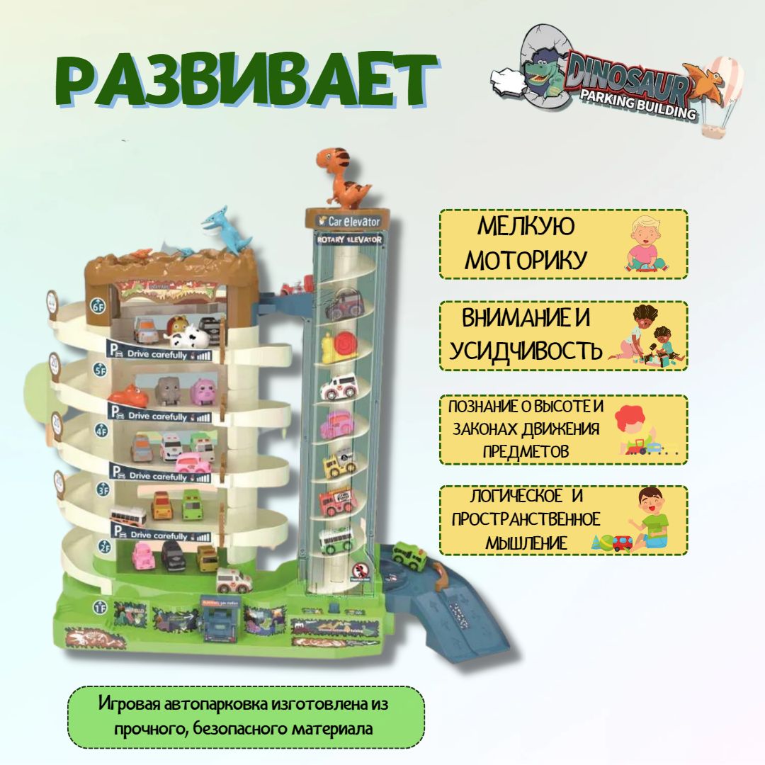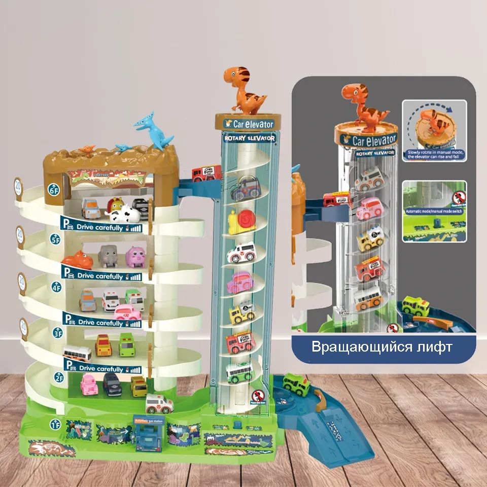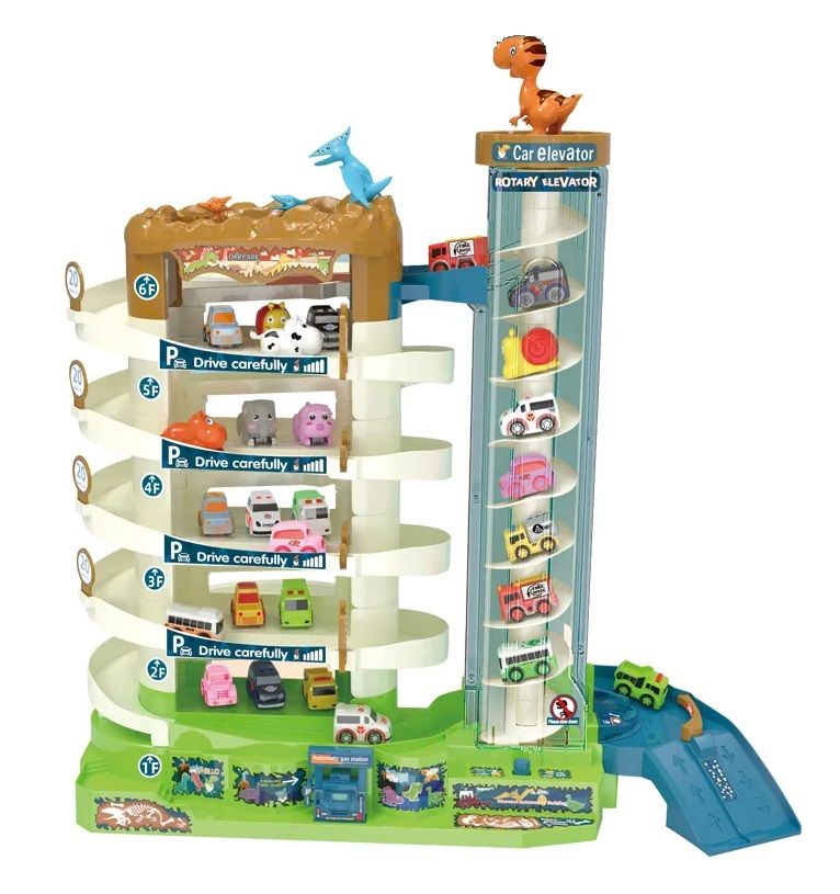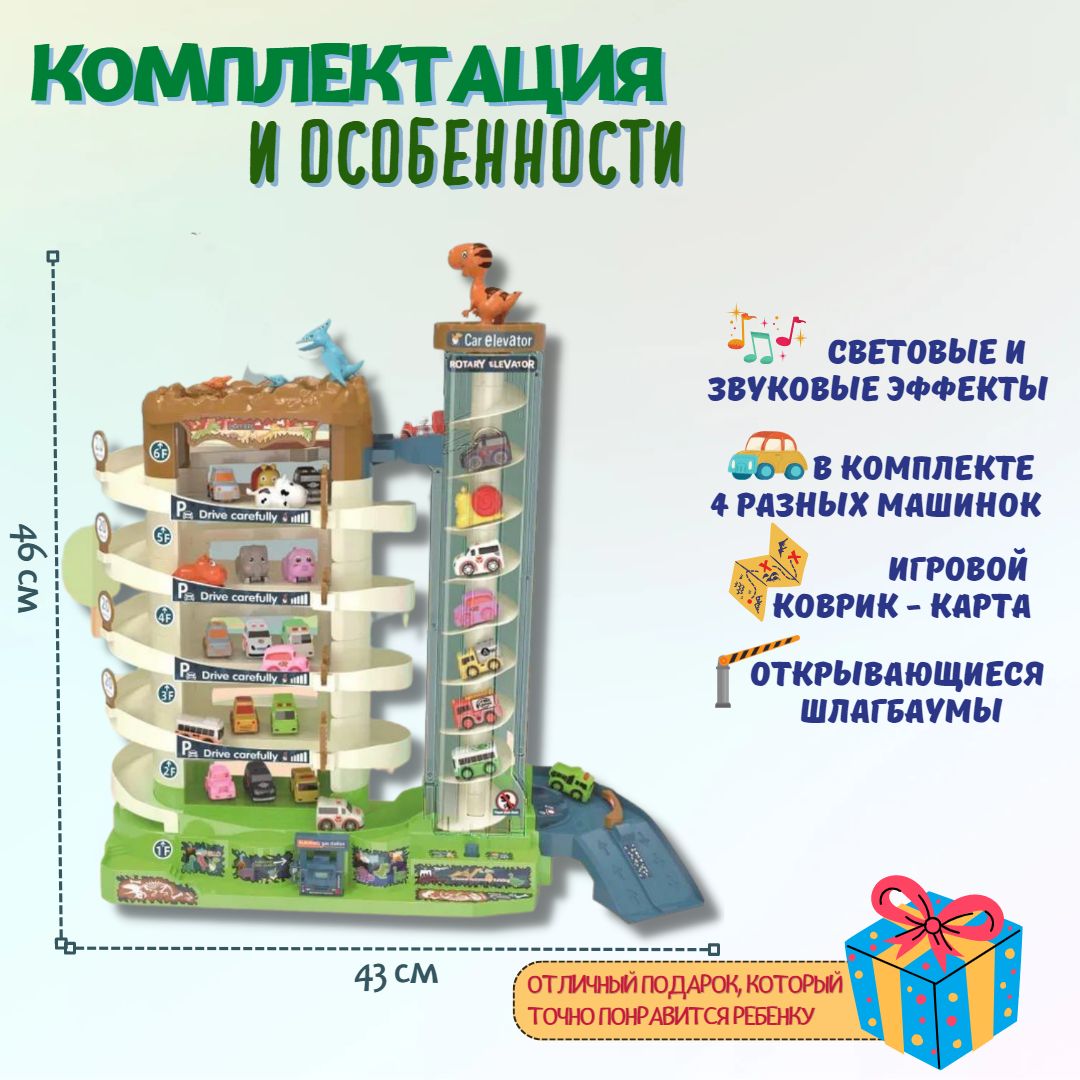 Описание: Игровая парковка 46 см "Дино-Парк" 6 уровнейЯркая, необычная многоуровневая игровая парковка DI & VO станет отличным подарком для ребёнка. Такая игрушка займёт важное место в коллекции юного автолюбителя. Детская парковка DI & VO со спиральным электро-лифтом, светомузыкальным сопровождением, набором машинок, ковриком-картой, набор дорожный знаков и наклейки.СПИРАЛЬНЫЙ ЛИФТ С КРУГОВЫМ ДЕМО-РЕЖИМОМВсе машинки поднимаются на верхний уровень на спиральном лифте. Лифт обладает двумя вариантами работы: ручной и электрический (от батареек). Для ручного подъёма на верхней крышке лифта есть специальные выемки для пальцев. Электро-режим включается переключателем на основании лифта.