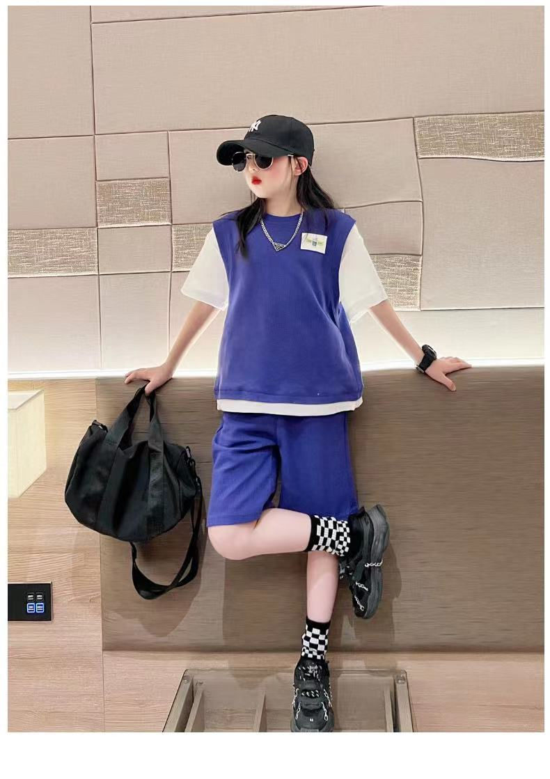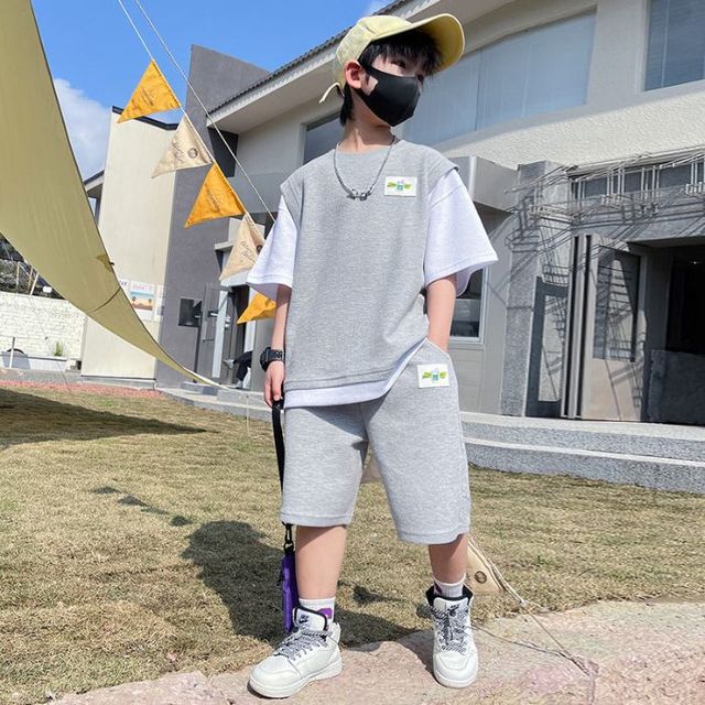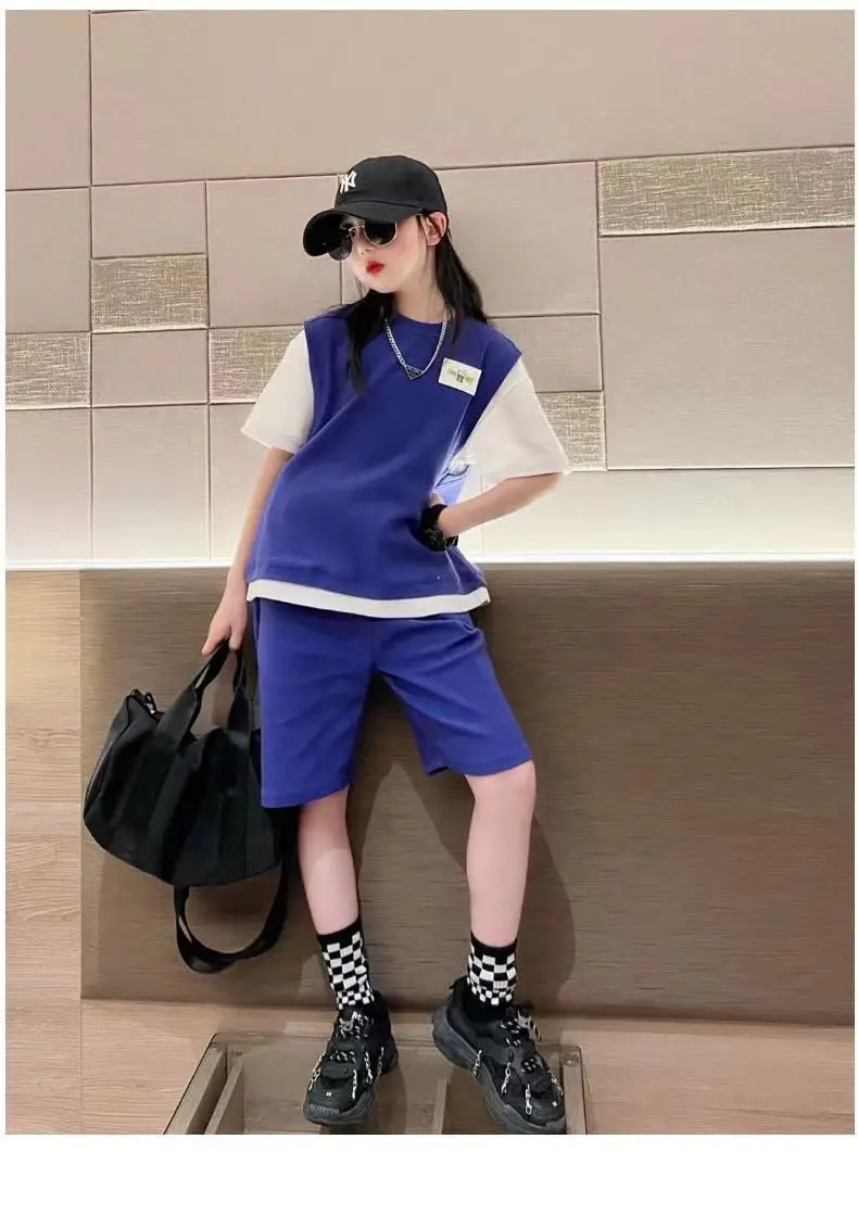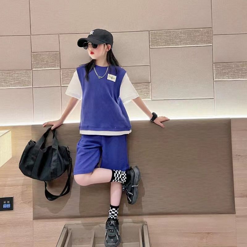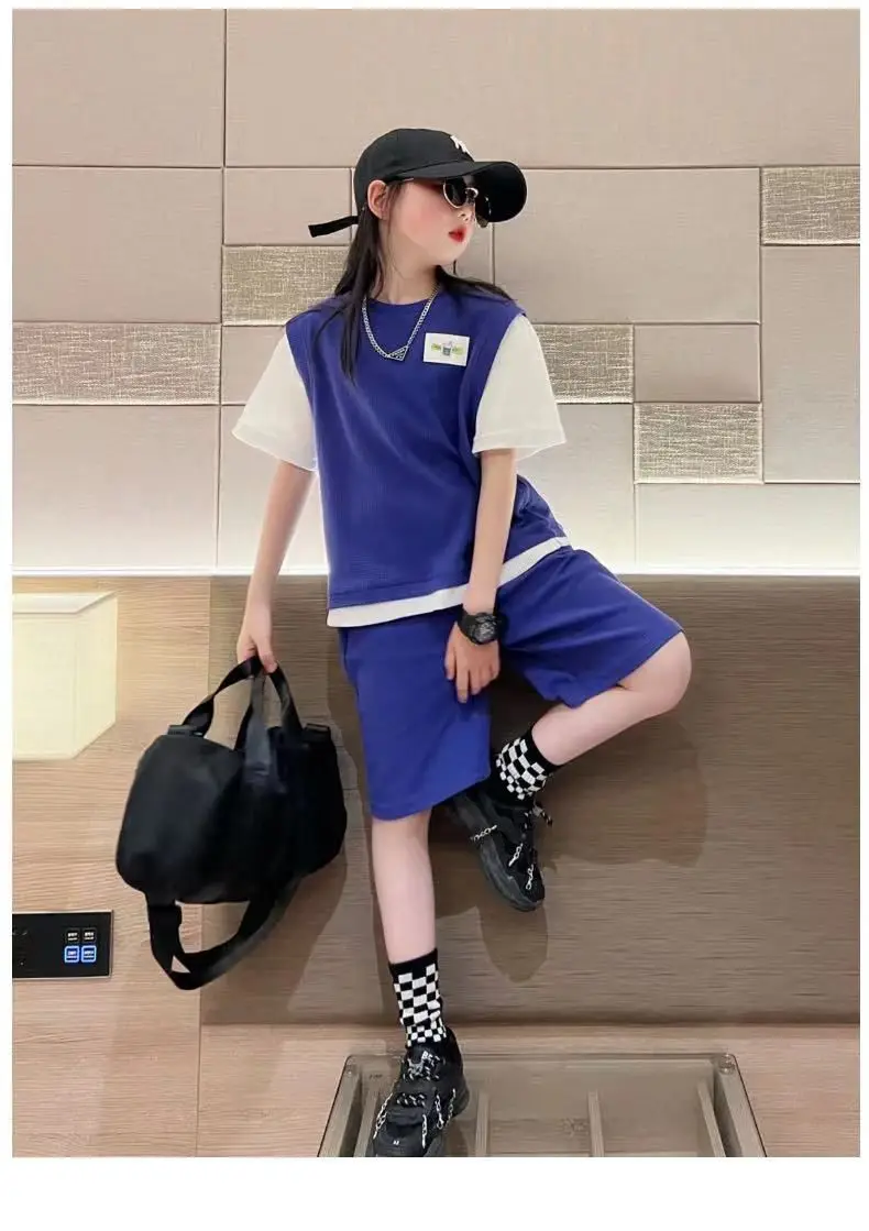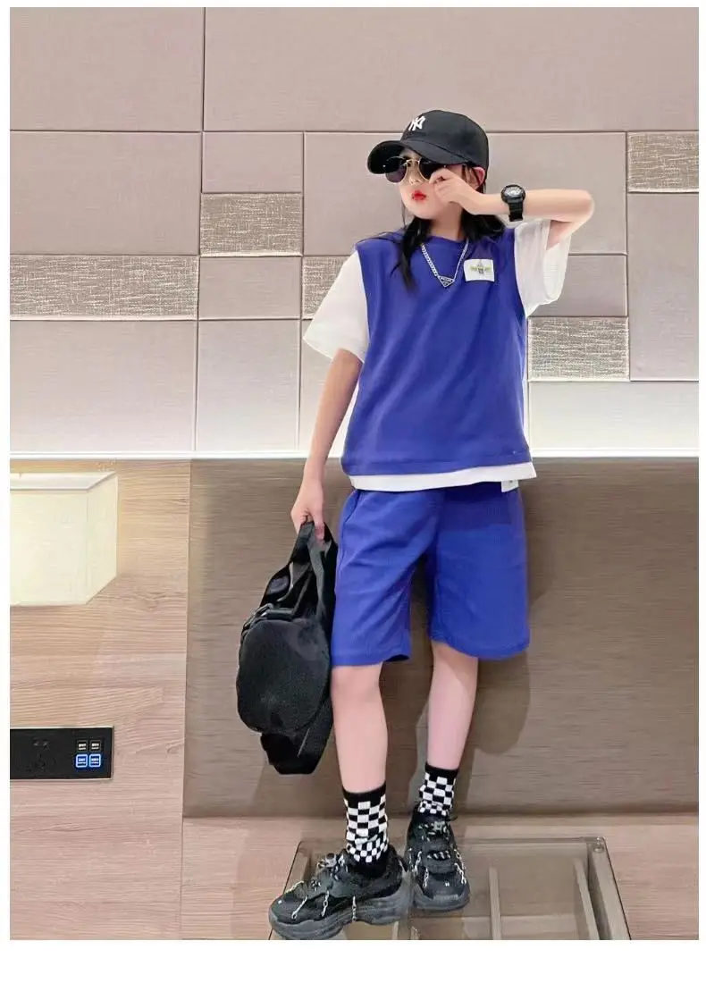 Детская короткая одежда, костюм для девочек, спортивный костюм в стиле пэчворк, футболка с имитацией двух предметов для мальчиков, шорты