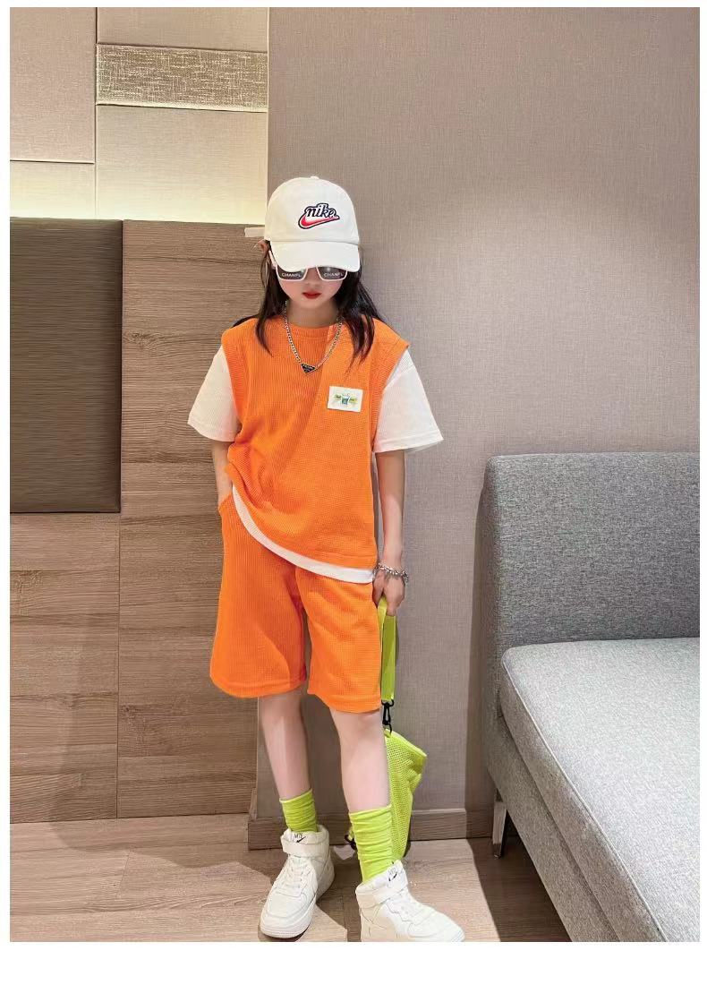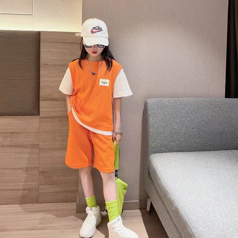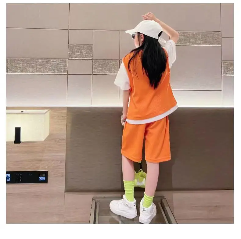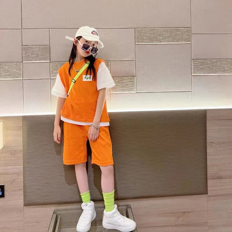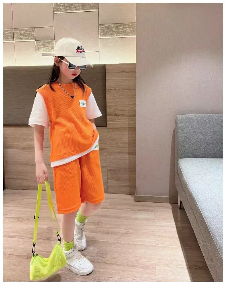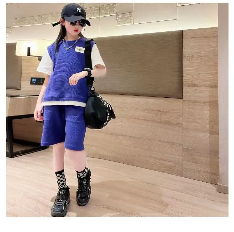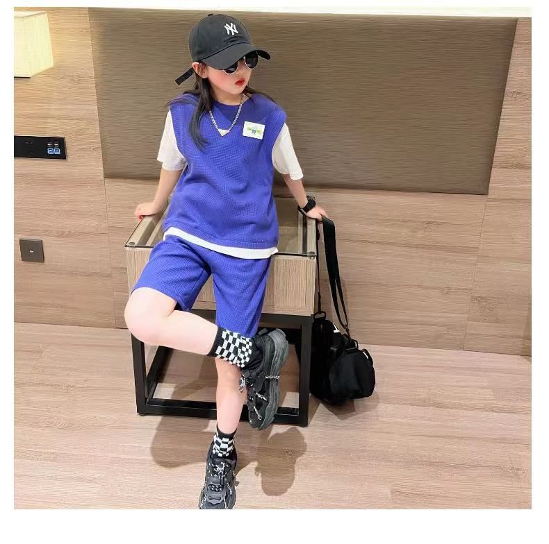Детская короткая одежда, костюм для девочек, спортивный костюм в стиле пэчворк, футболка с имитацией двух предметов для мальчиков, шорты