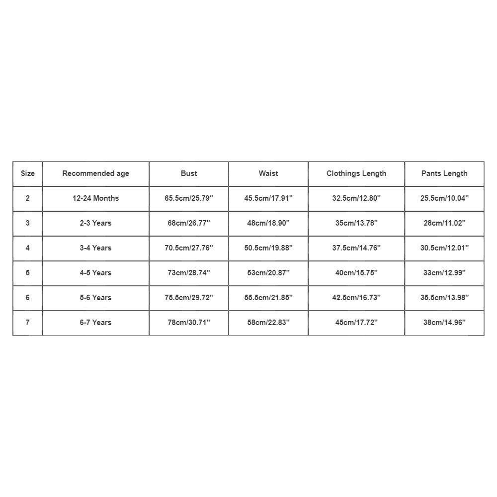 Размер: 2 Рекомендуемый возраст: 12-24 месяца Бюст: 65,5 см/25,79 дюйма Талия: 45,5 см/17,91 дюйма Длина одежды: 32,5 см/12,80 дюйма Длина брюк: 25,5 см/10,04 дюйма