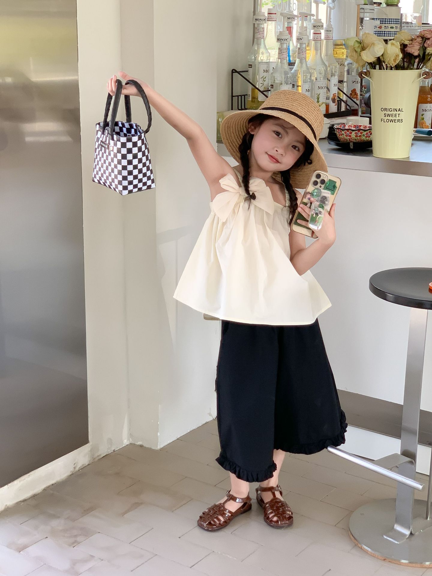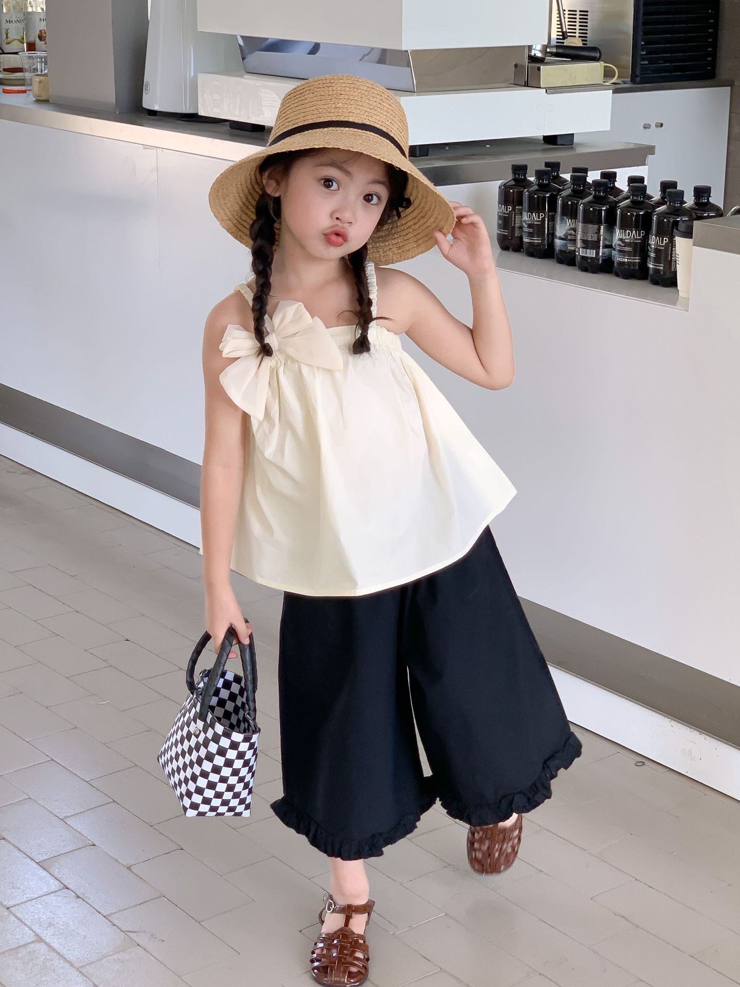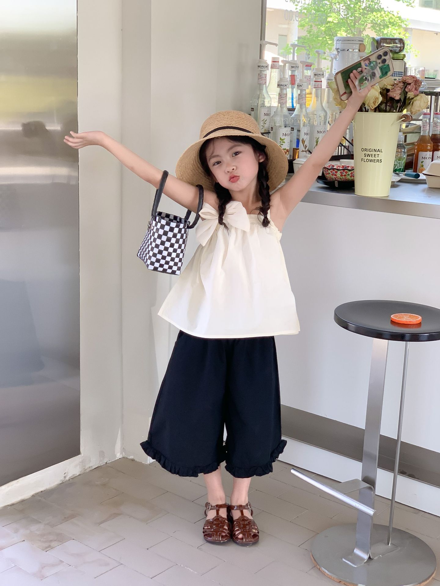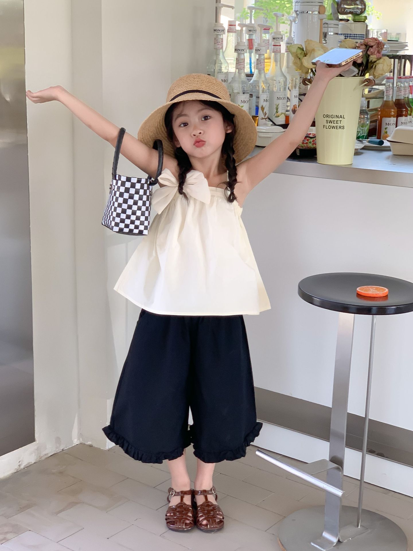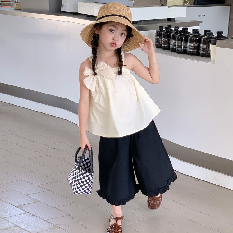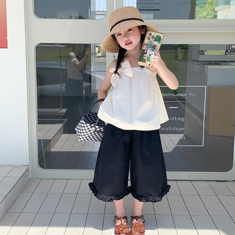 Детская одежда для девочек, летняя рубашка с бантом и подтяжками, кружевные укороченные брюки с широкими штанинами, костюм в Корейском стиле, повседневный комплект из двух предметов для детей