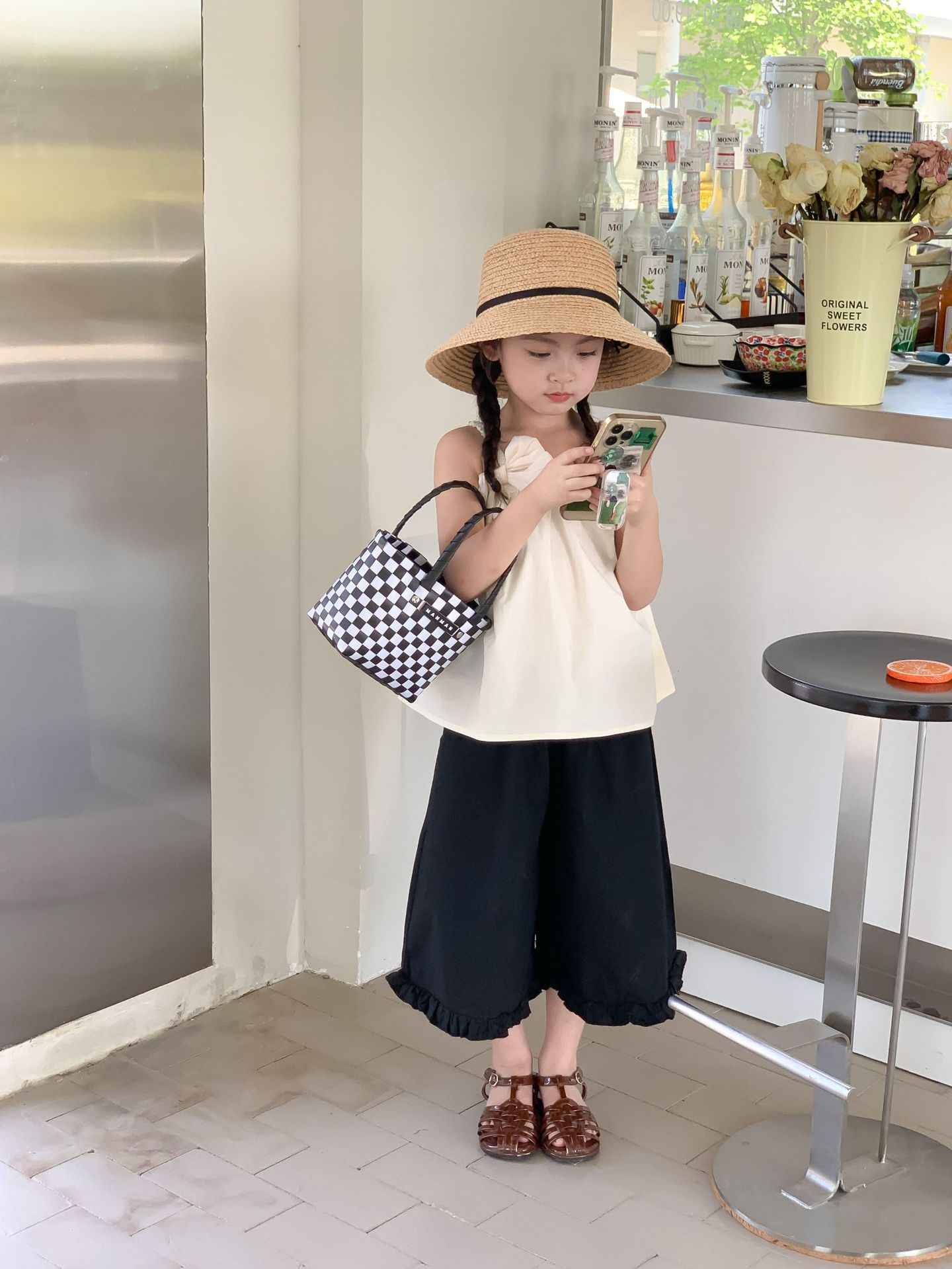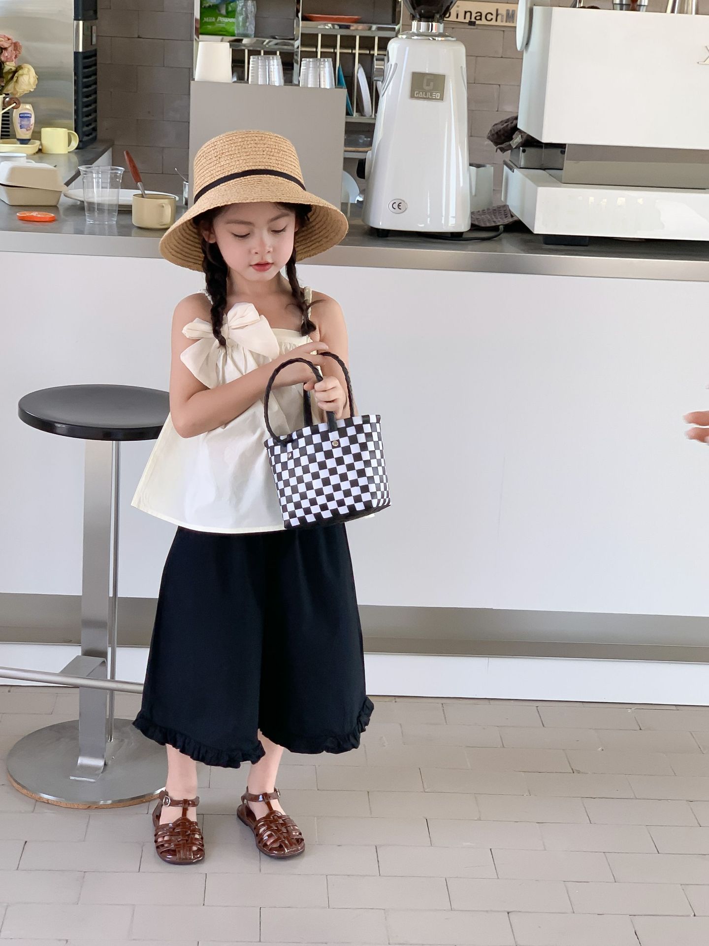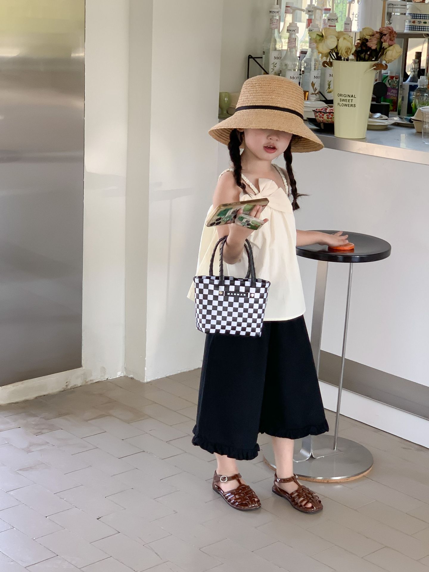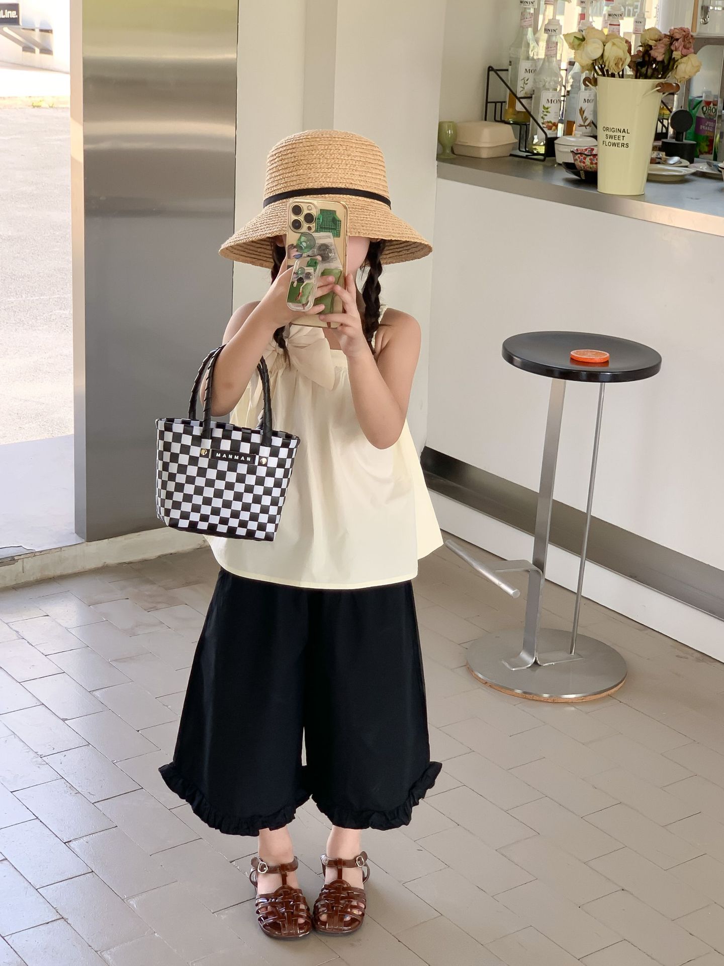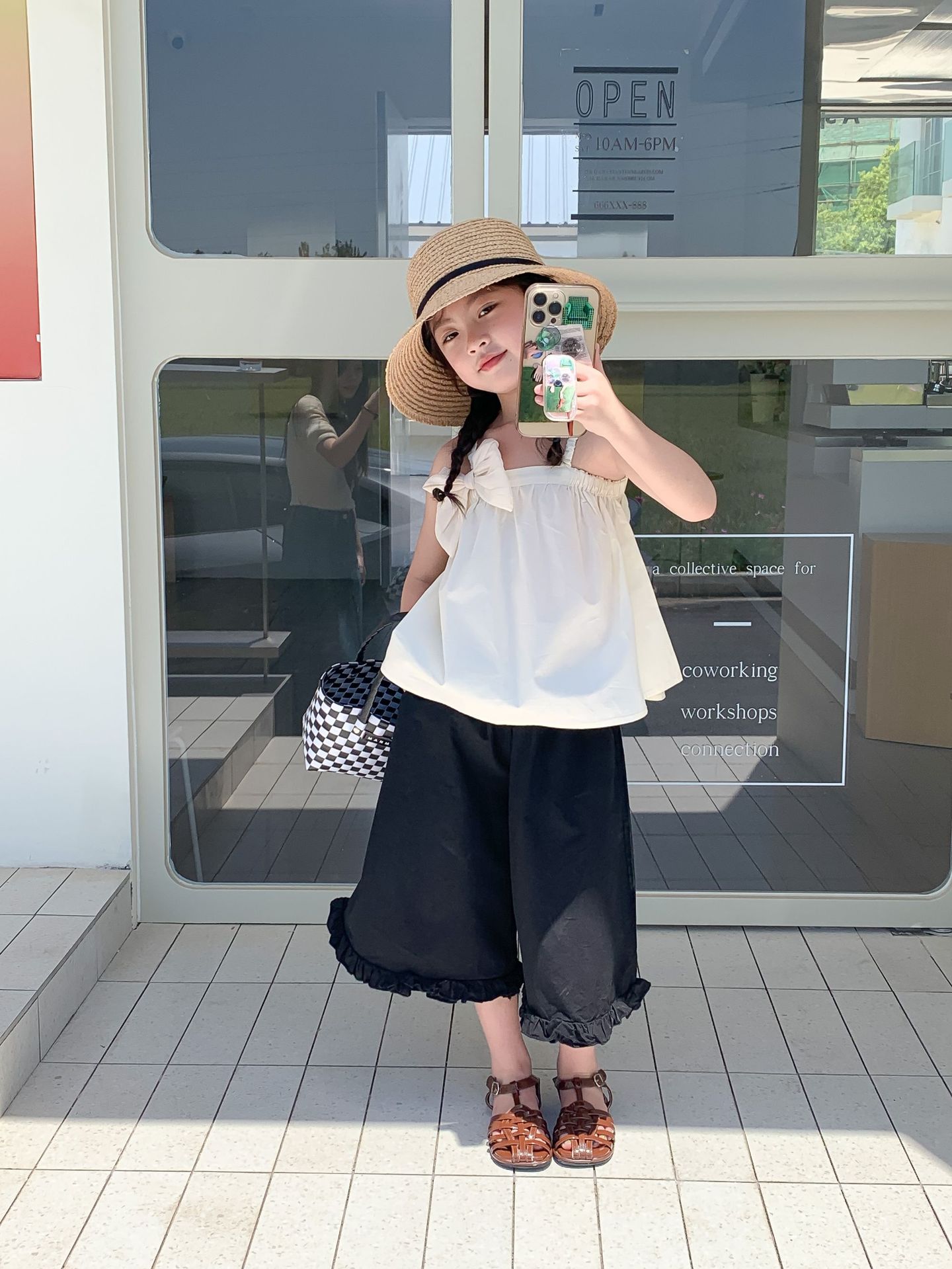 Детская одежда для девочек, летняя рубашка с бантом и подтяжками, кружевные укороченные брюки с широкими штанинами, костюм в Корейском стиле, повседневный комплект из двух предметов для детей