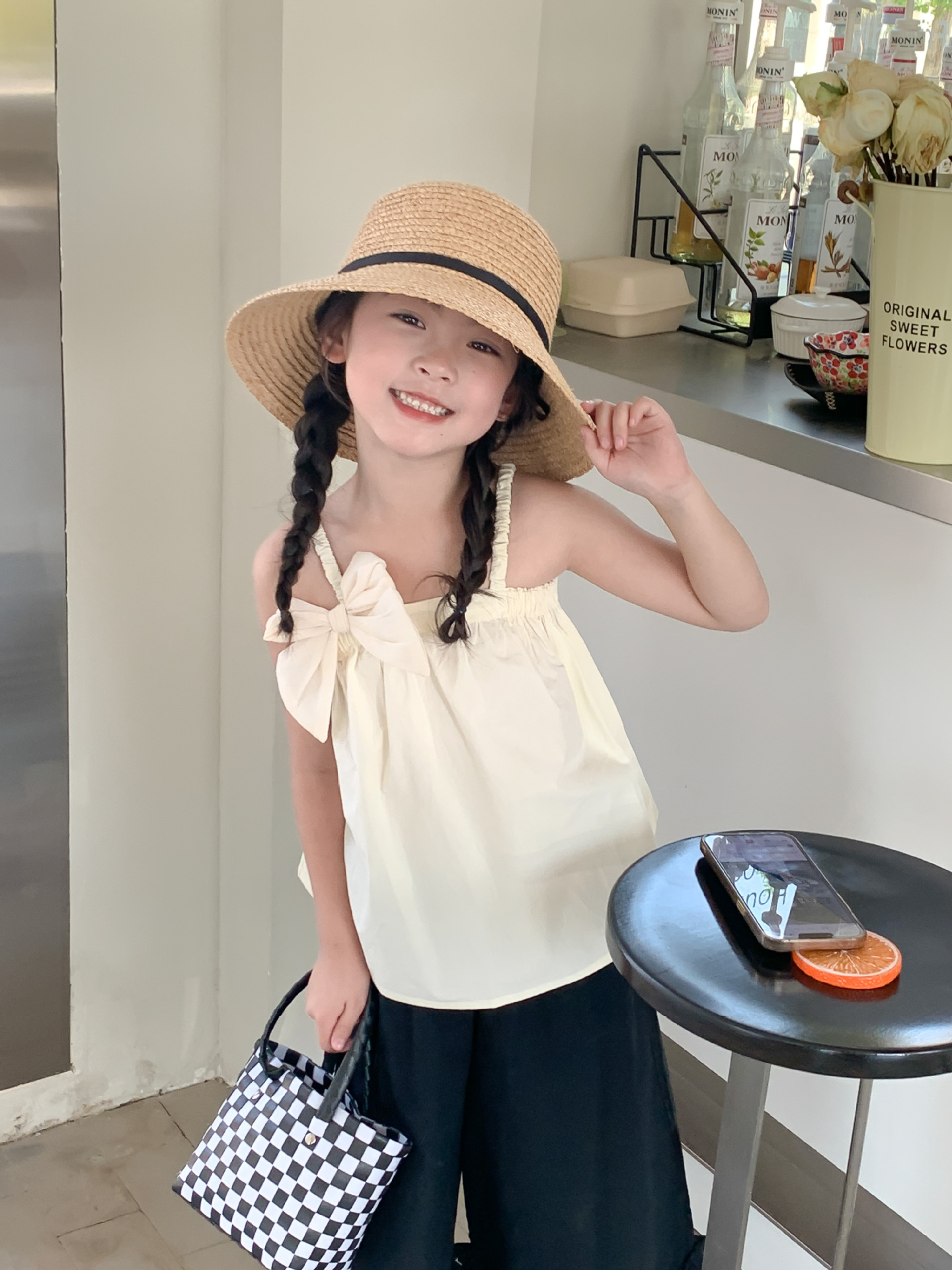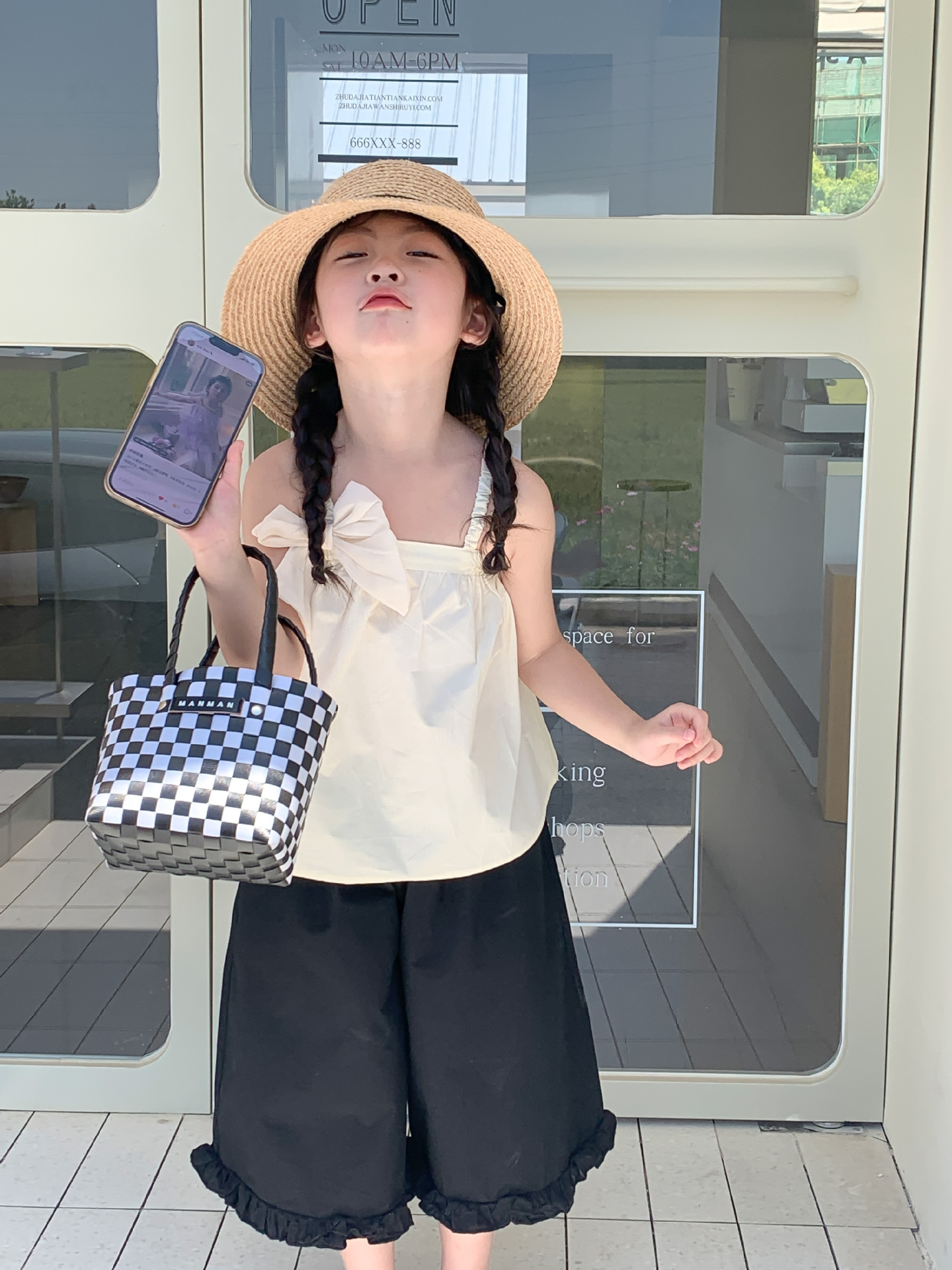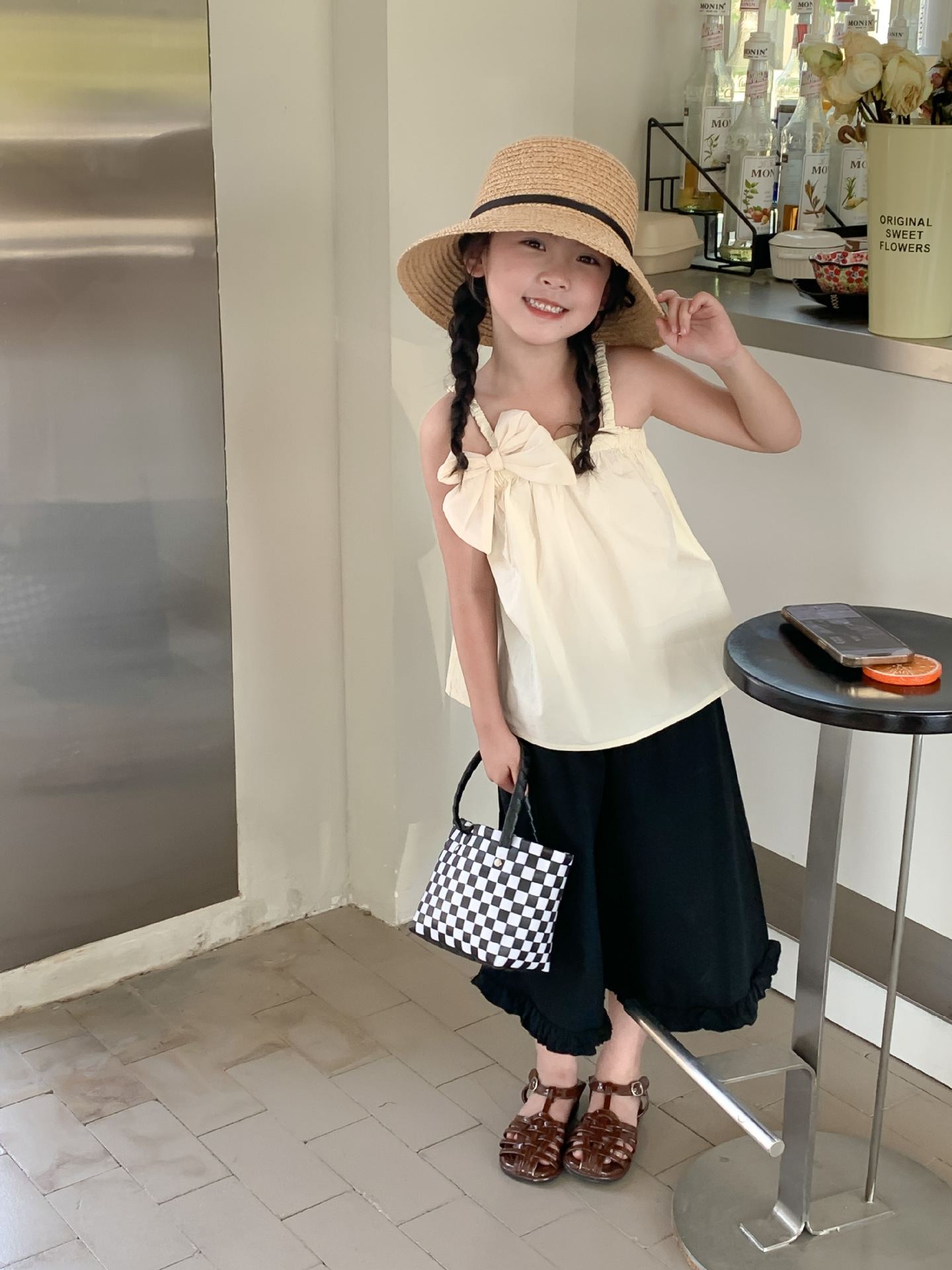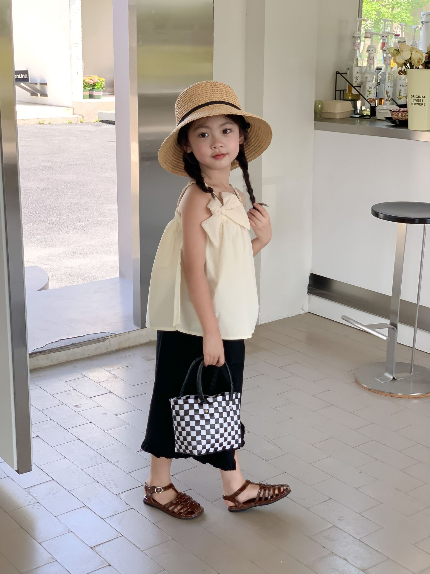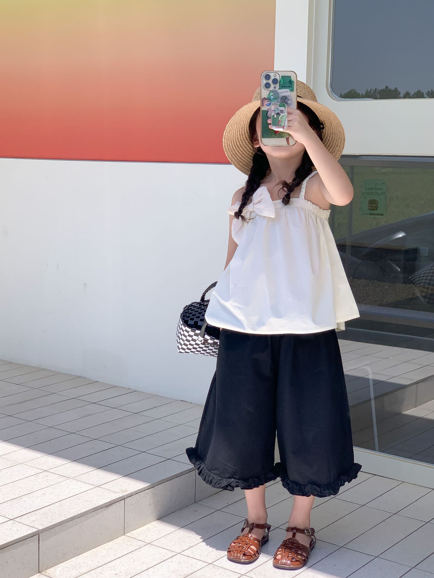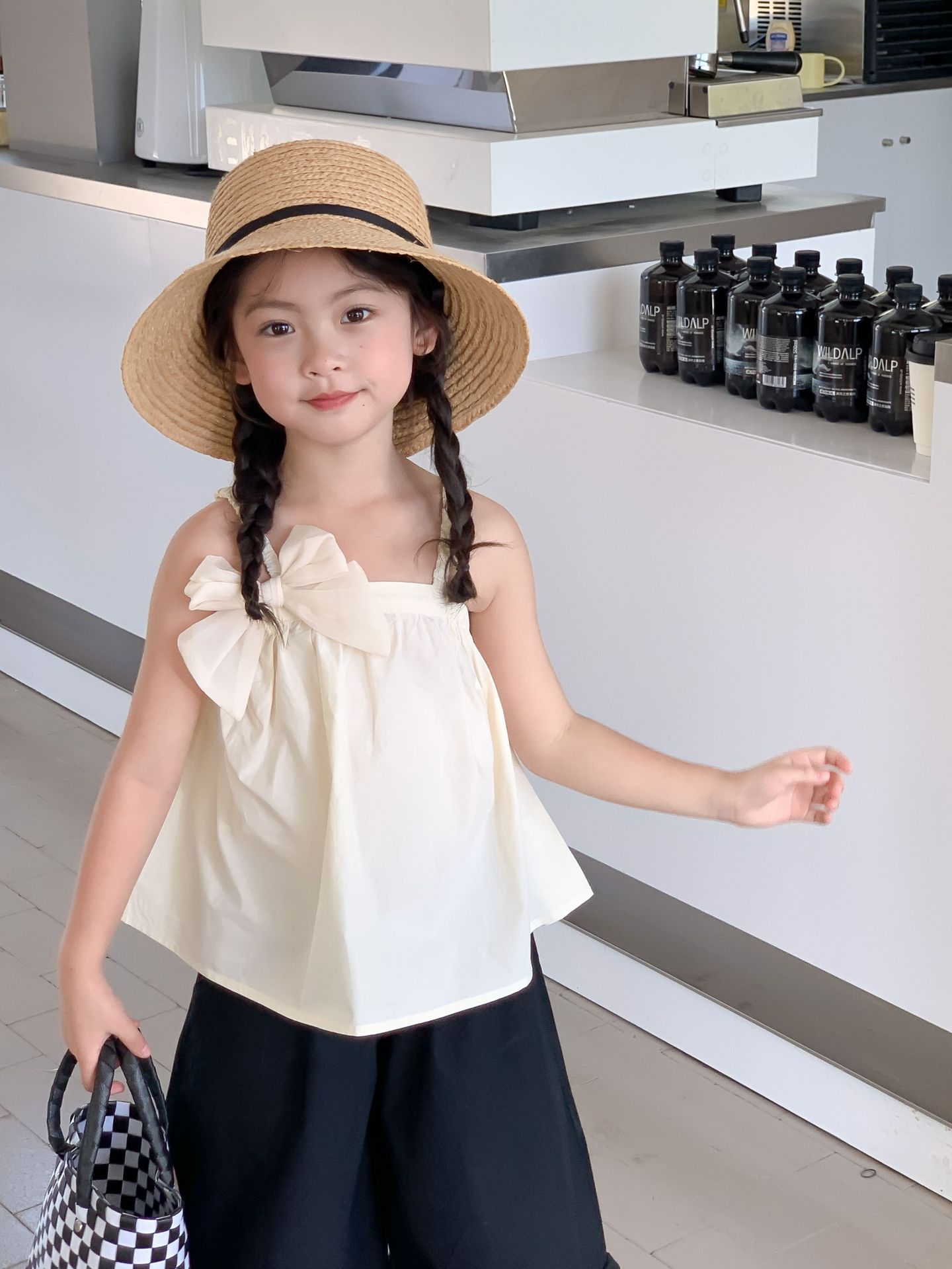 Детская одежда для девочек, летняя рубашка с бантом и подтяжками, кружевные укороченные брюки с широкими штанинами, костюм в Корейском стиле, повседневный комплект из двух предметов для детей