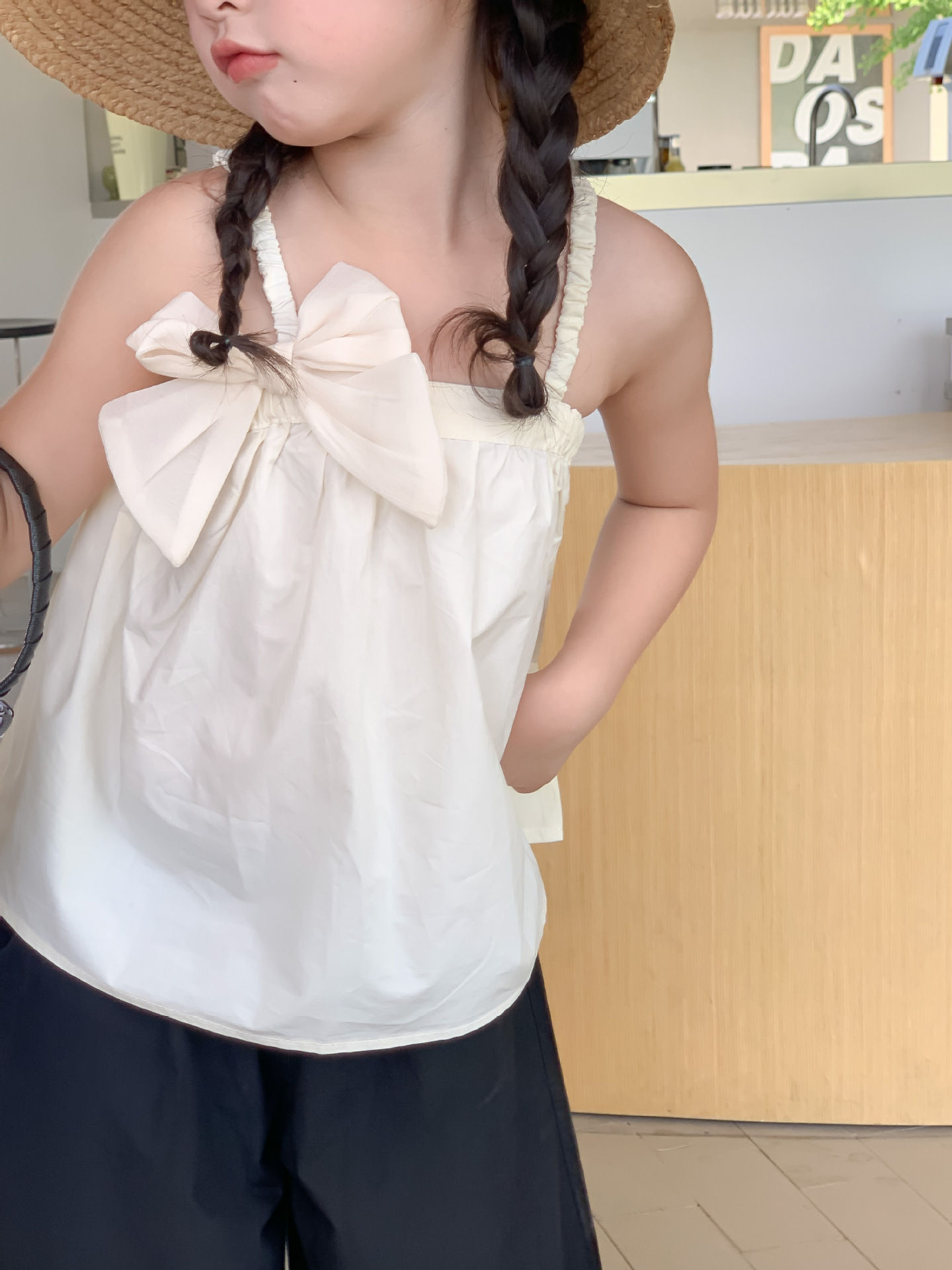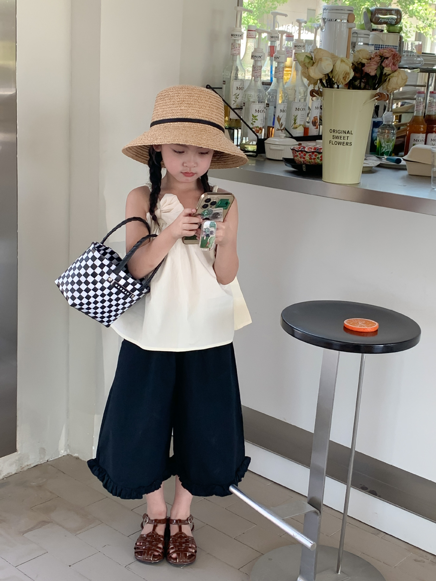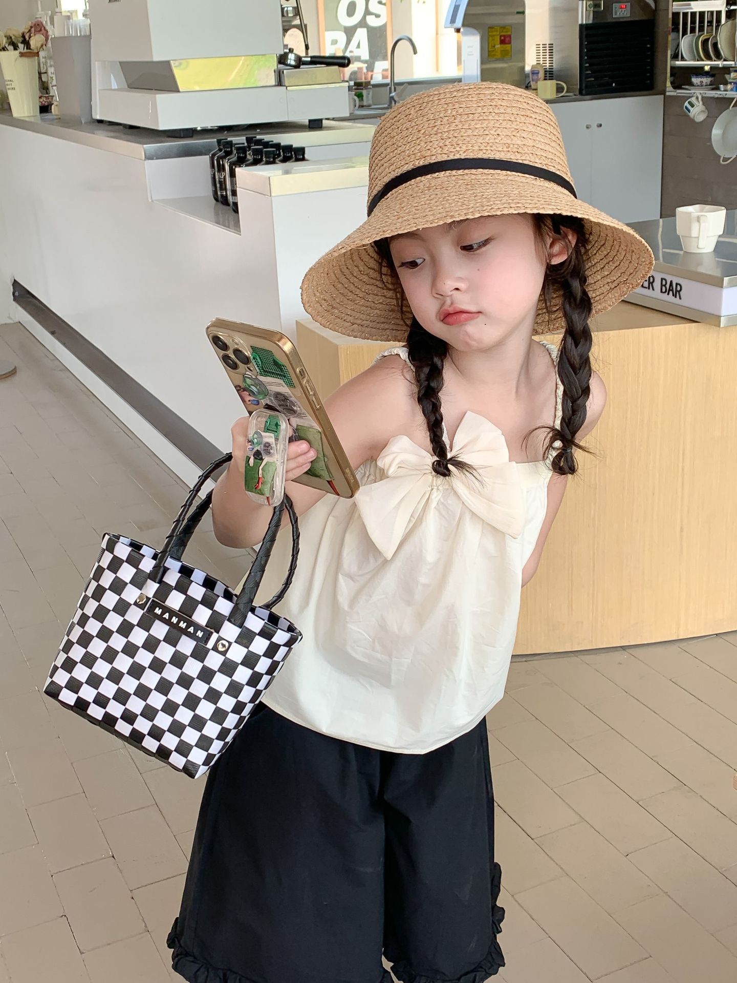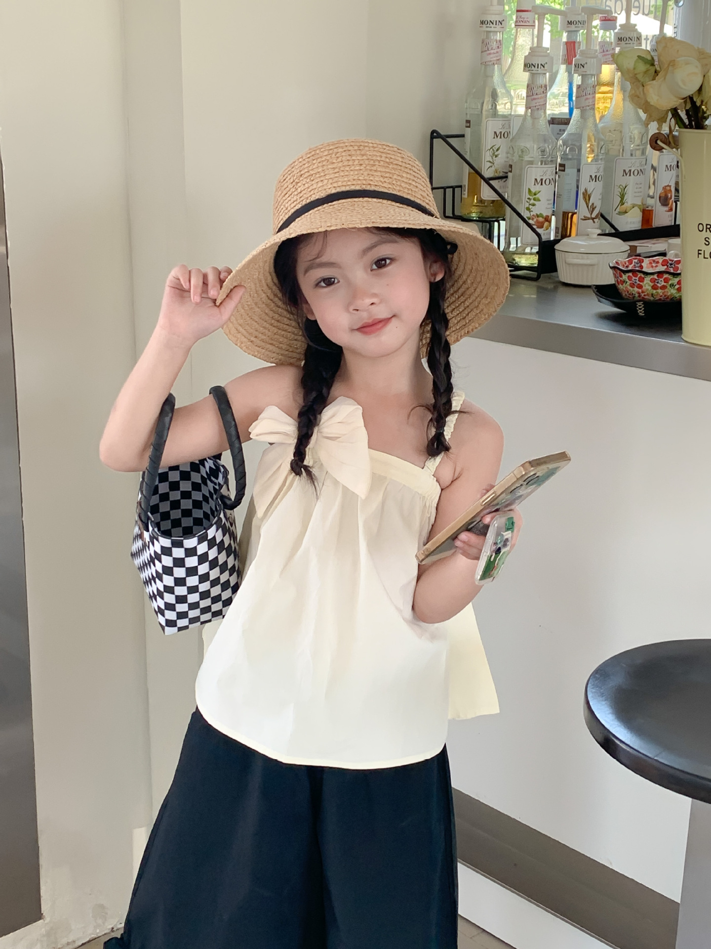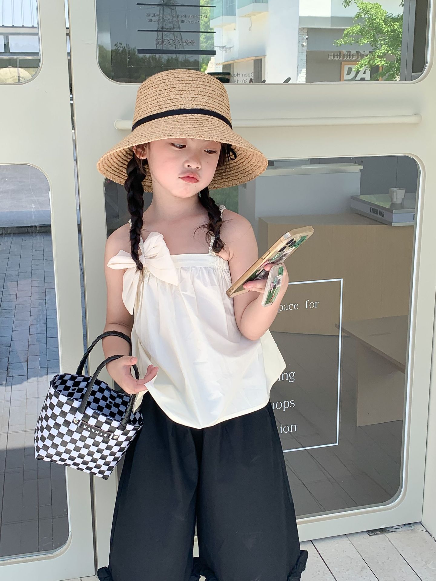 Детская одежда для девочек, летняя рубашка с бантом и подтяжками, кружевные укороченные брюки с широкими штанинами, костюм в Корейском стиле, повседневный комплект из двух предметов для детей