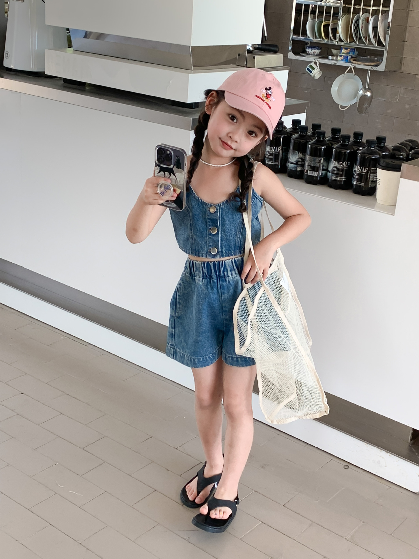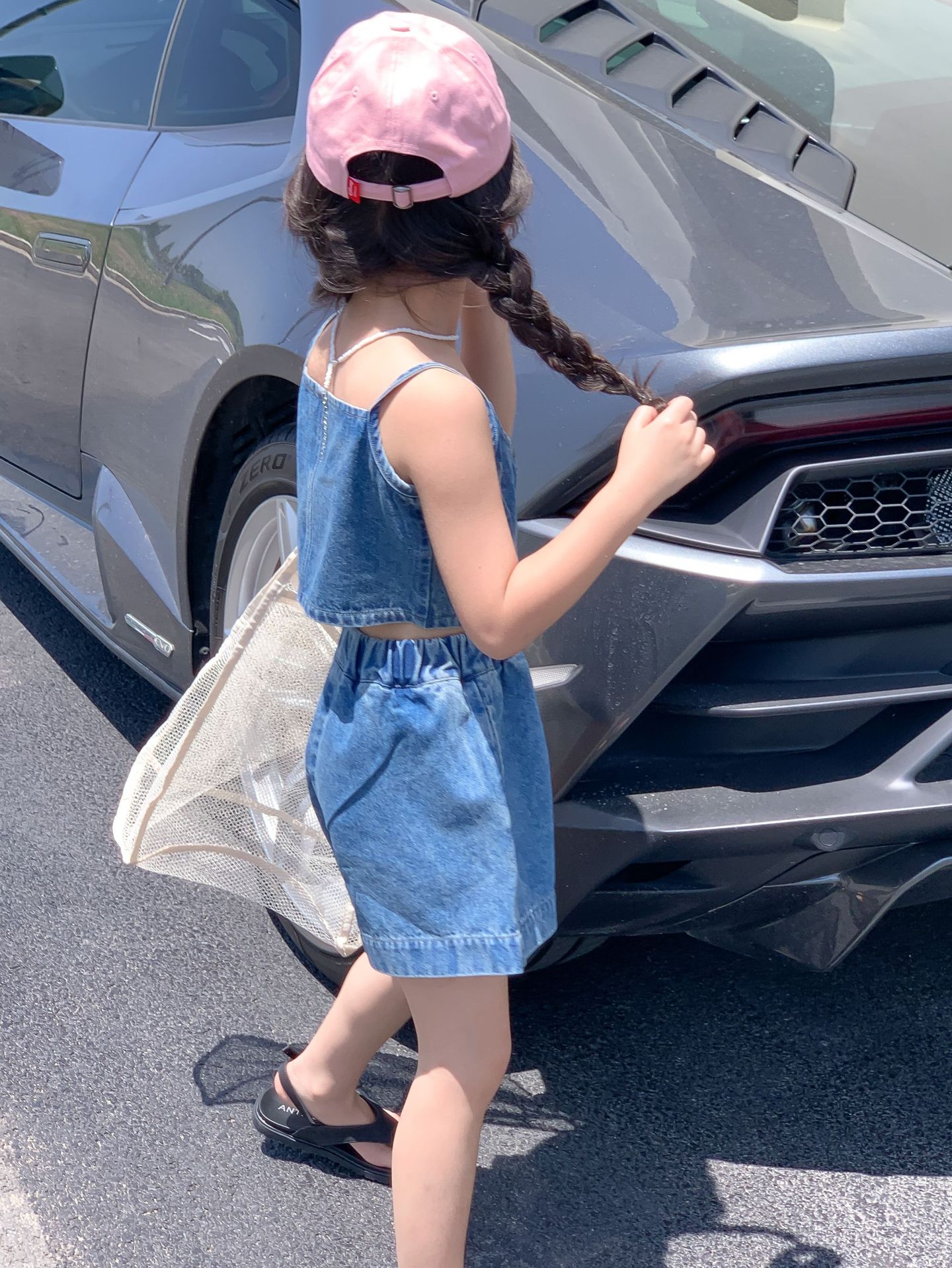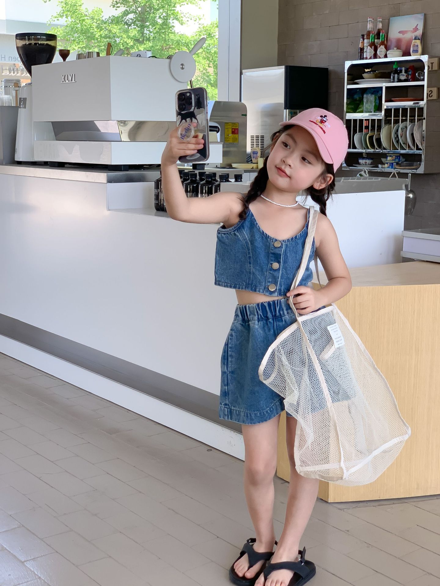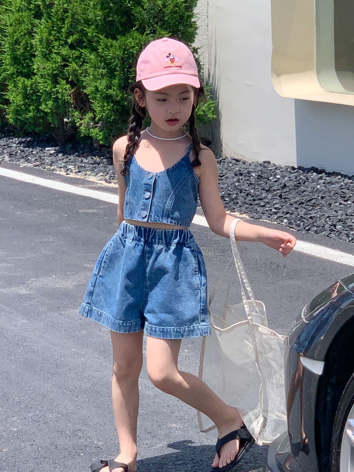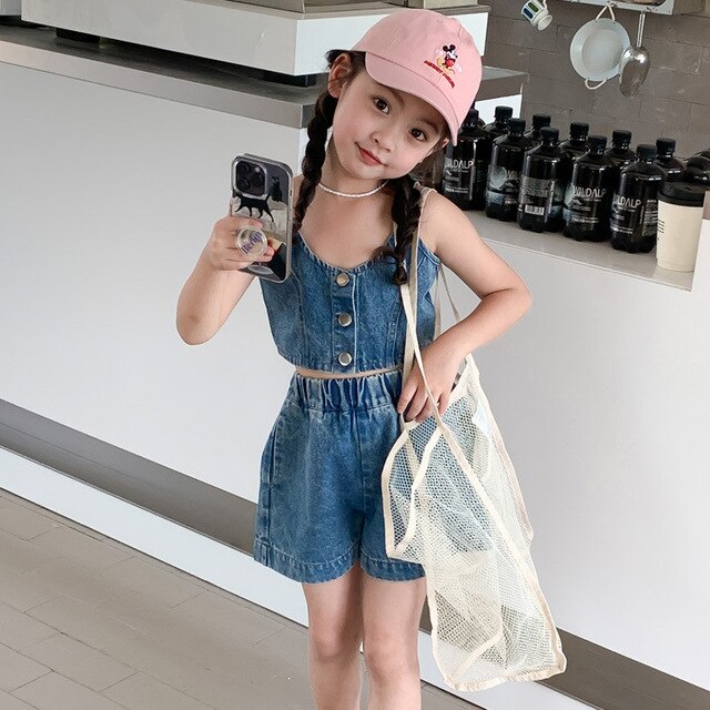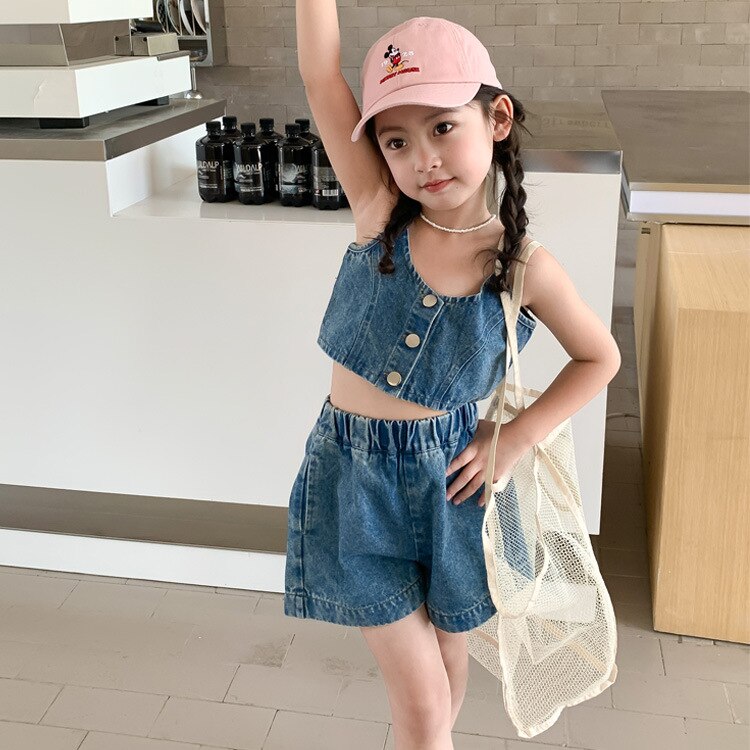 Детская одежда, костюм для девочек в Корейском стиле, лето 2023, модный джинсовый жилет на бретелях и шорты в Корейском стиле, комплект из двух предметов