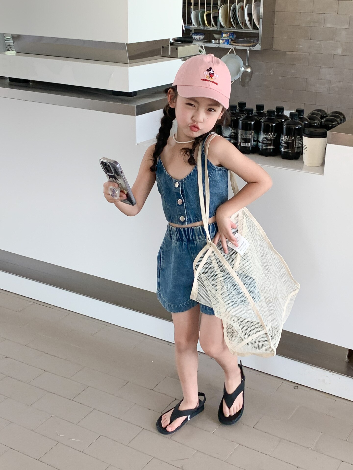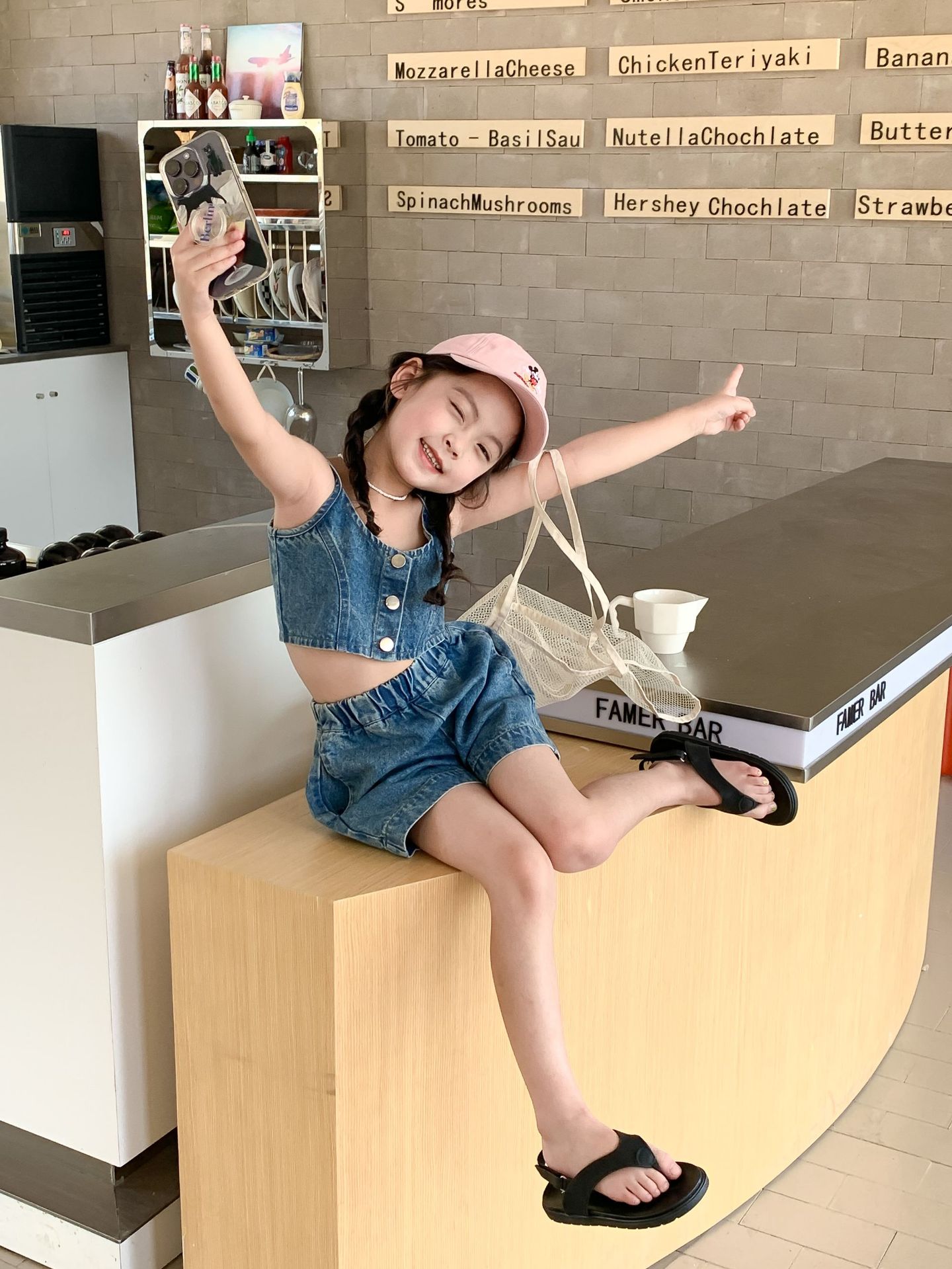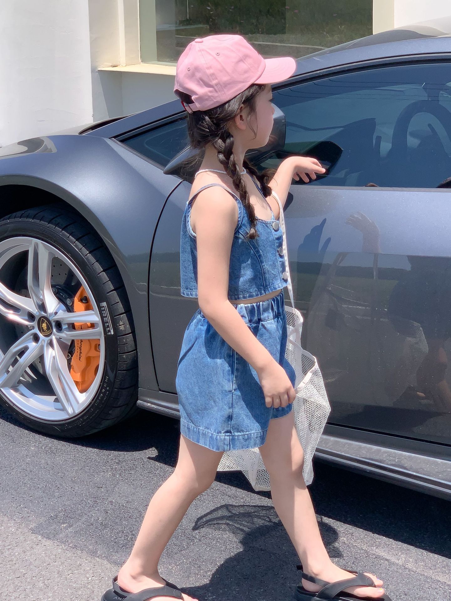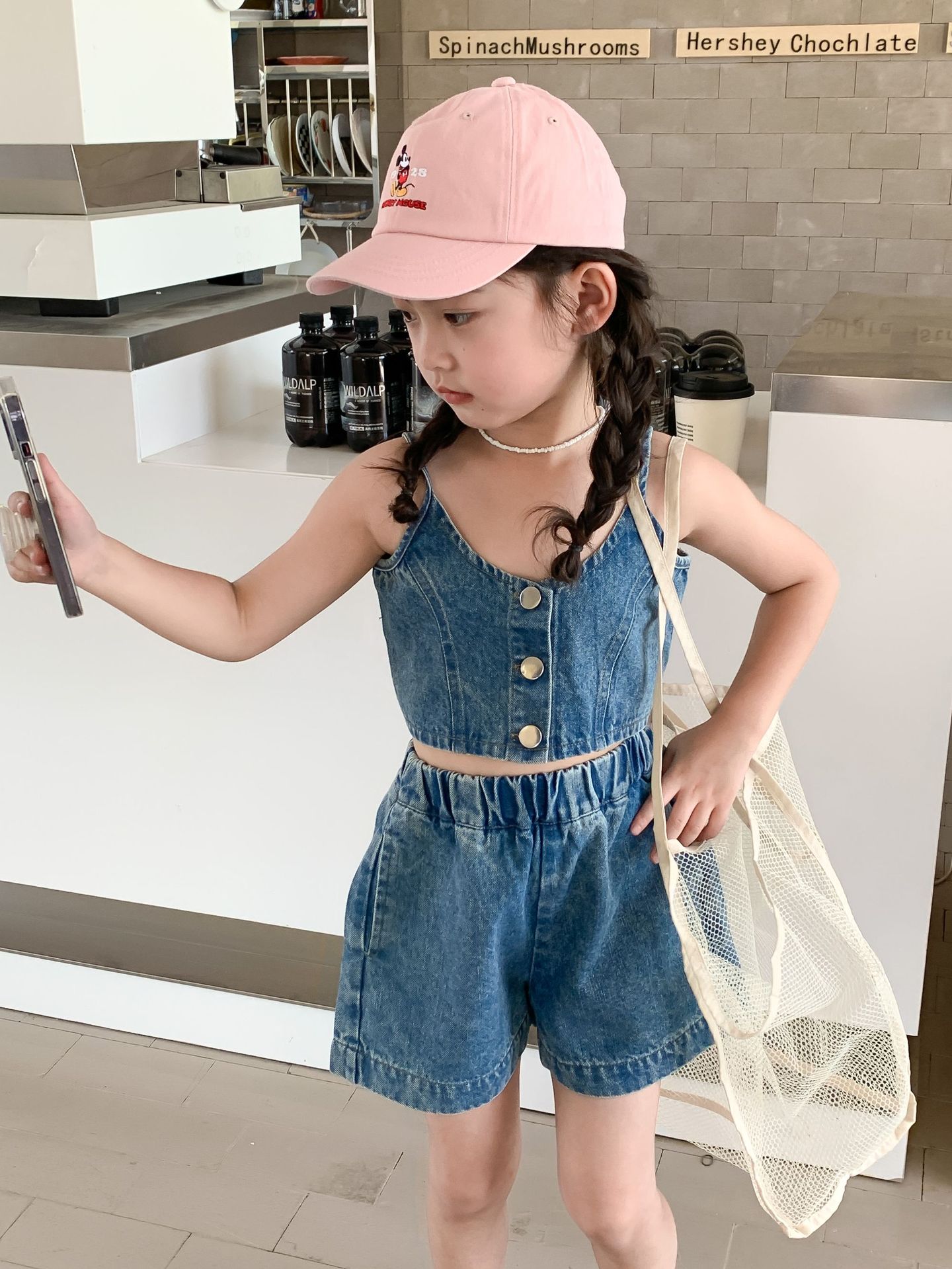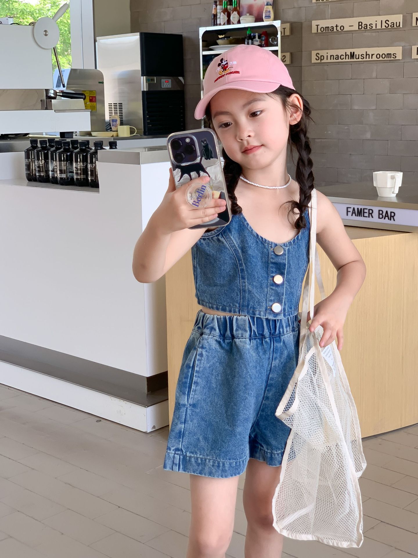 Детская одежда, костюм для девочек в Корейском стиле, лето 2023, модный джинсовый жилет на бретелях и шорты в Корейском стиле, комплект из двух предметов