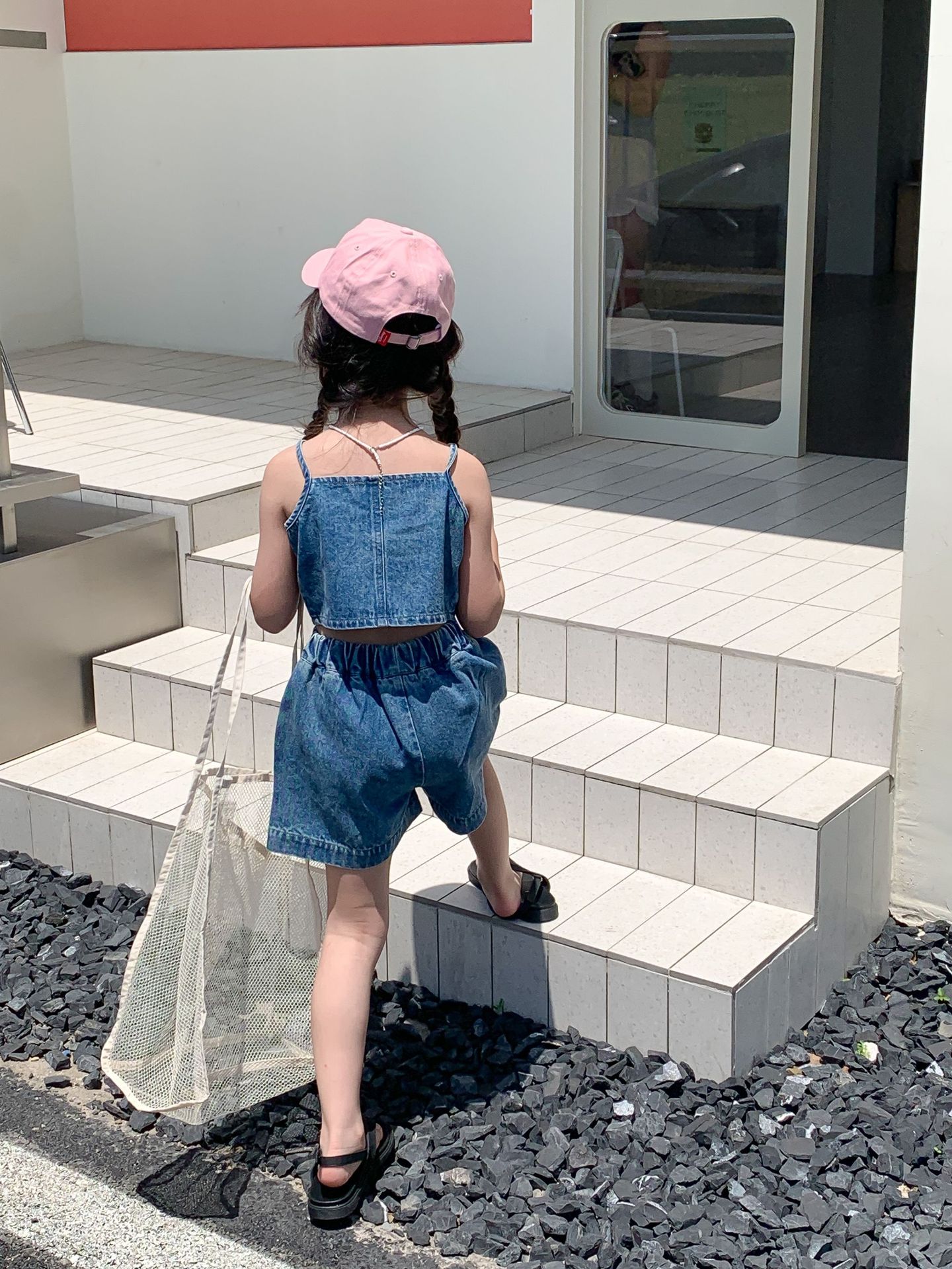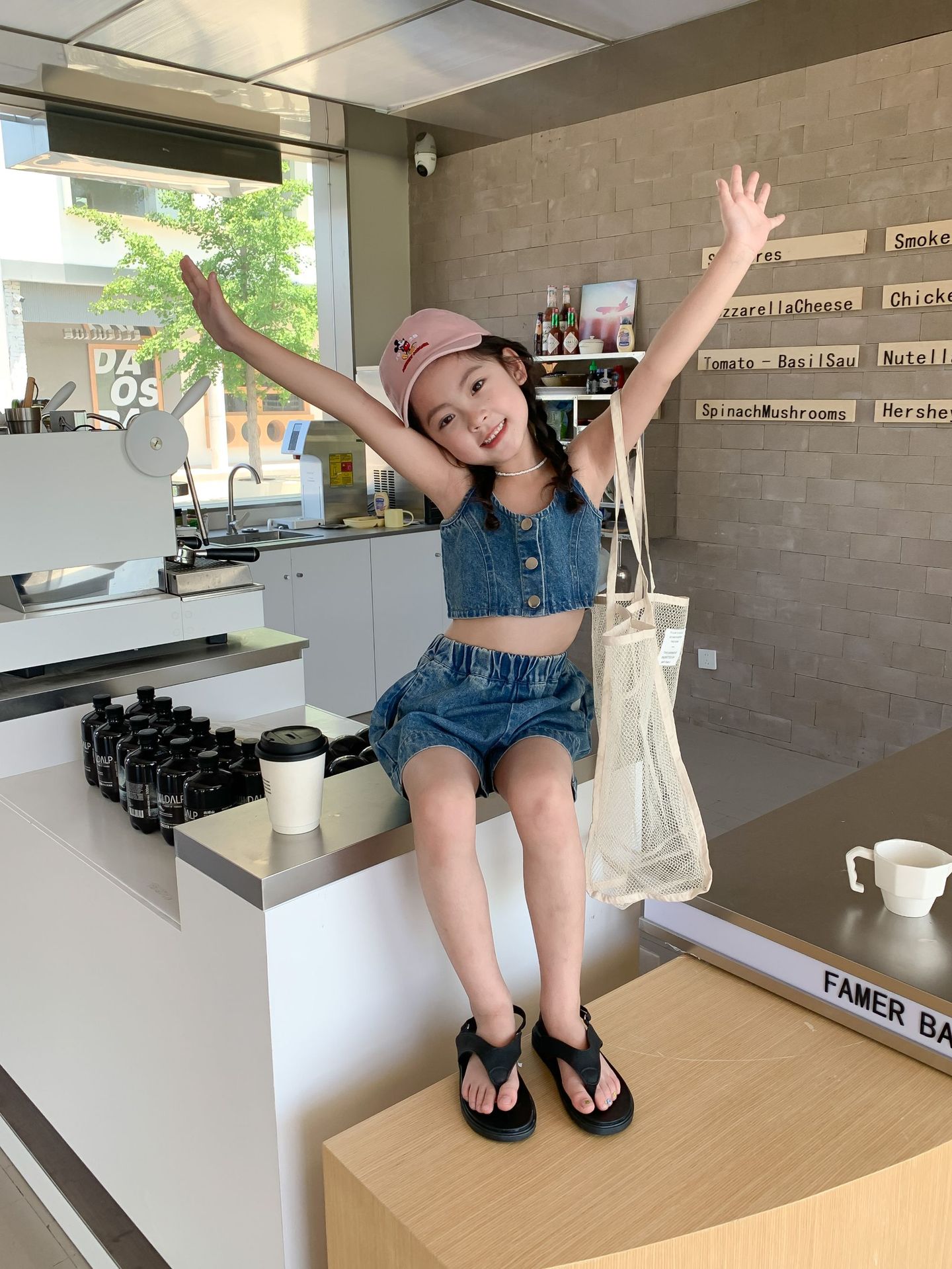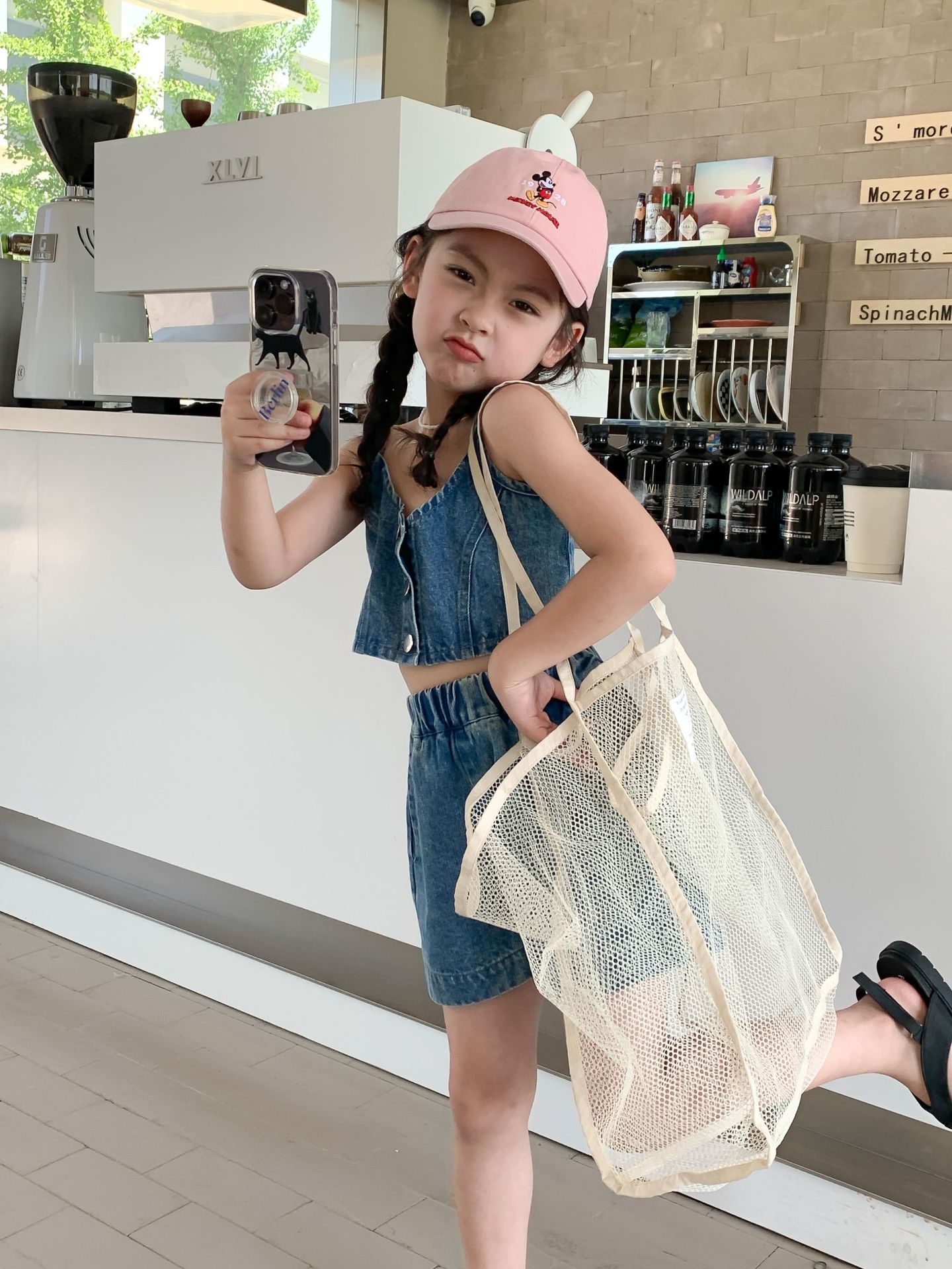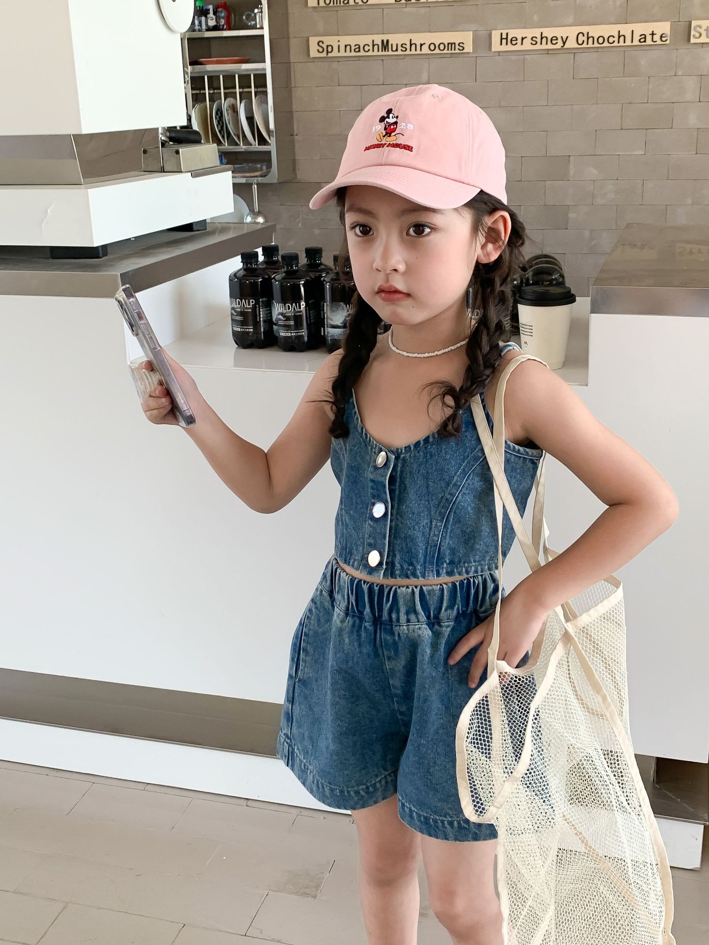 Детская одежда, костюм для девочек в Корейском стиле, лето 2023, модный джинсовый жилет на бретелях и шорты в Корейском стиле, комплект из двух предметов