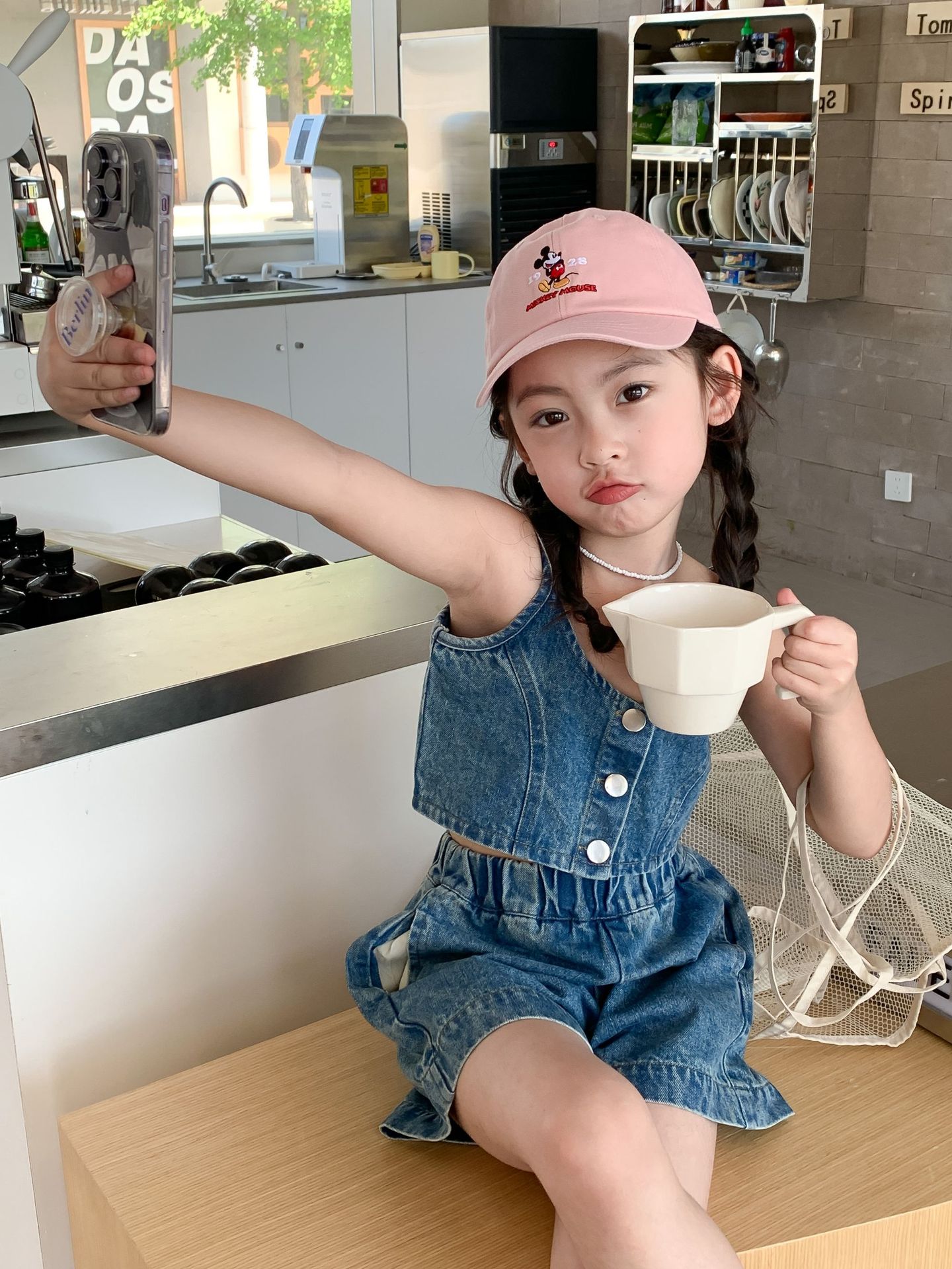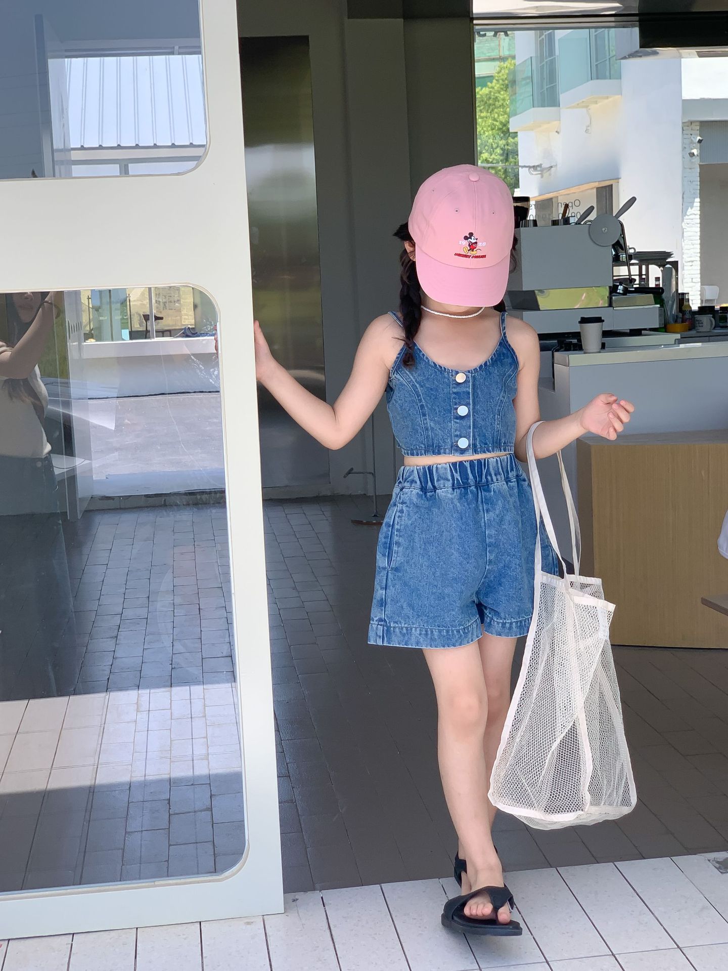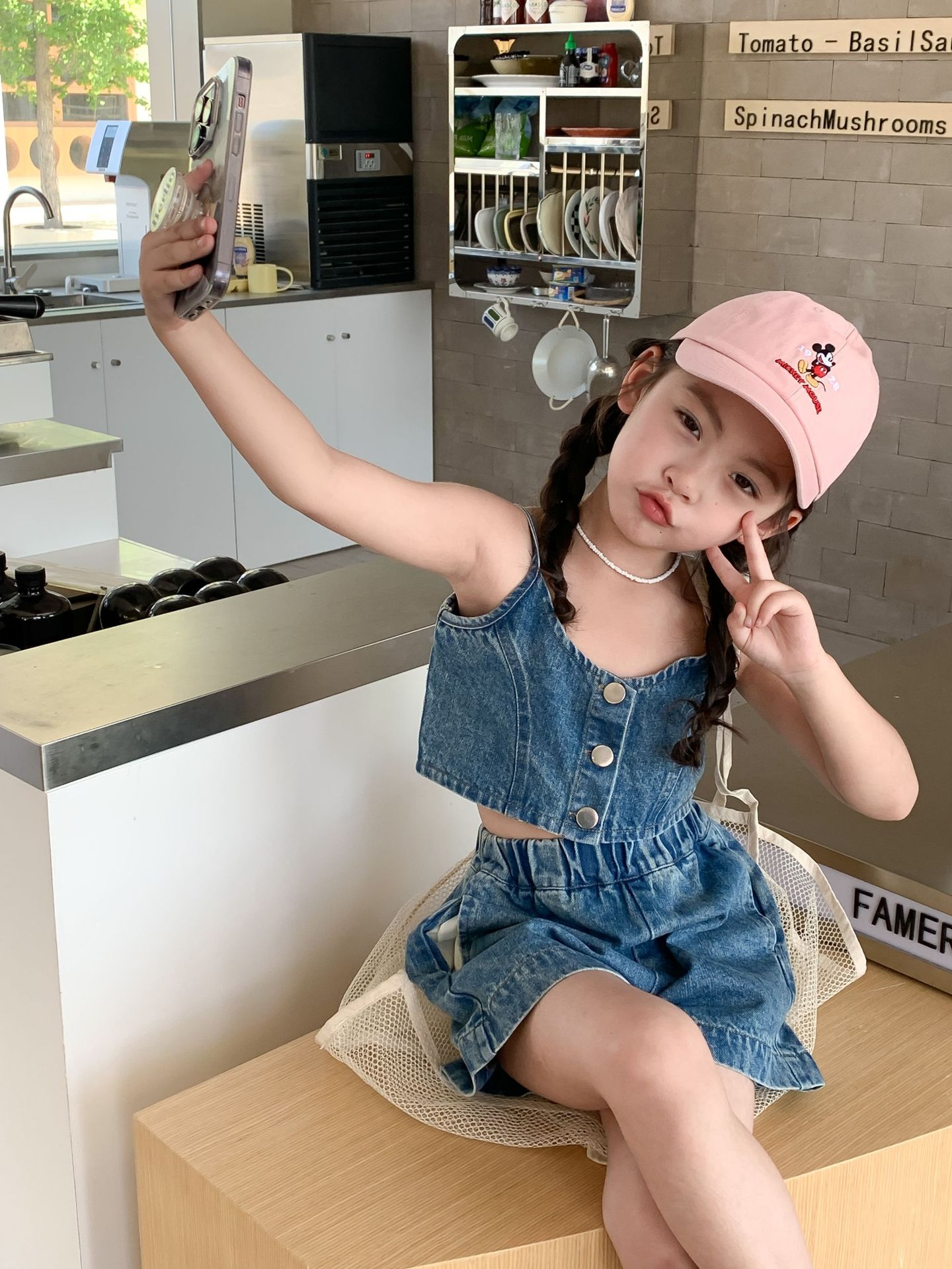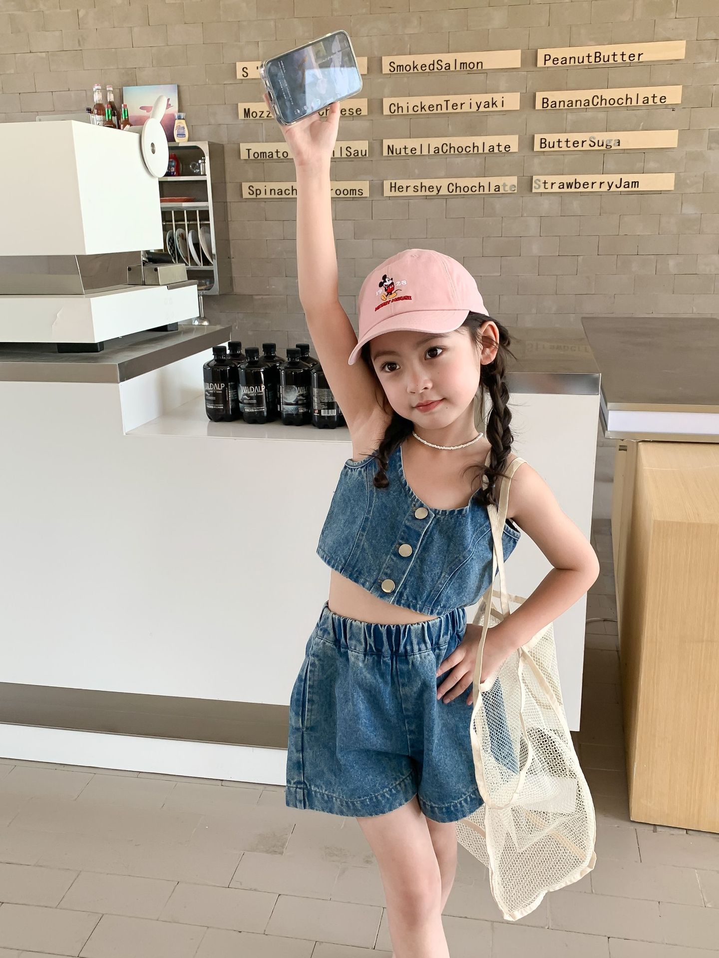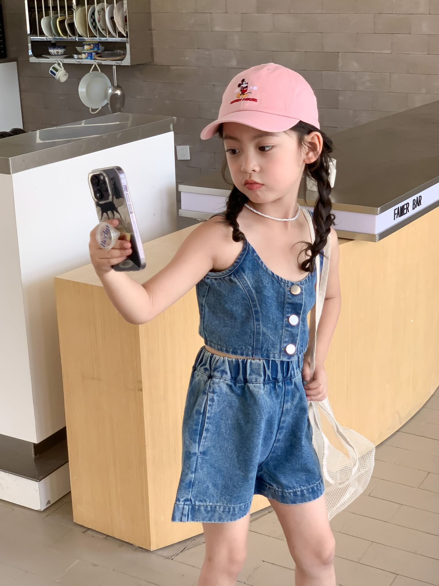 Детская одежда, костюм для девочек в Корейском стиле, лето 2023, модный джинсовый жилет на бретелях и шорты в Корейском стиле, комплект из двух предметов