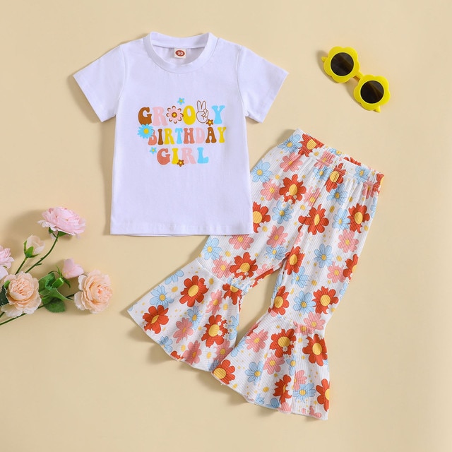 Малыши девочки с короткими рукавами и буквами футболки топы с цветочным принтом расклешенные брюки Детские наряды