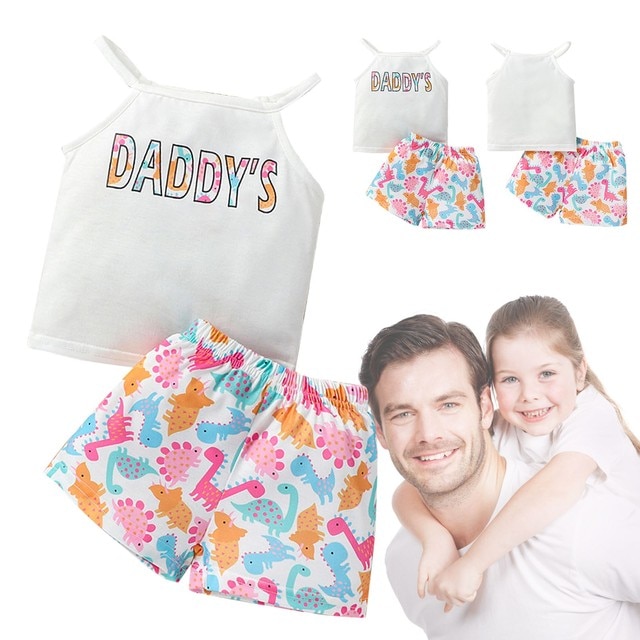 Костюм для маленьких девочек Топ без рукавов Брюки с динозаврами Буквы на подтяжках Многоцветный набор из двух предметов с принтом динозавров для девочек