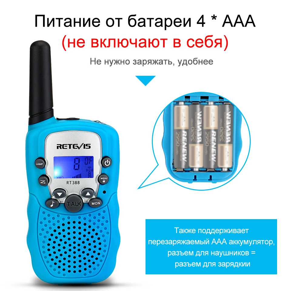Каждая рация работает от 4 батареек AAA (не входят в комплект), и вы можете использовать 4 перезаряжаемых аккумулятора AAA (не входят в комплект).