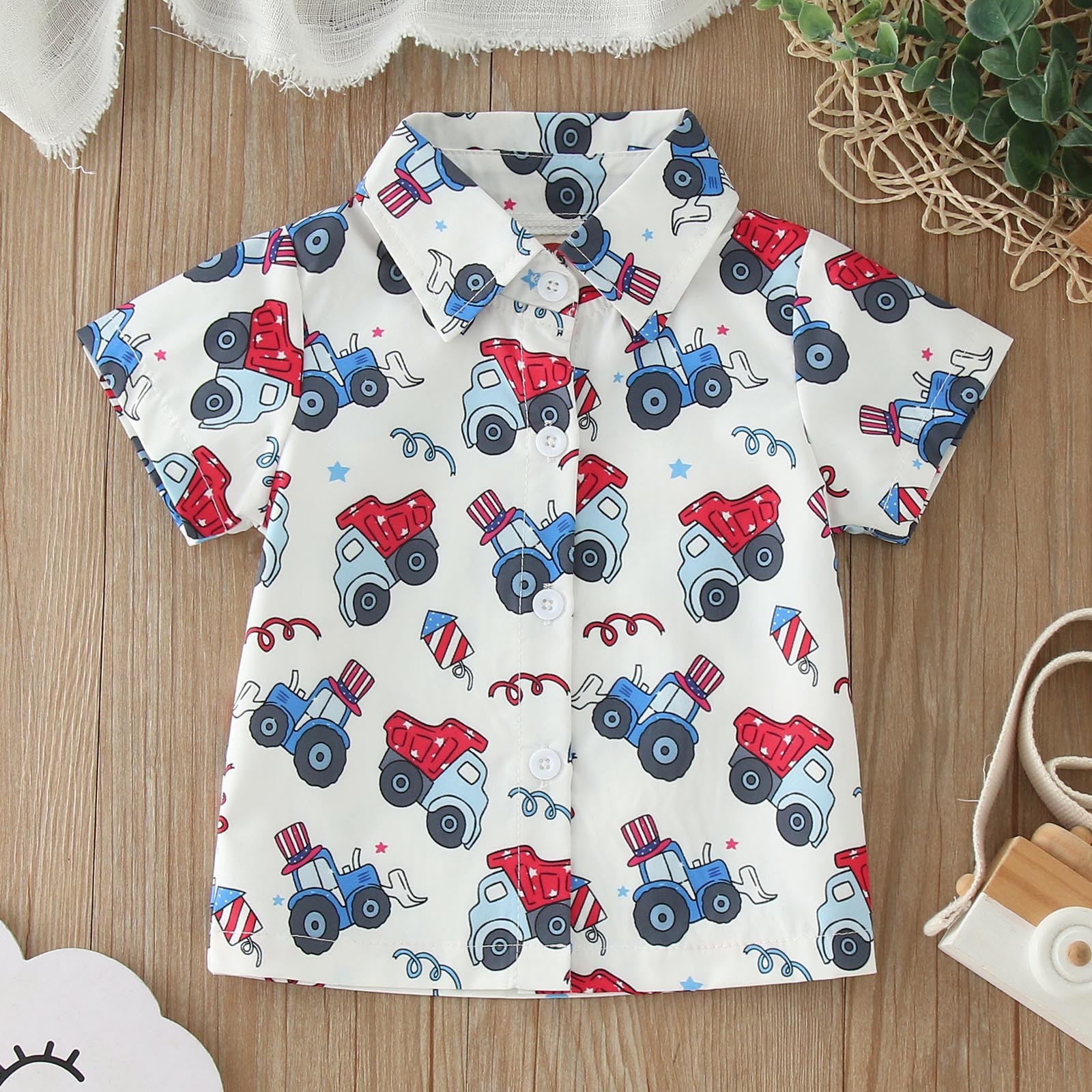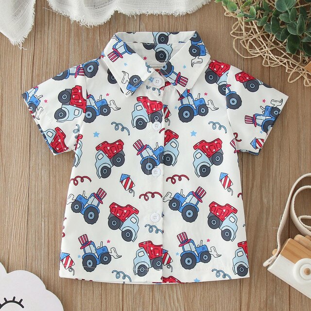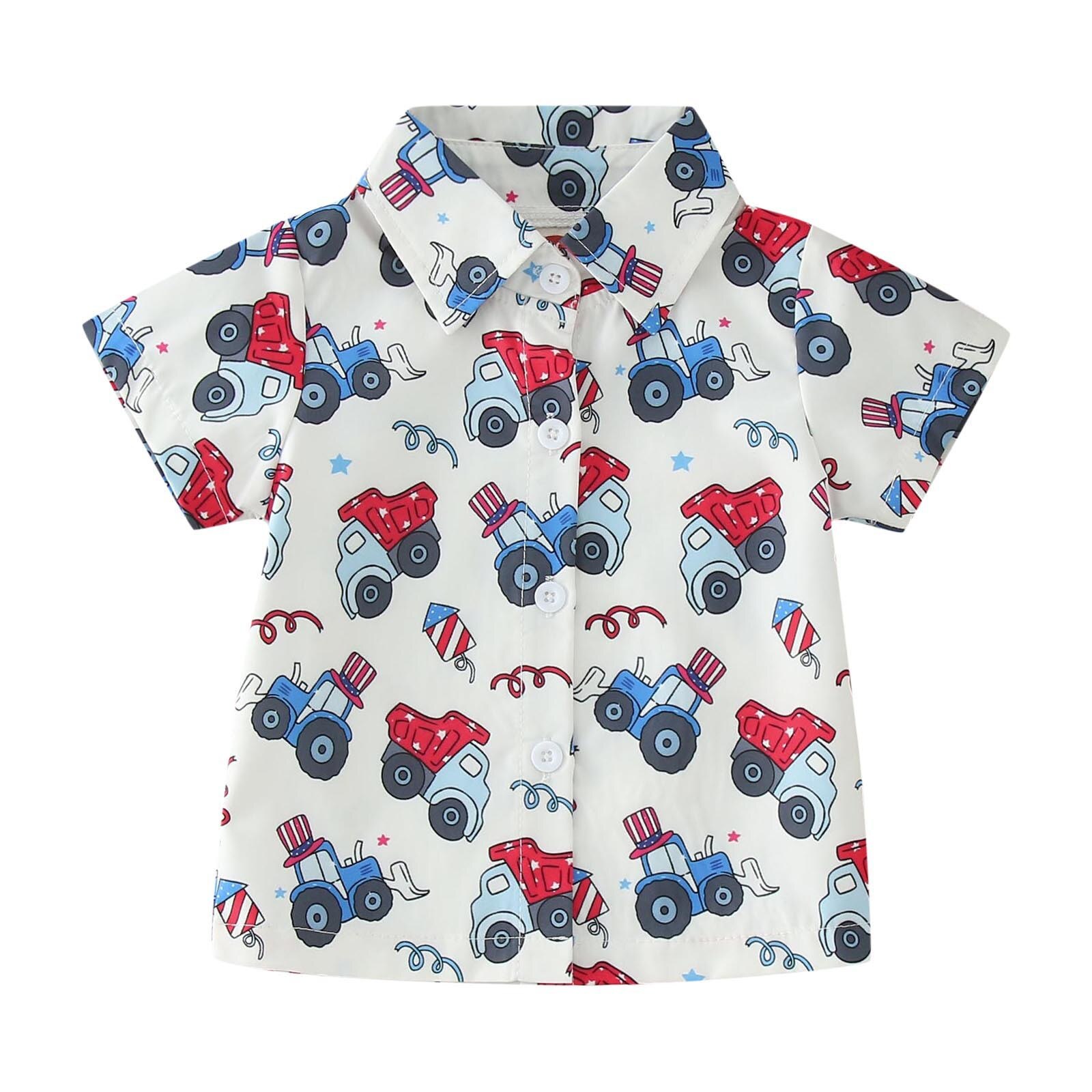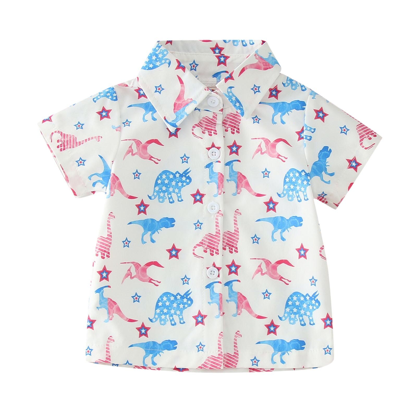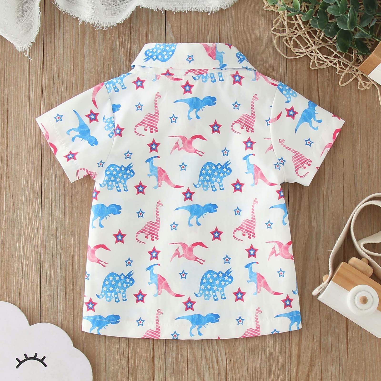 Детская рубашка для малышей с мультяшным принтом Кнопка с коротким рукавом Мультфильм динозавр Автомобильный принт для мальчиков и девочек Рубашка Топы Верхняя одежда
