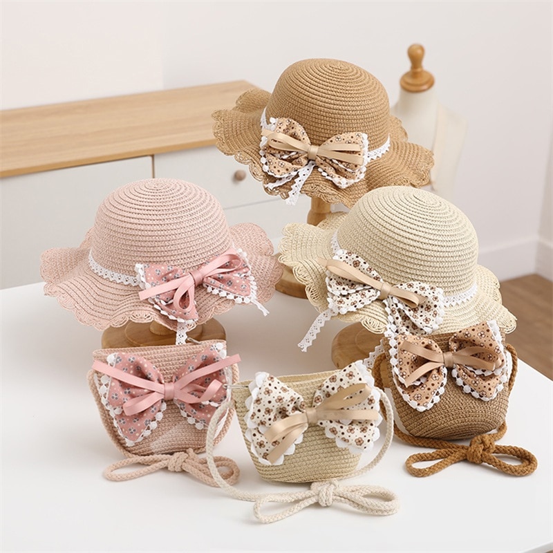 Детская соломенная шляпа с бантиком для девочек, летняя широкая бант края, пляжные солнцезащитные кепки и сумка на плечо для малышей
