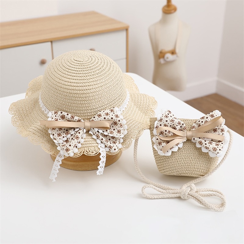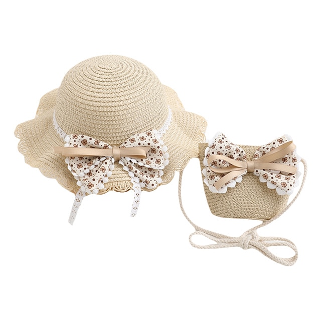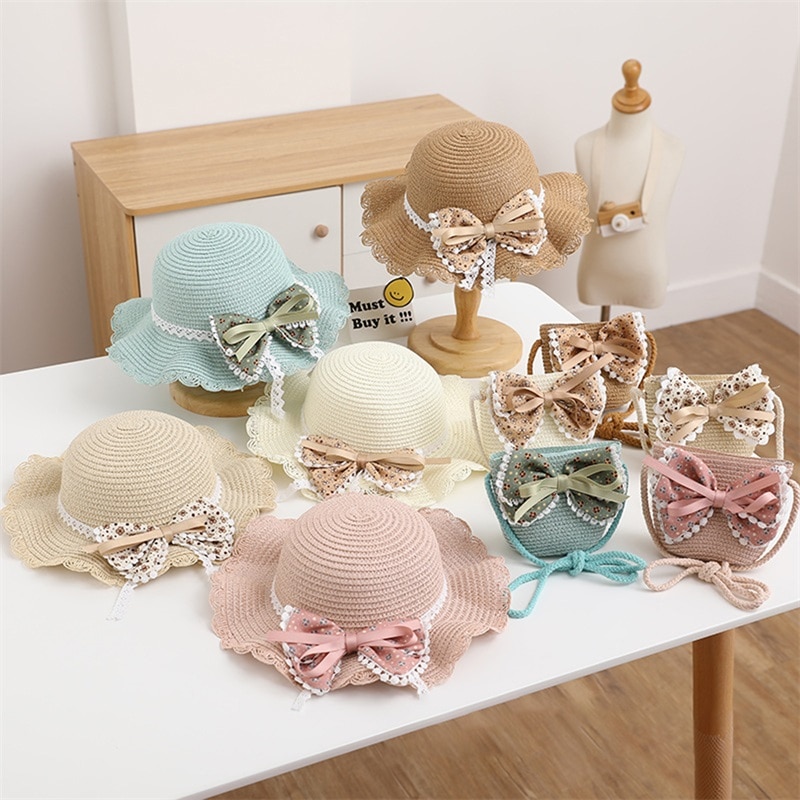 Bowknot украшения, соломенная сумка через плечо и детская соломенная шляпа котелок, летняя шляпа с широкими полями может защитить ваше лицо, уши и шею от солнца, модная и элегантная, очень подходящая для девочек.