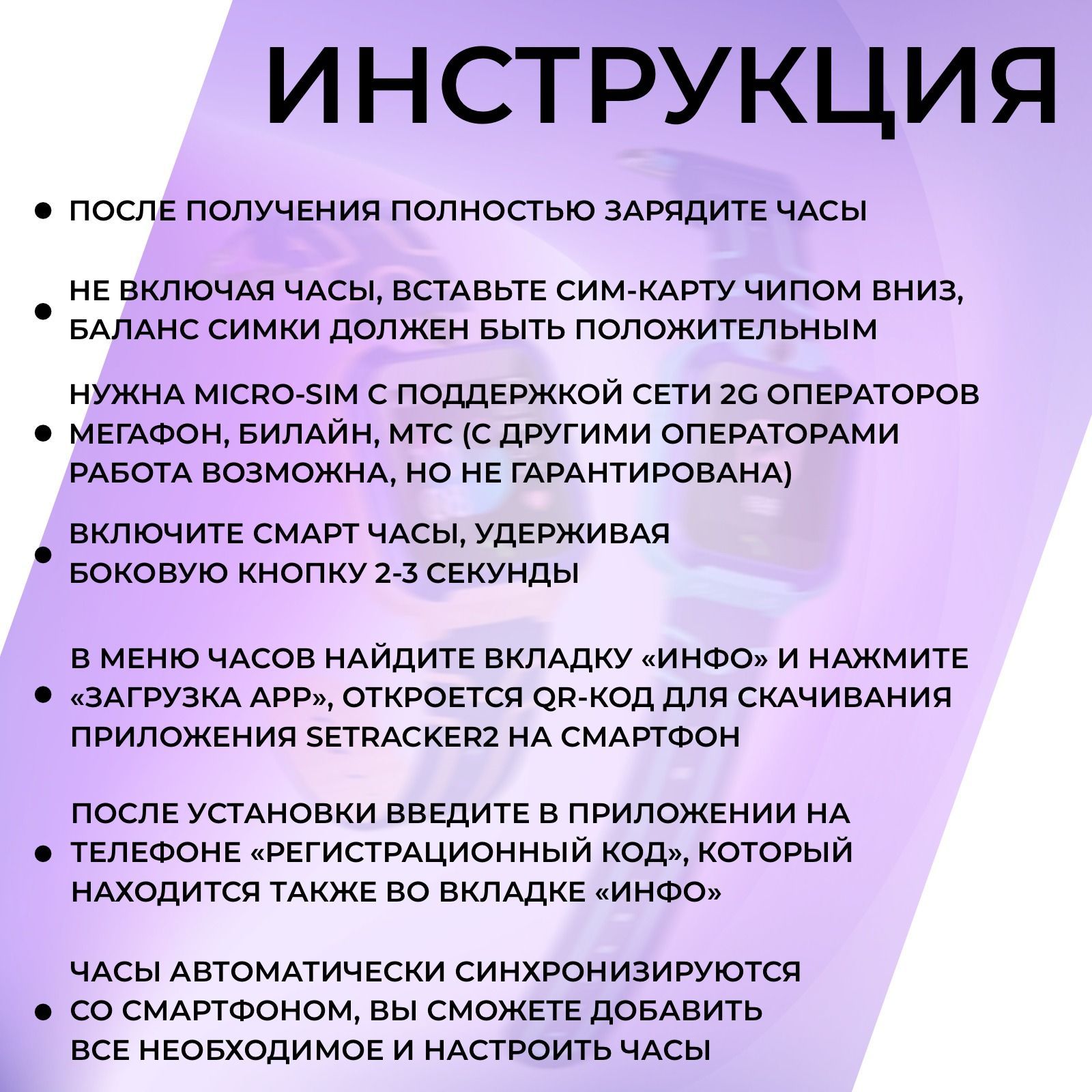 Описание: Инструкция по регистрации смарт-часов:1. Вставьте сим-карту для активации в смартфон;