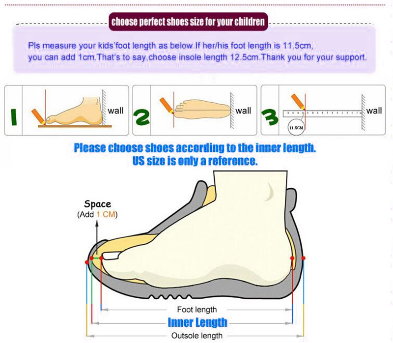 При выборе обуви выбирайте внутреннюю длину в соответствии с длиной маленьких ножек ребенка, рекомендуется выбирать длину на 0,5-1 см меньше длины стопы.