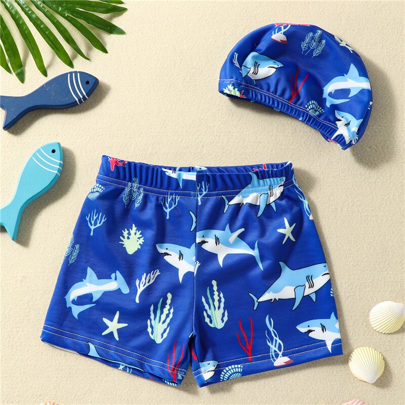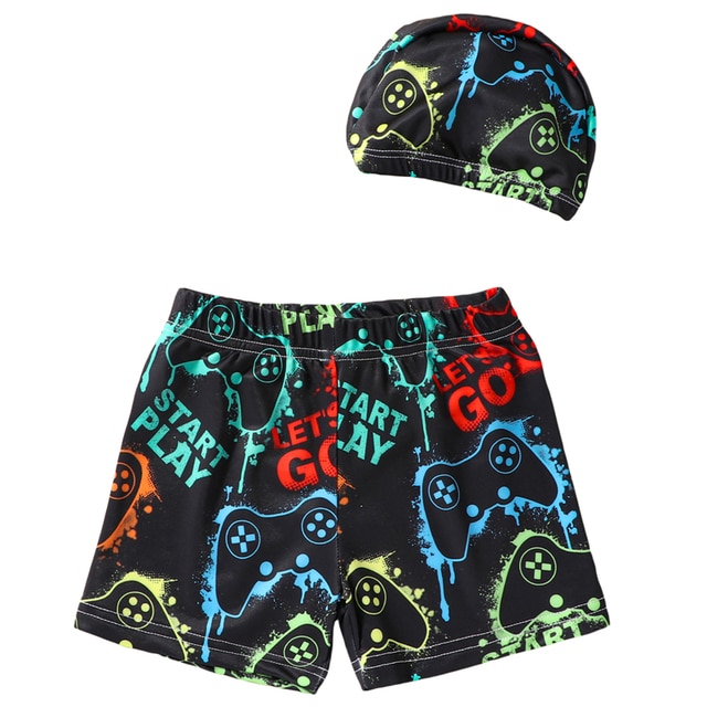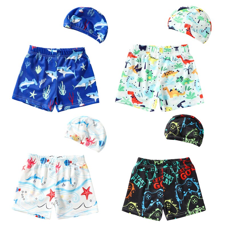 Детские плавательные шорты для мальчиков, плавки с принтом акулы/динозавра/морской звезды/геймпада, купальный костюм с шапочкой для плавания