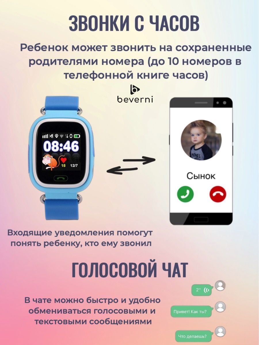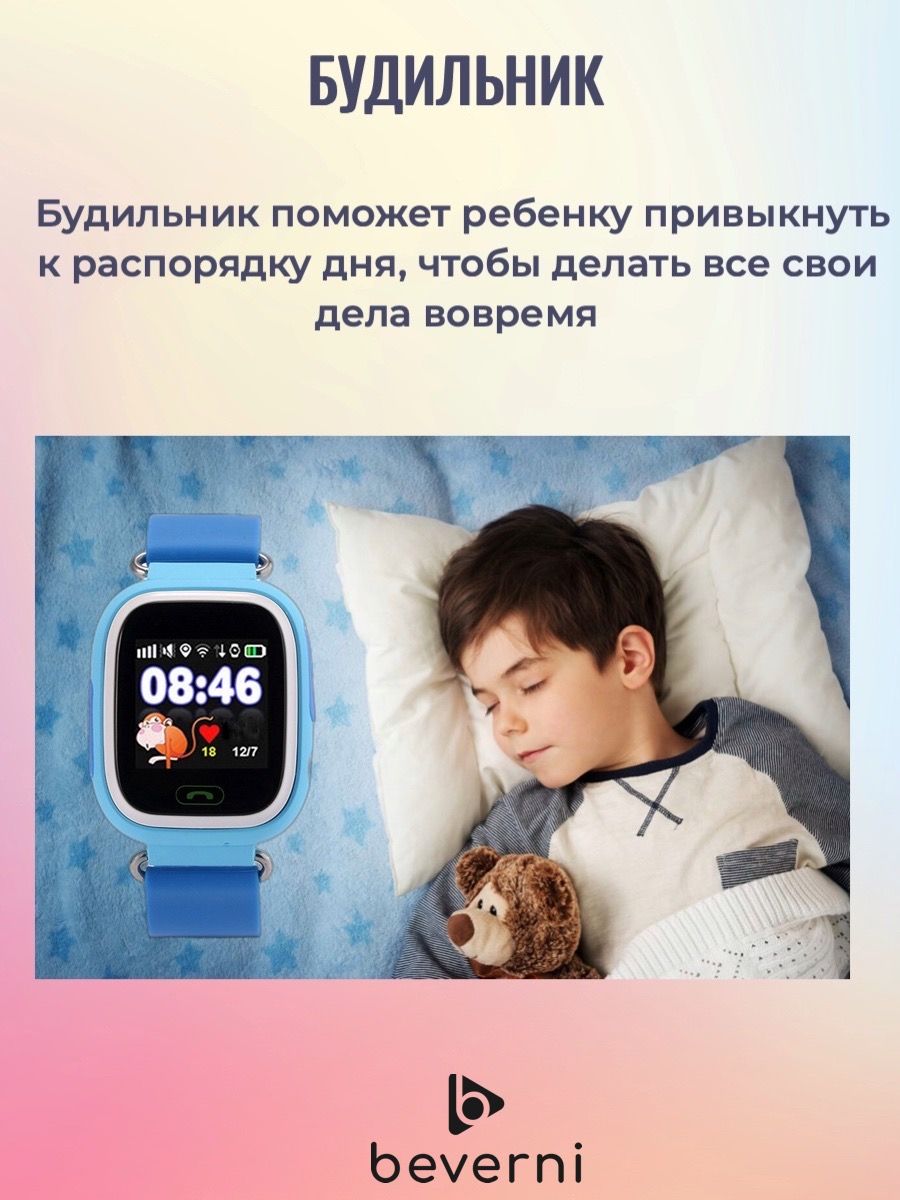 Датчик снятия зафиксирует, если малыш снимет часы. И на телефон родителей поступит уведомление.Будьте в курсе, где находится ваш ребенокВ мобильном приложении на карте вы всегда сможете отслеживать геопозицию ребенка, просматривать маршрут передвижения, а также устанавливать допустимую область, в случае пересечения которой придет уведомление из приложения. Точность геопозиции, особенно в помещении, обеспечивается наличием GPS-трекера, встроенного WI-Fi модуля, GSM и LBS.Поддерживайте постоянную связь с ребенком В любой момент вы сможете отправлять голосовые и текстовые сообщения на часы ребенку, а он отвечать вам с помощью голосовых сообщений. Или же использовать часы как телефон (вызов осуществляется на разрешенные родителями номера). Используйте часы для быстрой связи в экстренных случаях В часах встроена кнопка SOS, нажав на которую, ребенок сможет быстро совершить экстренный вызов на номера, добавленные взрослыми в приложении. Управляйте часами из приложения В приложении доступно полноценное управление часами: установка будильника, добавление телефонных номеров, удаленное выключение, поиск часов при потере, установка геозоны, режим “не беспокоить” и многое другое. Прослушивание окружающей обстановки В приложении есть возможность совершать обратный звонок, о котором малыш не будет знать, и прослушивать окружающие ребенка звуки. Использование качественных материаловРемешок часов выполнен из гипоаллергенного материала, что обеспечивает удобство при ежедневном использовании. Корпус браслета выполнен из крепкого и качественного пластика. Экран часов сенсорный и яркий. АккумуляторИмеют самый энергоемкий аккумулятор из всех детских часов ГеопозицияОтображение наиболее точной геопозиции за счет встроенного Wi-Fi модуля, GPS-трекера, GSM и LBS.ПростотаQ90 имеют интуитивно понятное меню на русском языке Многофункциональность Часы не перегружены посторонними приложениями, отвлекающими малыша, но при этом не оставят его равнодушным. Родителям же доступно множество полезных функций в приложении.ЭкранЦветной сенсорный дисплей диагональю 1.22"Не беспокоитьПолезная функция, если вы не хотите, чтобы часы мешали ребенку или отвлекали его от занятийЗвукЧасы имеют встроенный микрофон и динамик SIM-картаТим поддерживаемой SIM-карты - micro SIM